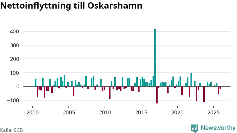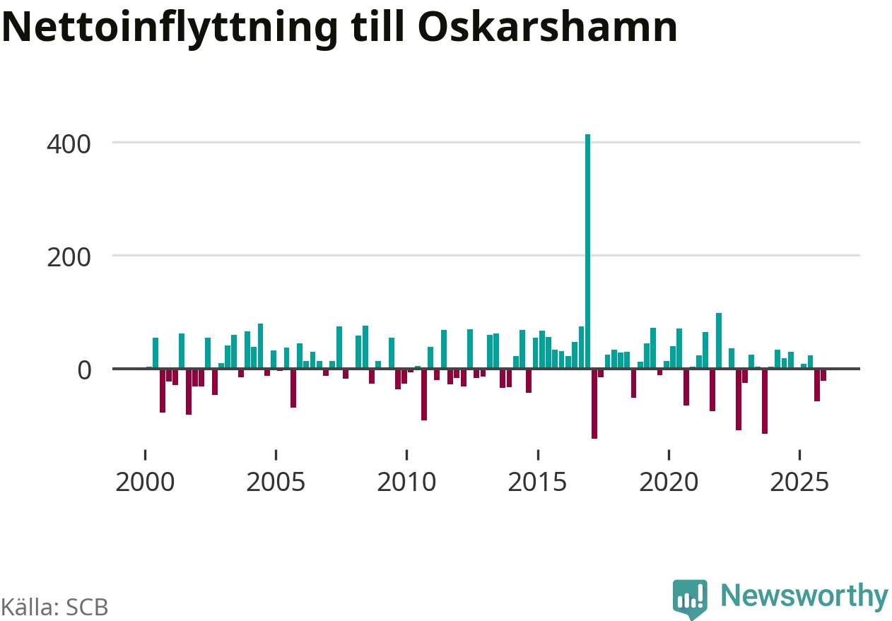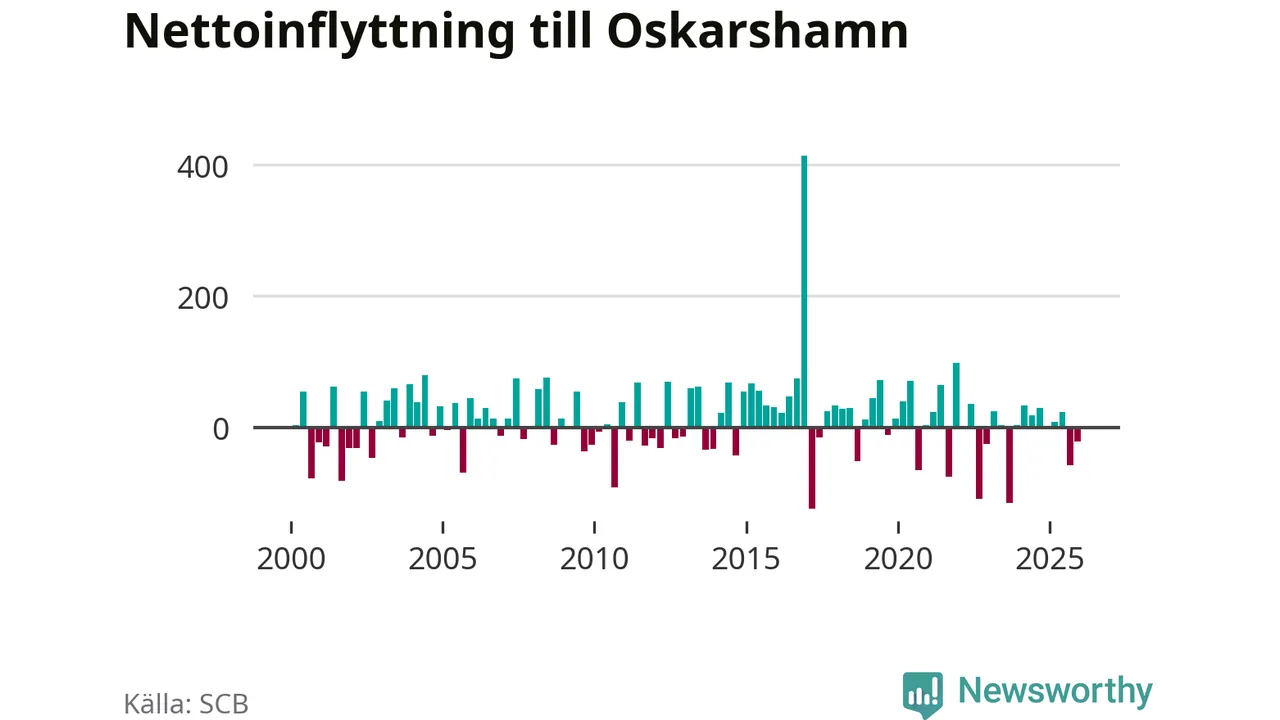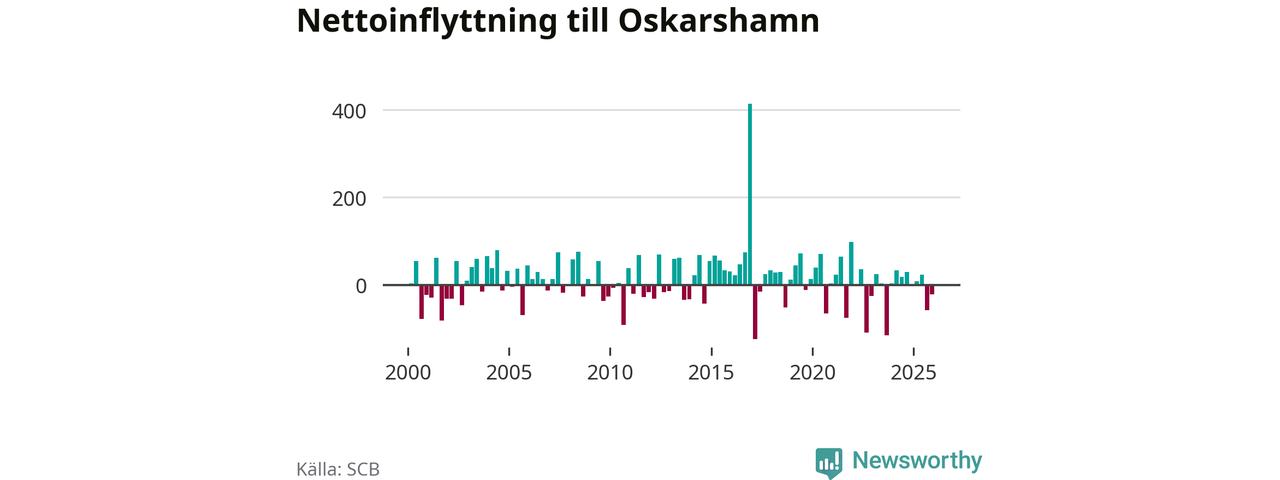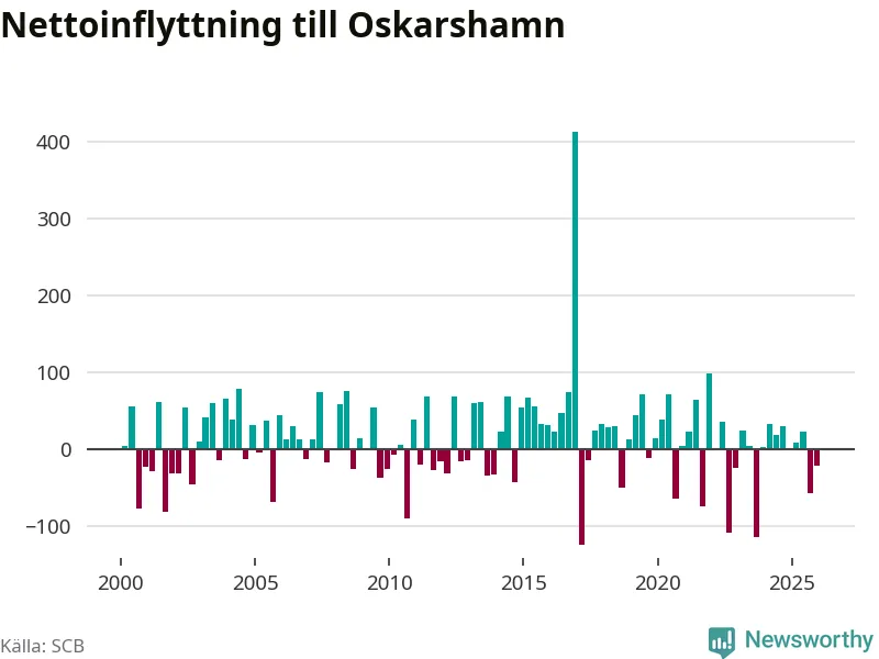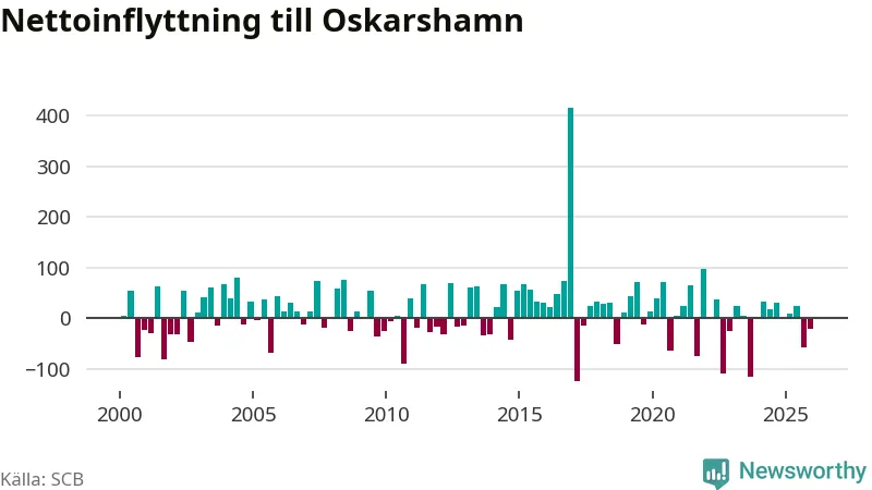 Under fjärde kvartalet 2025 flyttade 218 personer till kommunen medan 239 personer flyttade därifrån. Sedan seklets början har Oskarshamn oftast haft ett positivt flyttnetto.