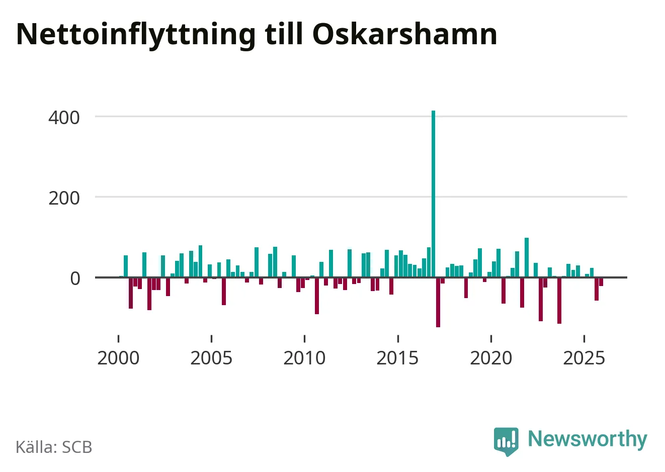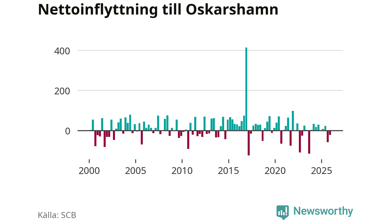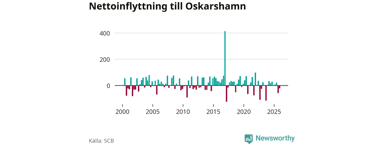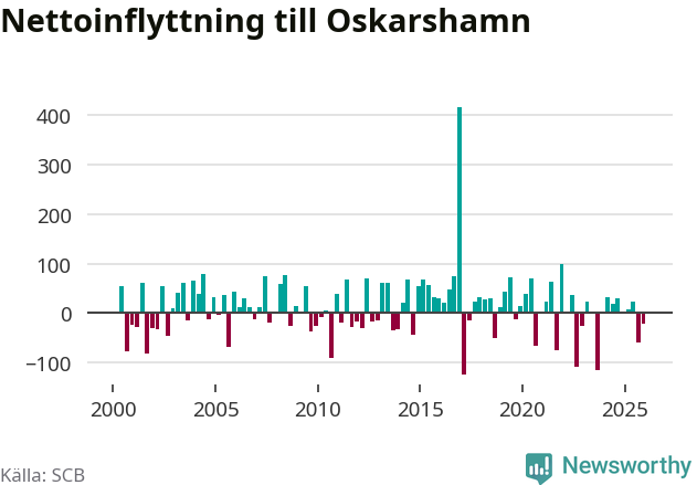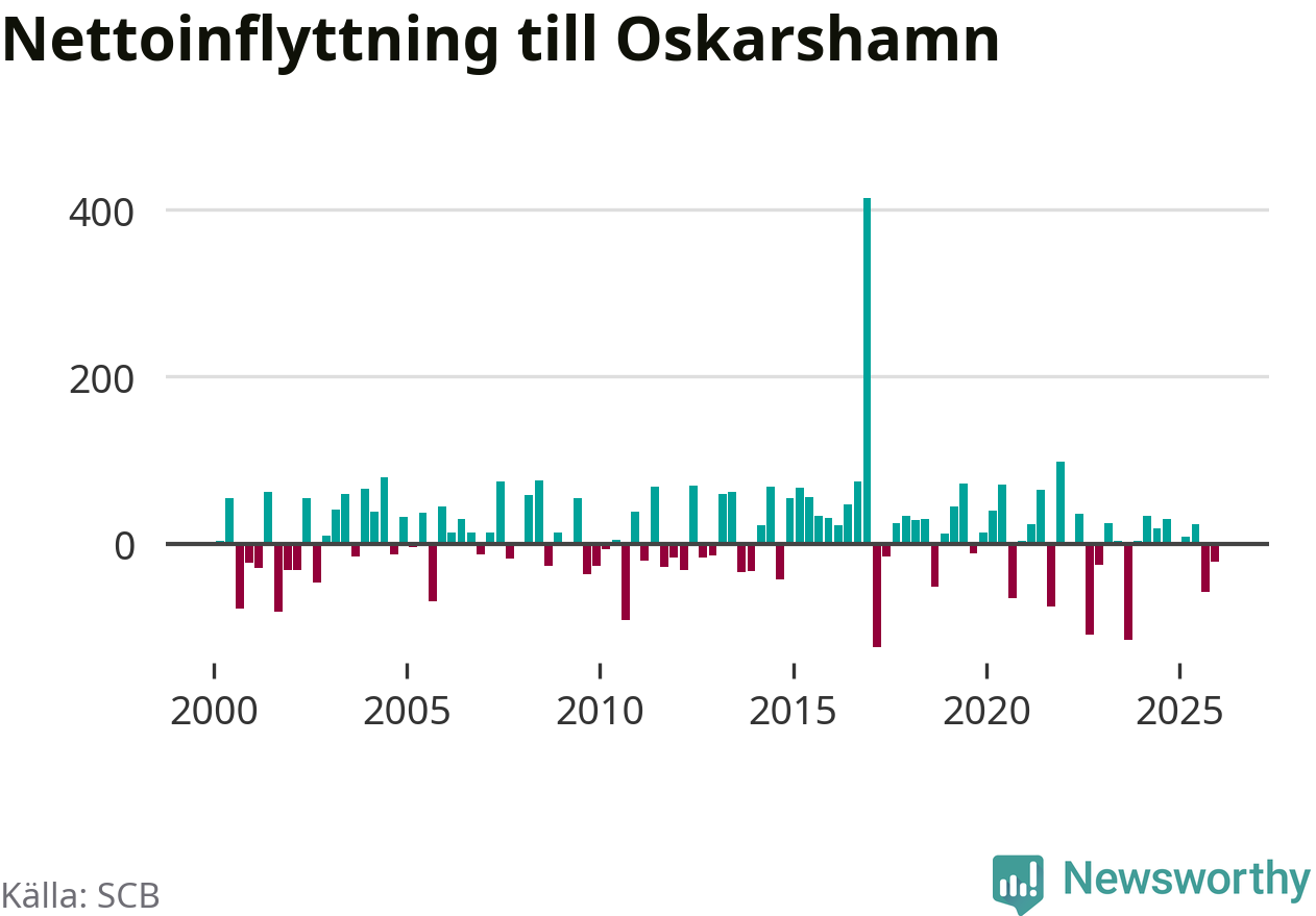 Under fjärde kvartalet 2025 flyttade 218 personer till kommunen medan 239 personer flyttade därifrån. Sedan seklets början har Oskarshamn oftast haft ett positivt flyttnetto.