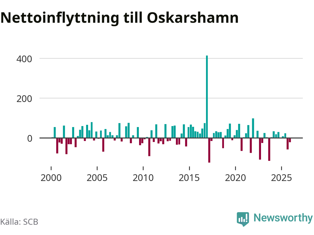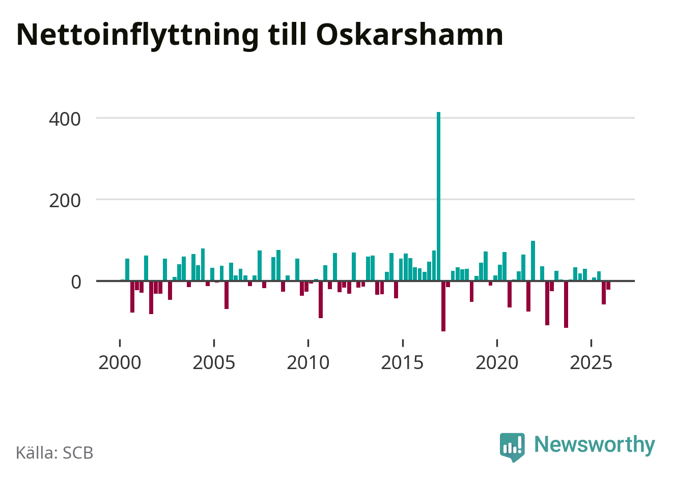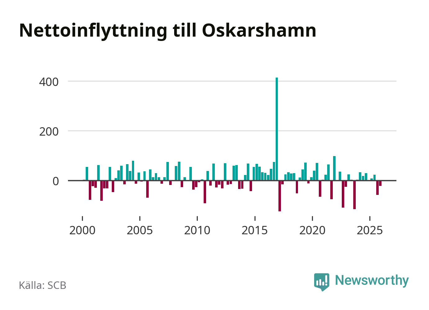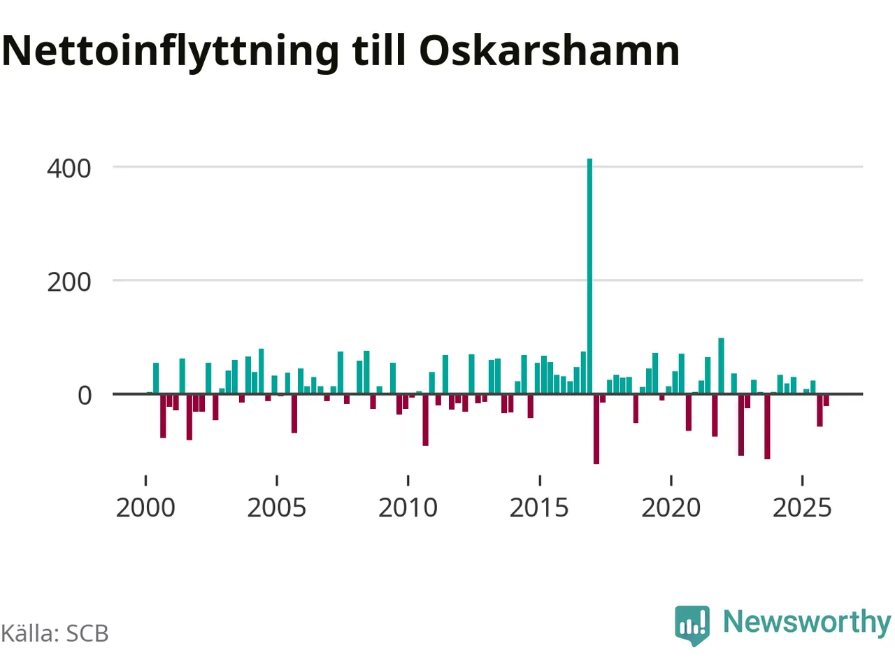 Under fjärde kvartalet 2025 flyttade 218 personer till kommunen medan 239 personer flyttade därifrån. Sedan seklets början har Oskarshamn oftast haft ett positivt flyttnetto.