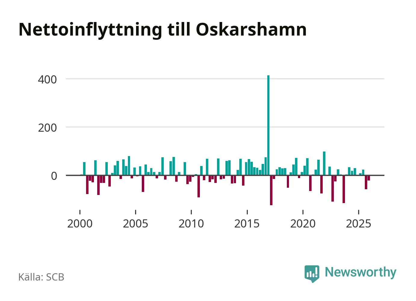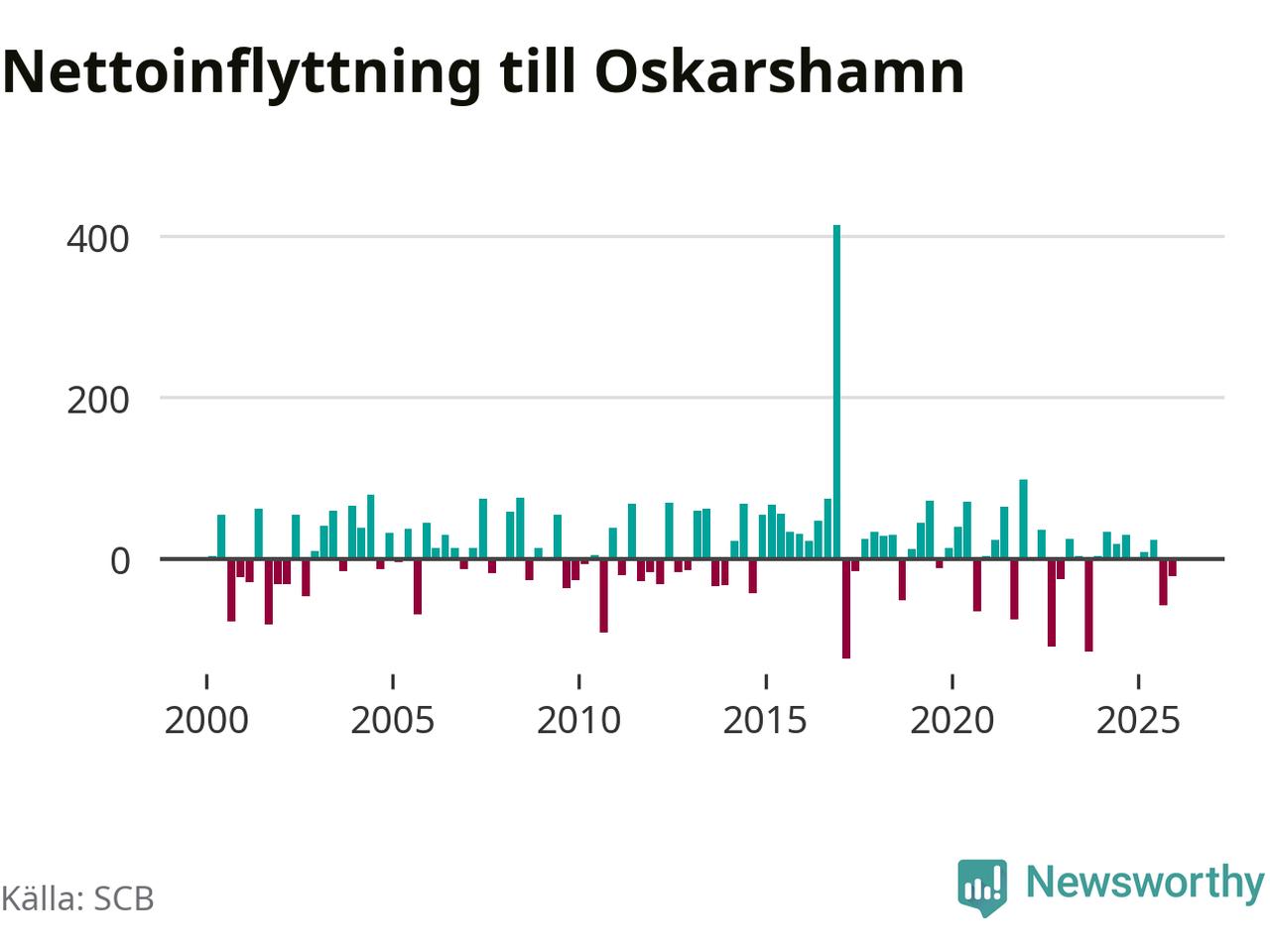 Sedan millennieskiftet har befolkningen i Oskarshamn ökat lika ofta som den har minskat. Den största ökningen under ett enskilt kvartal noterades under fjärde kvartalet 2016, då befolkningen växte med 396 personer. Den största minskningen skedde första kvartalet 2017, då Oskarshamnsborna blev 133 färre.
