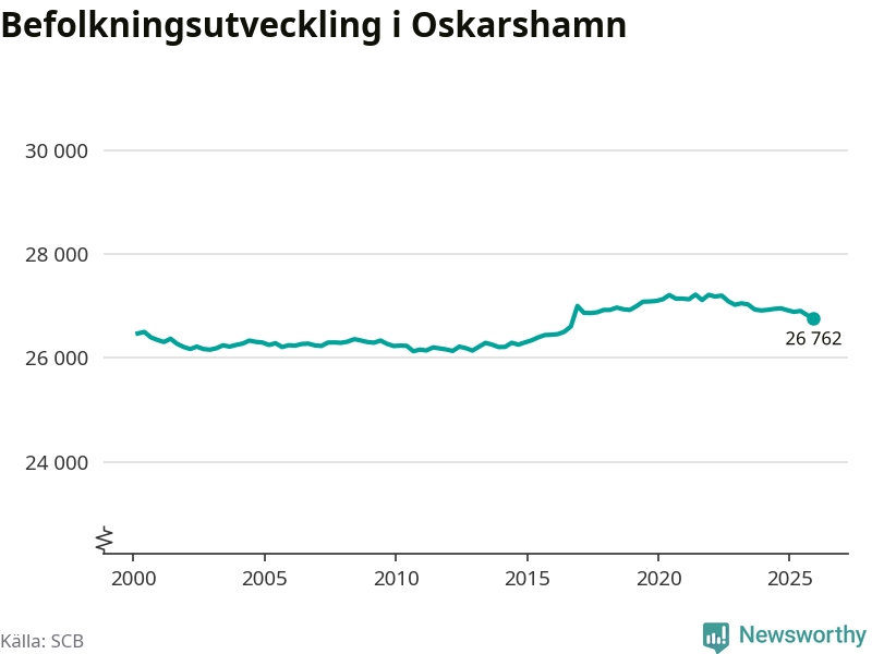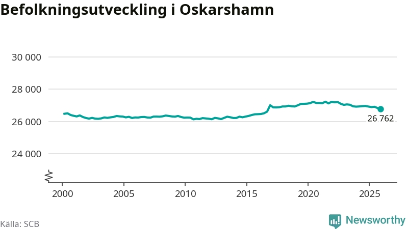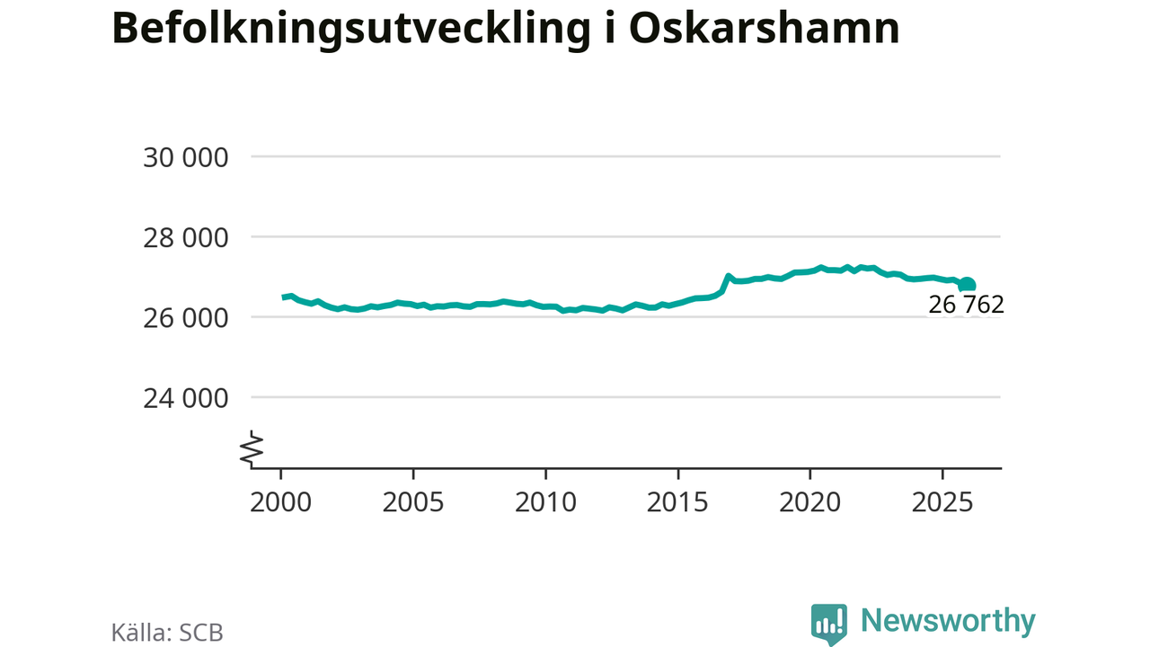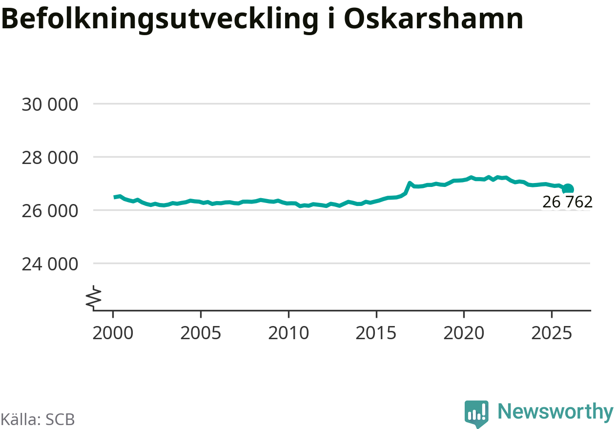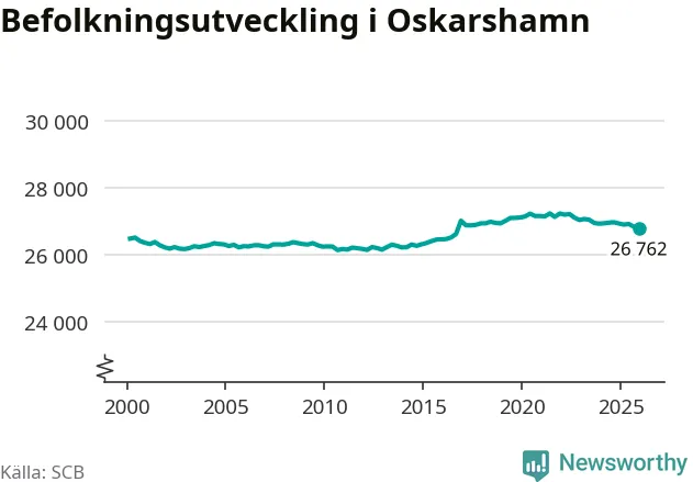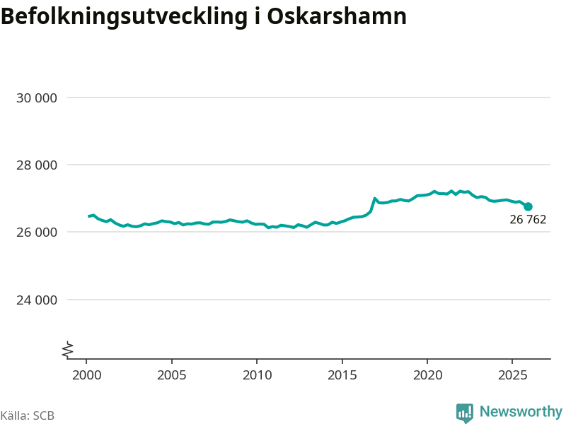 Jämfört med för ett år sedan har befolkningen i Oskarshamn minskat med ungefär 160 personer – vilket motsvarar en nedgång på 0,6 procent. Sedan millennieskiftet har folkmängden ökat med runt 290 personer, eller en procent.