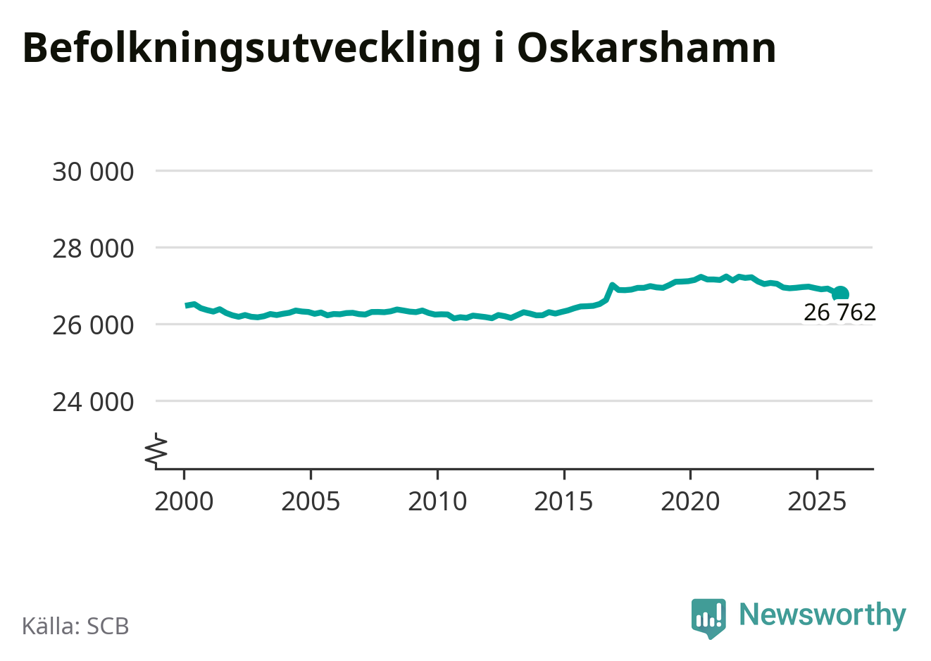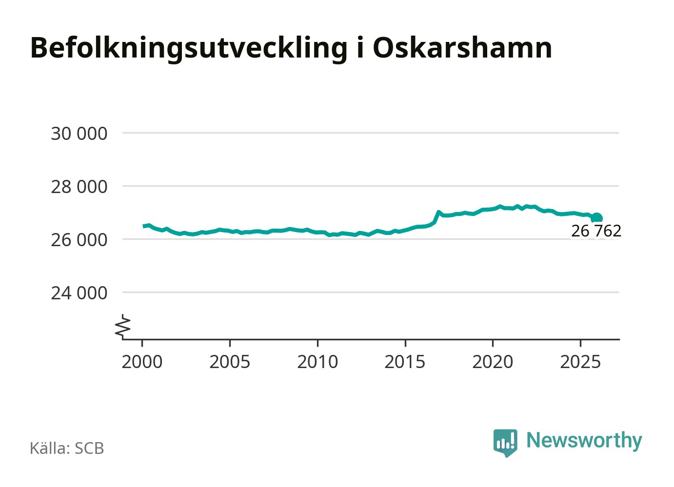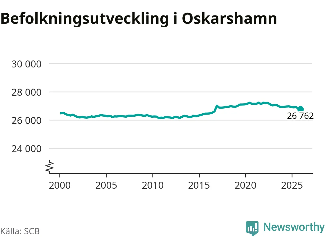 Jämfört med för ett år sedan har befolkningen i Oskarshamn minskat med ungefär 160 personer – vilket motsvarar en nedgång på 0,6 procent. Sedan millennieskiftet har folkmängden ökat med runt 290 personer, eller en procent.