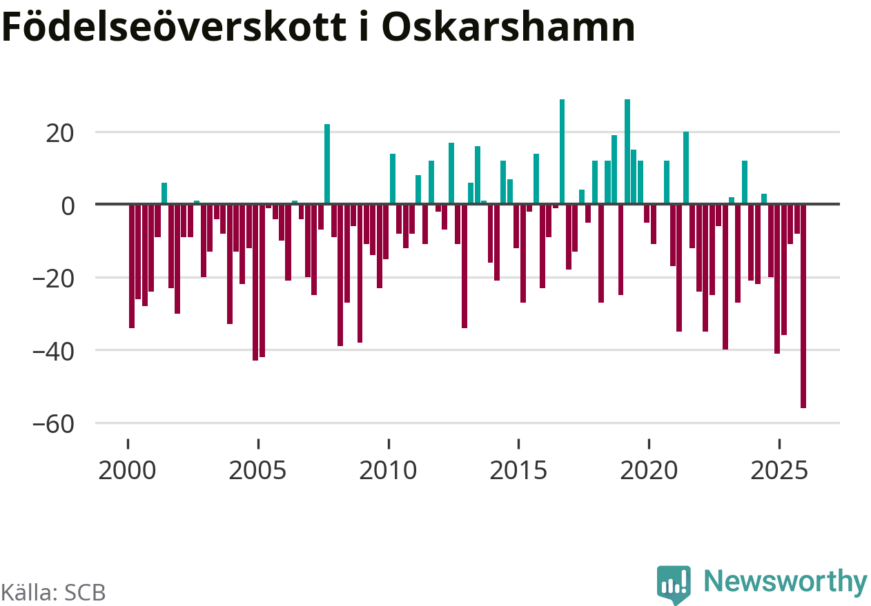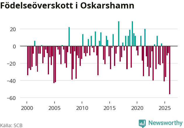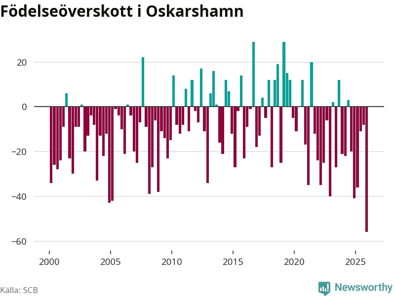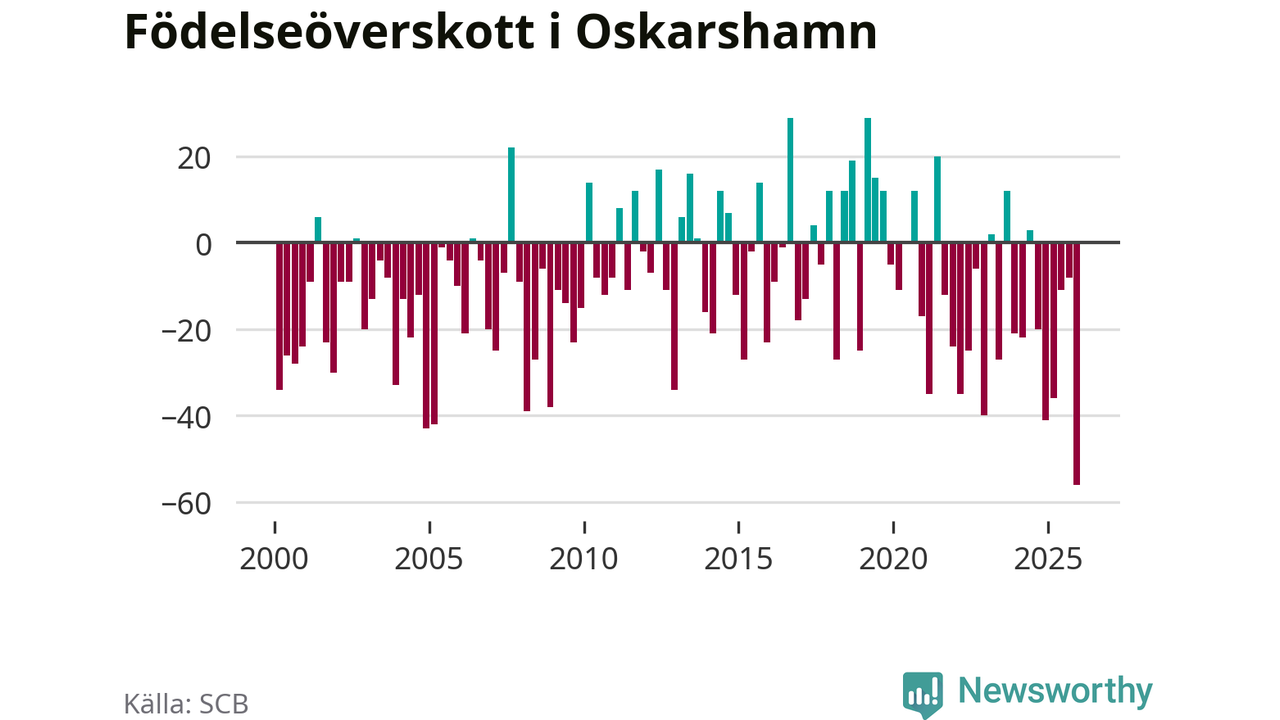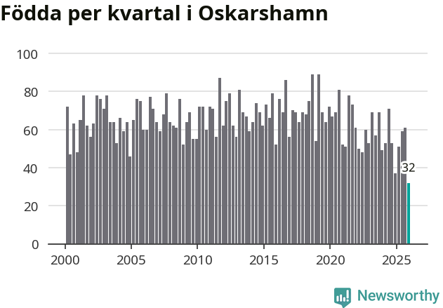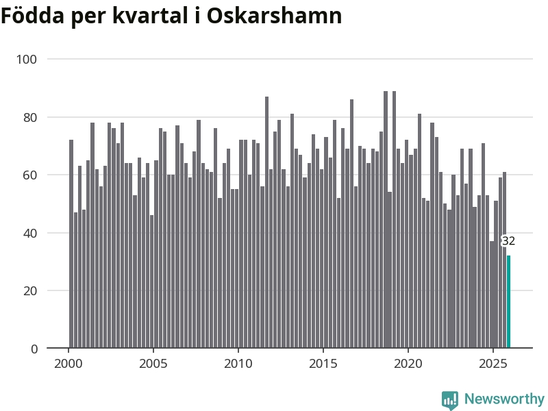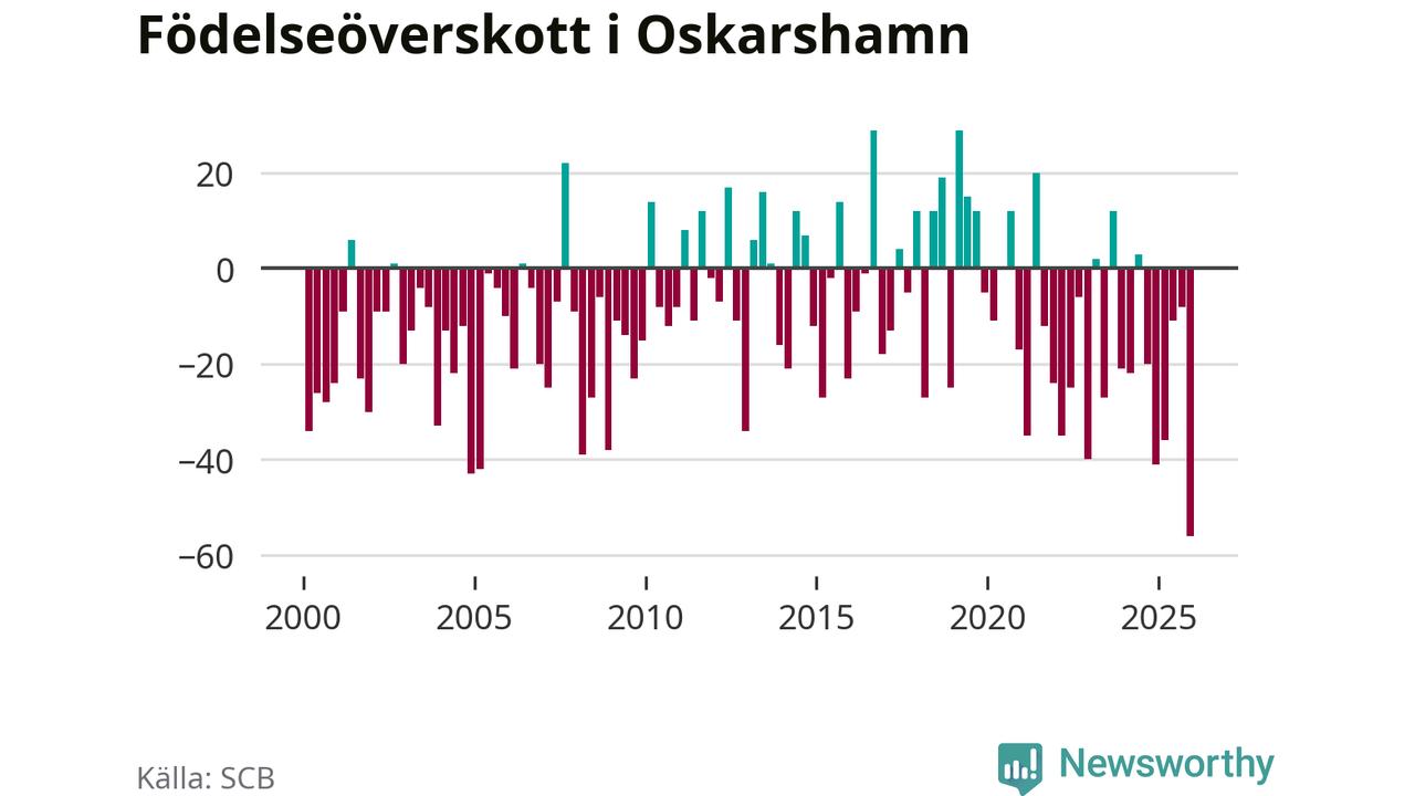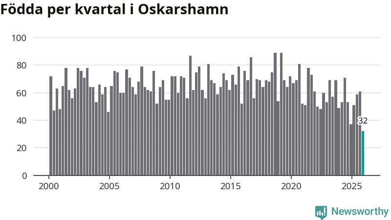 Enligt SCB:s siffror föddes 32 barn i Oskarshamn under det senaste kvartalet. Det är det lägsta födelsetal som registrerats i kommunen under 2000-talet. Det finns en osäkerhet här, eftersom SCB lägger på ett slumpmässigt brus på alla siffror. Samtidigt avled 88 personer. Oskarshamn hade alltså ett negativt födelsenetto, vilket kommunen historiskt sett oftast har haft.