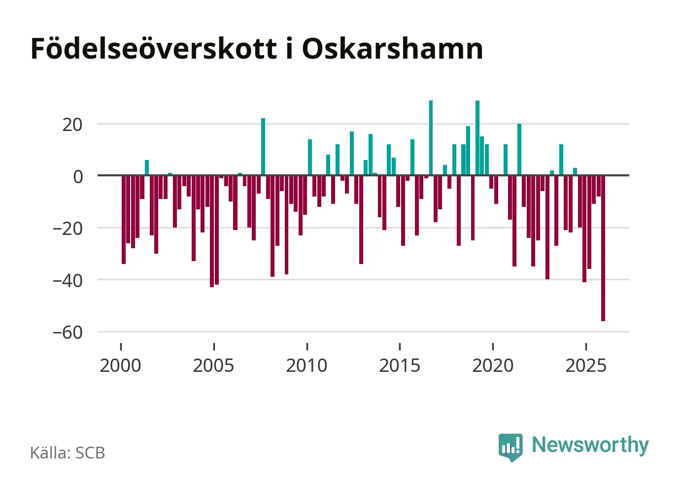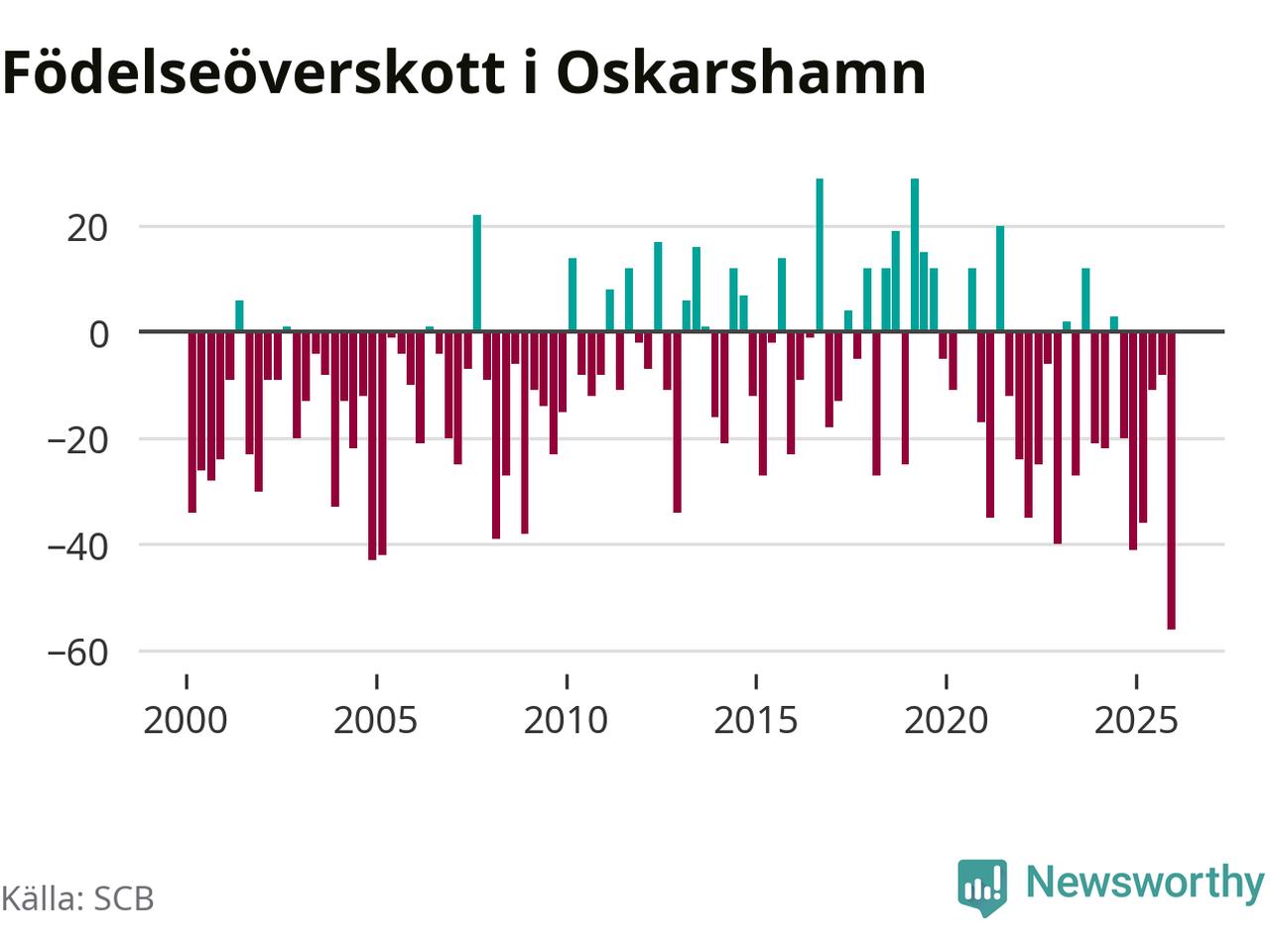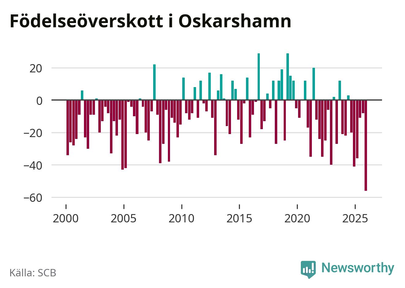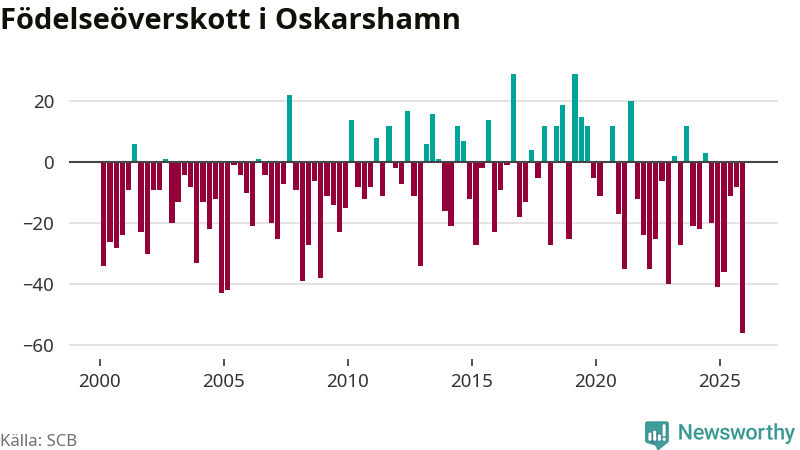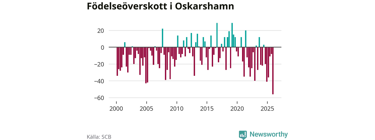 Enligt SCB:s siffror föddes 32 barn i Oskarshamn under det senaste kvartalet. Det är det lägsta födelsetal som registrerats i kommunen under 2000-talet. Det finns en osäkerhet här, eftersom SCB lägger på ett slumpmässigt brus på alla siffror. Samtidigt avled 88 personer. Oskarshamn hade alltså ett negativt födelsenetto, vilket kommunen historiskt sett oftast har haft.