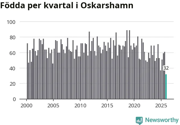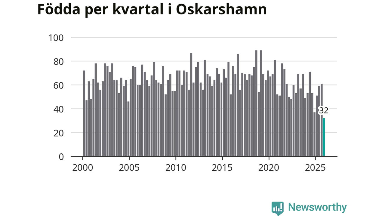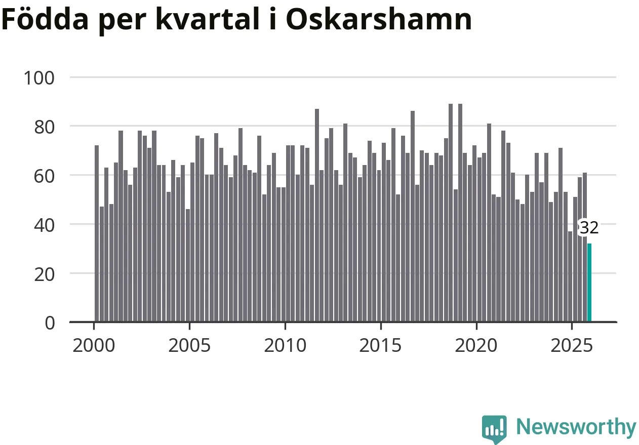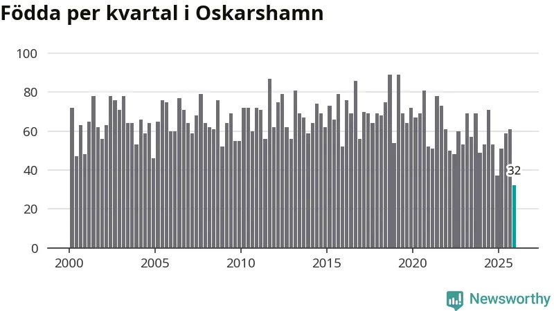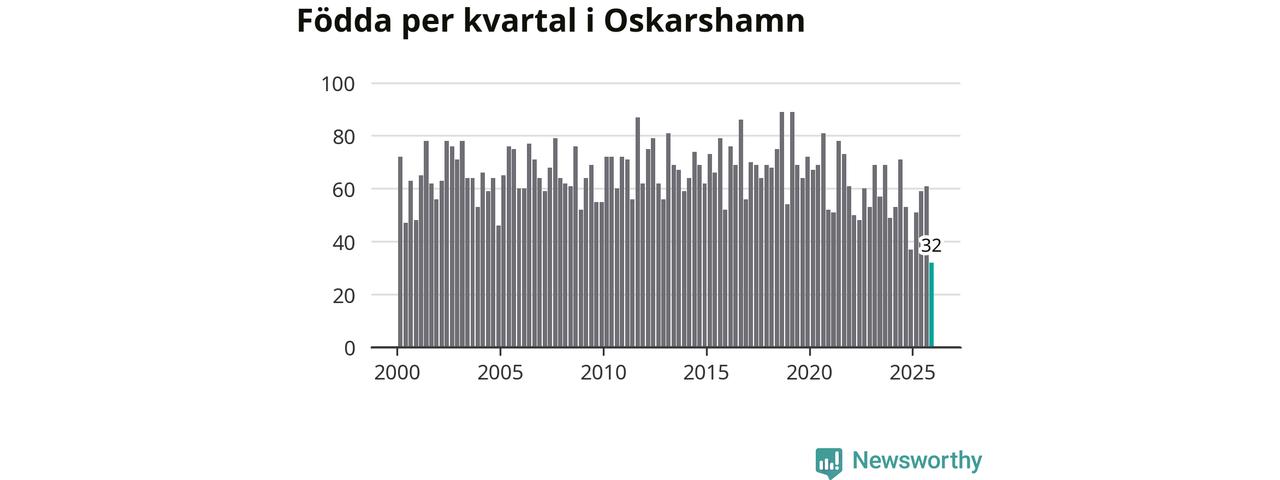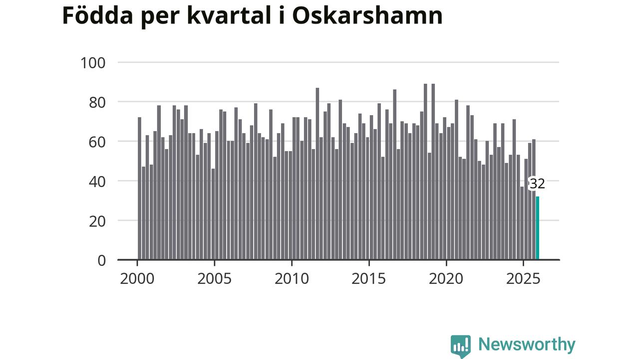 32 barn föddes i Oskarshamns kommun under fjärde kvartalet 2025. Det är den lägsta siffran hittills det här seklet. Det visar SCB:s senaste befolkningsstatistik.