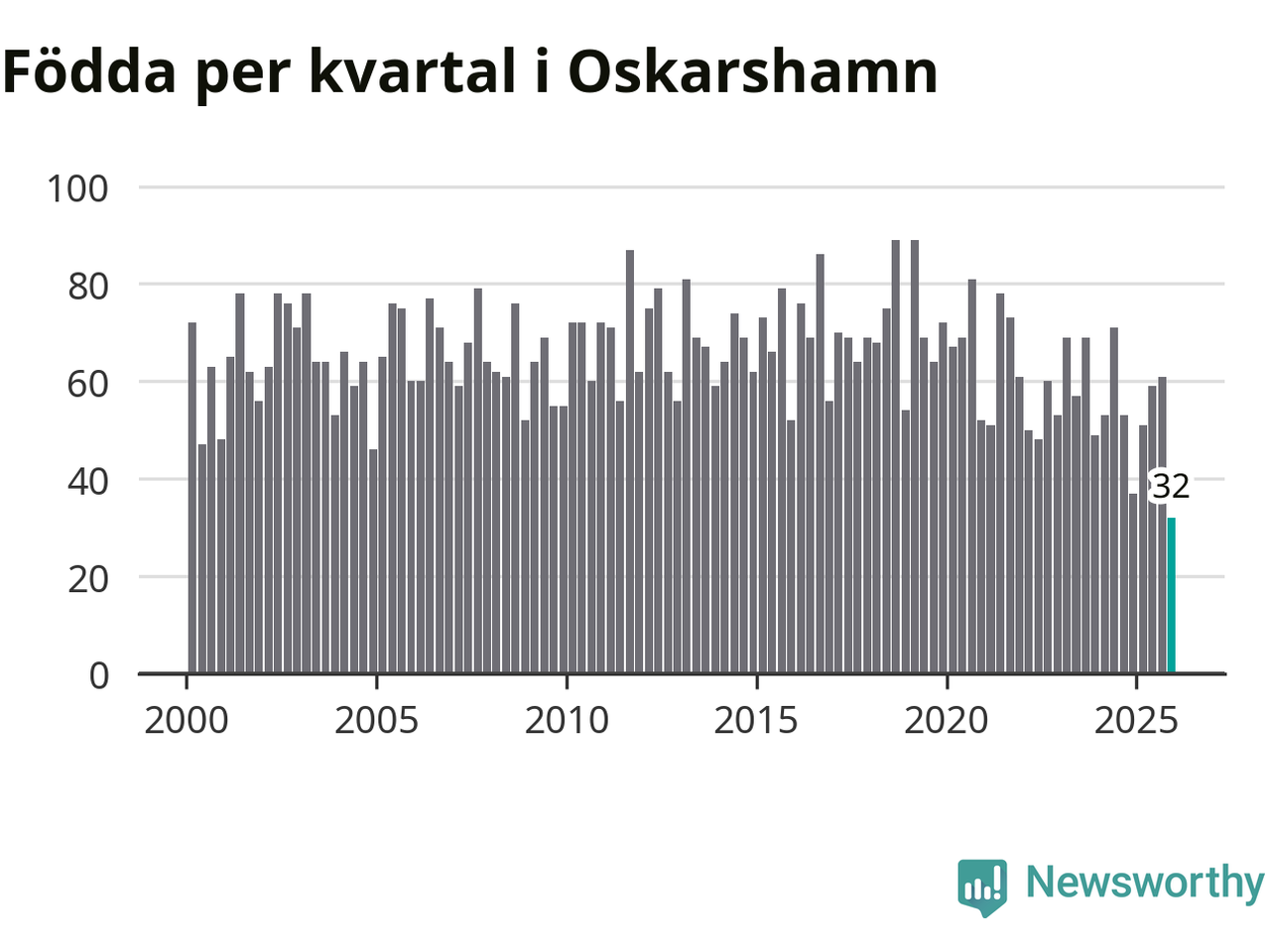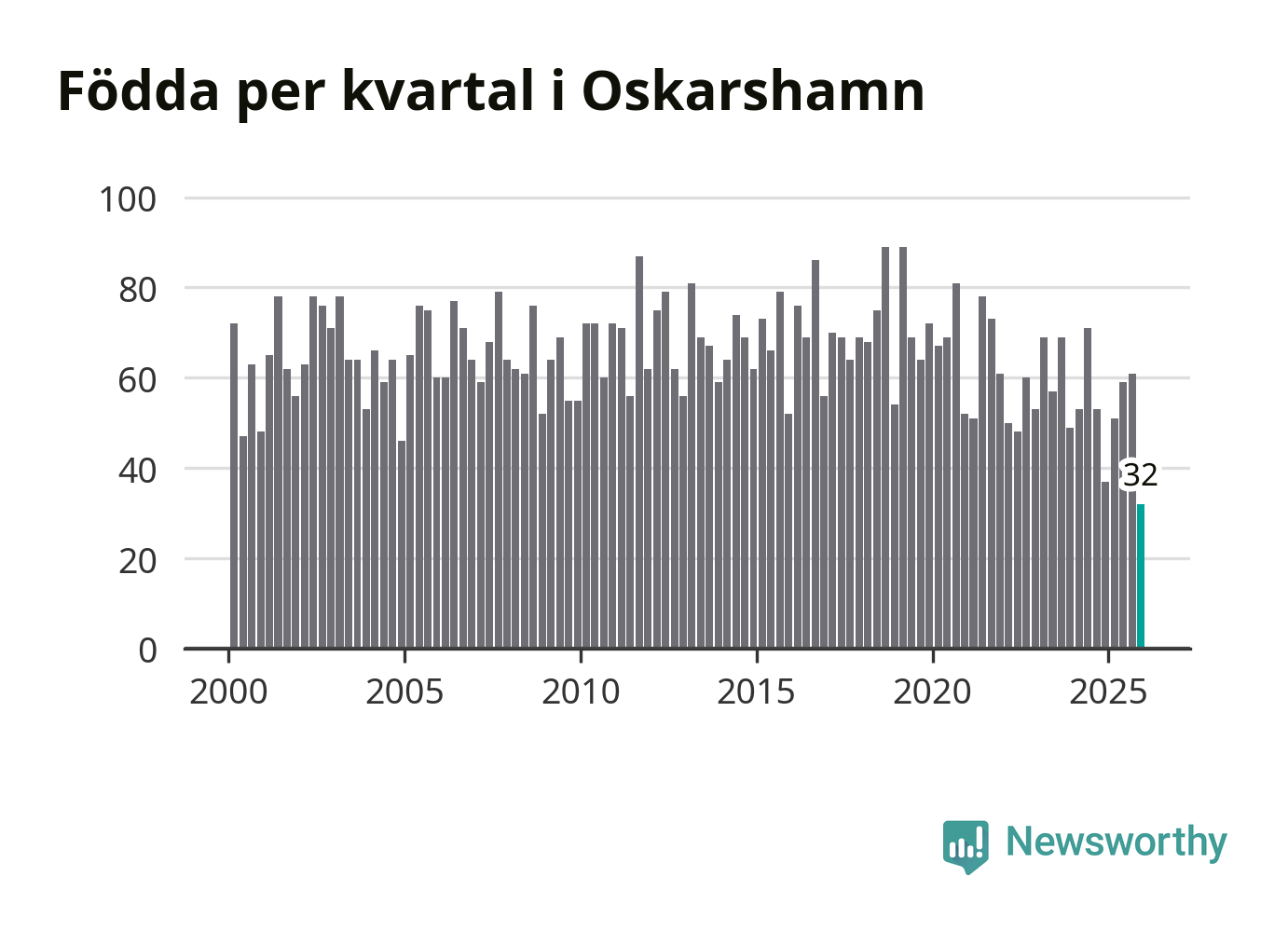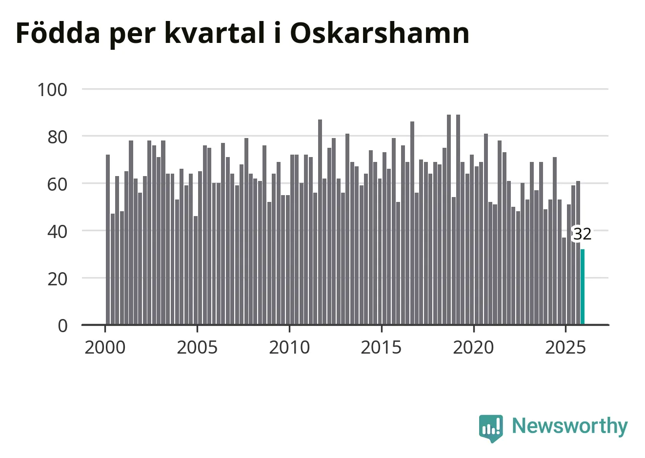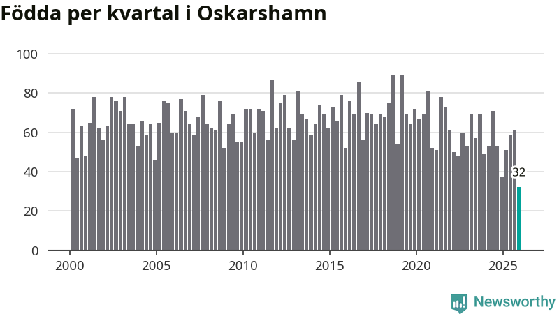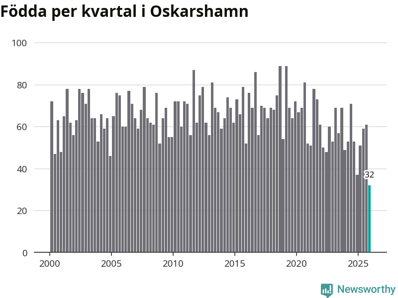 32 barn föddes i Oskarshamns kommun under fjärde kvartalet 2025. Det är den lägsta siffran hittills det här seklet. Det visar SCB:s senaste befolkningsstatistik.
