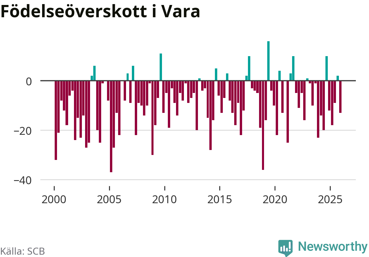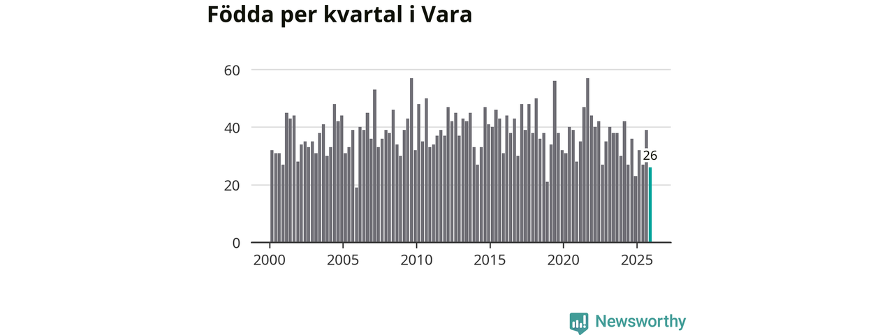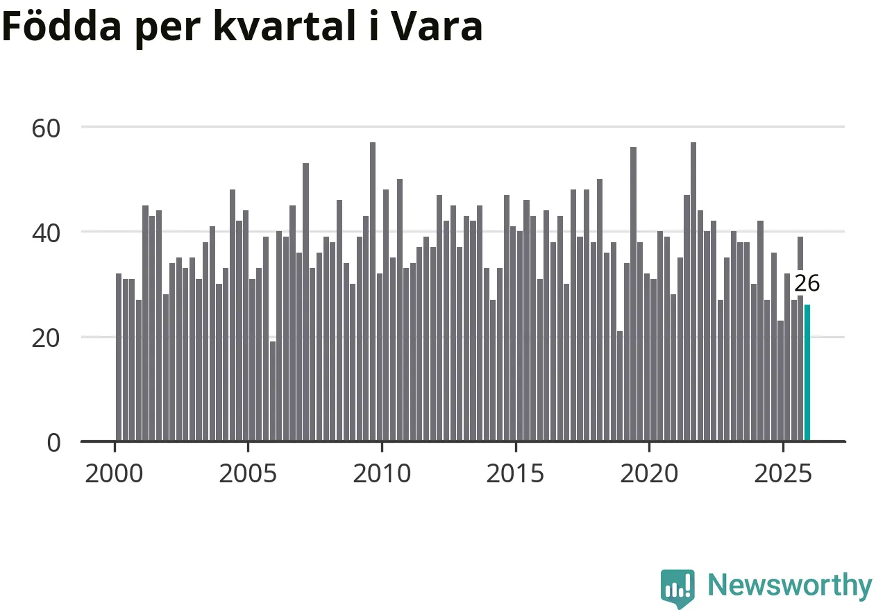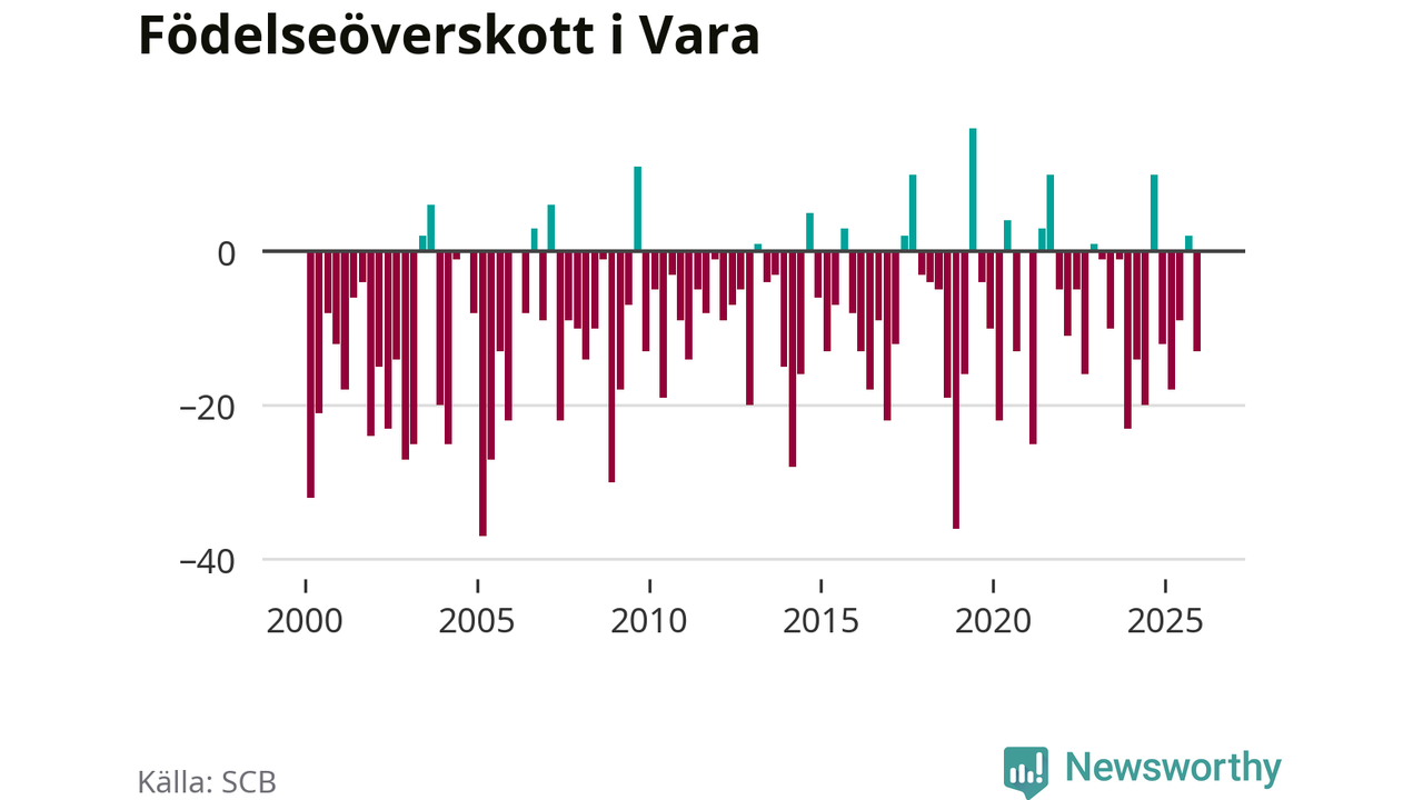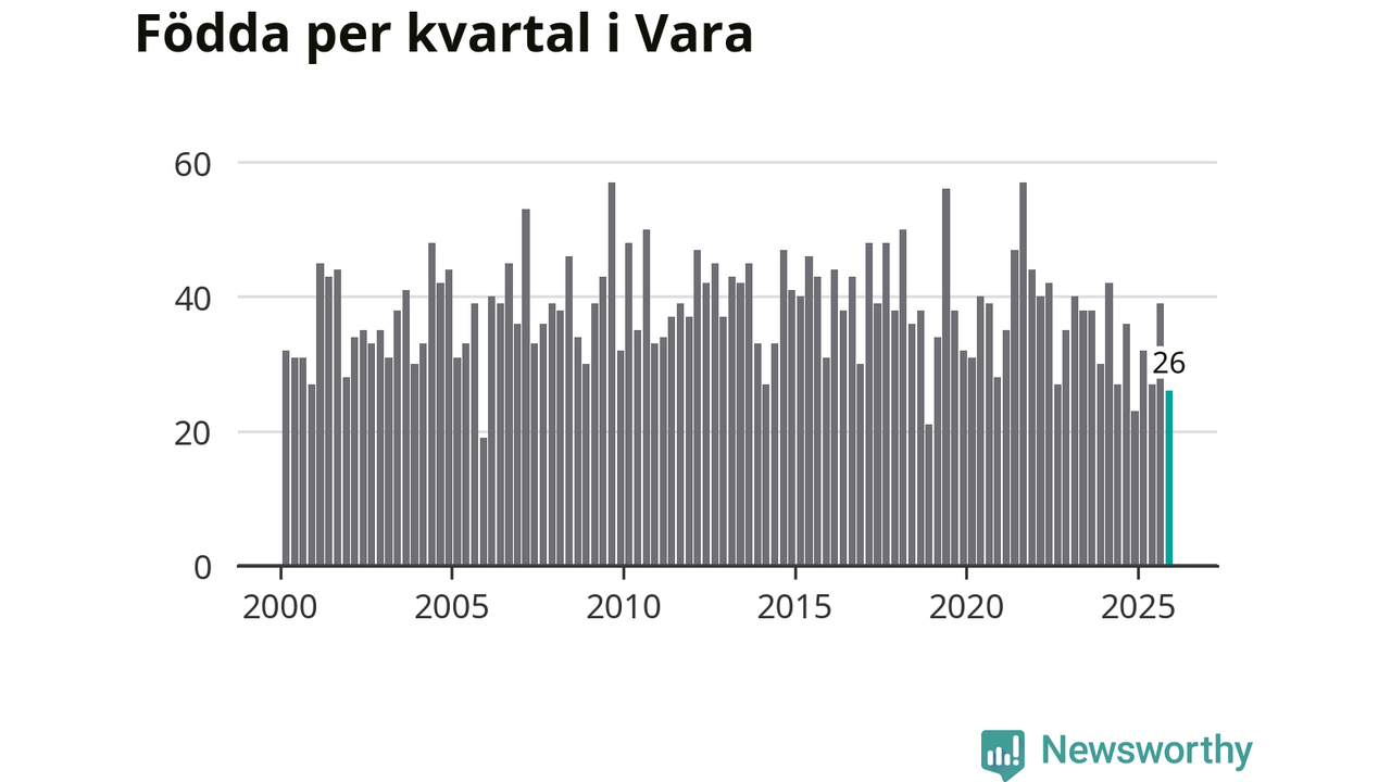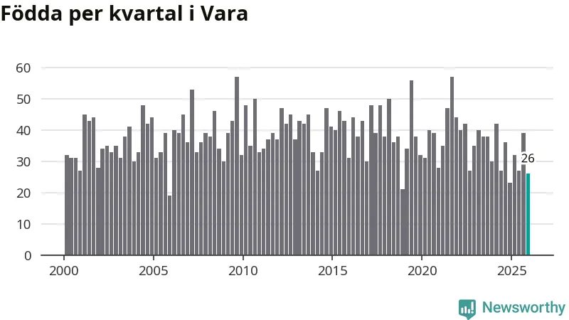 Enligt SCB:s siffror föddes 26 barn i Vara under det senaste kvartalet. Samtidigt avled 39 personer. Vara hade alltså ett negativt födelsenetto, vilket kommunen historiskt sett oftast har haft.