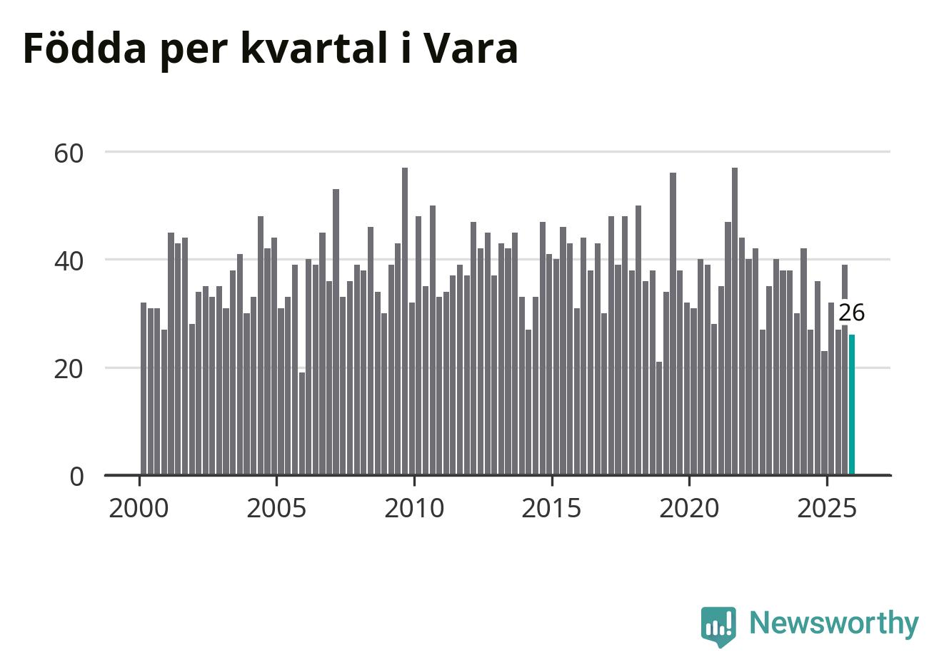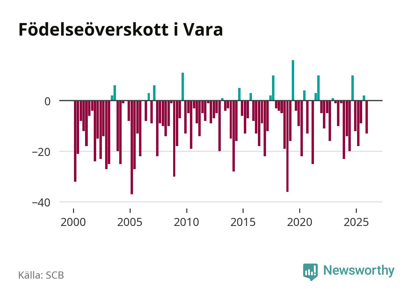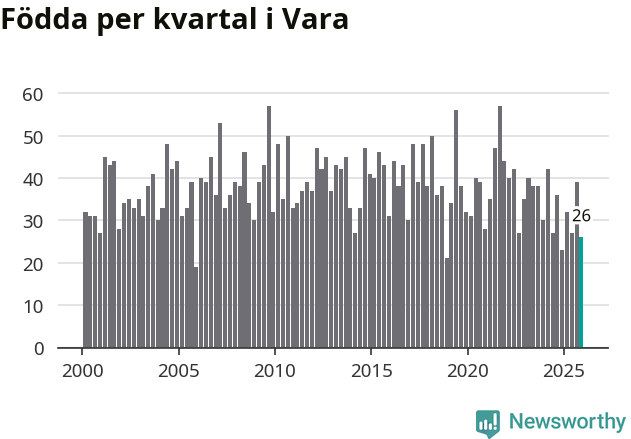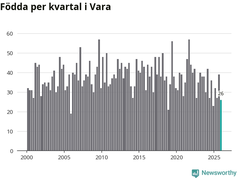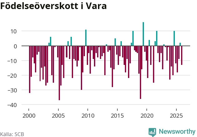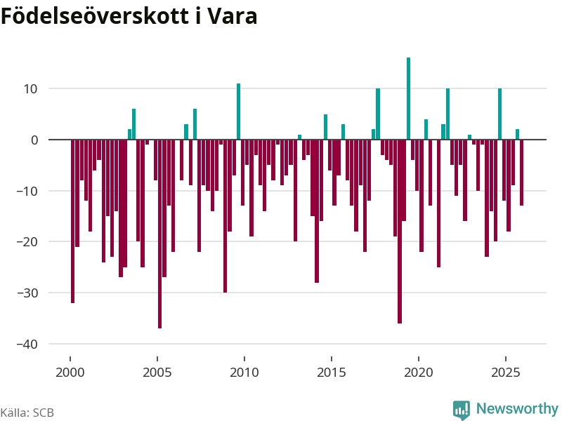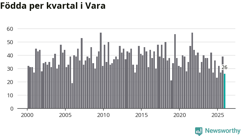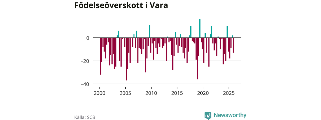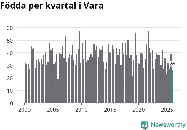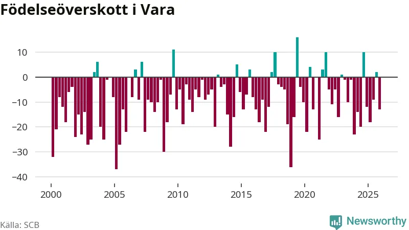 Enligt SCB:s siffror föddes 26 barn i Vara under det senaste kvartalet. Samtidigt avled 39 personer. Vara hade alltså ett negativt födelsenetto, vilket kommunen historiskt sett oftast har haft.
