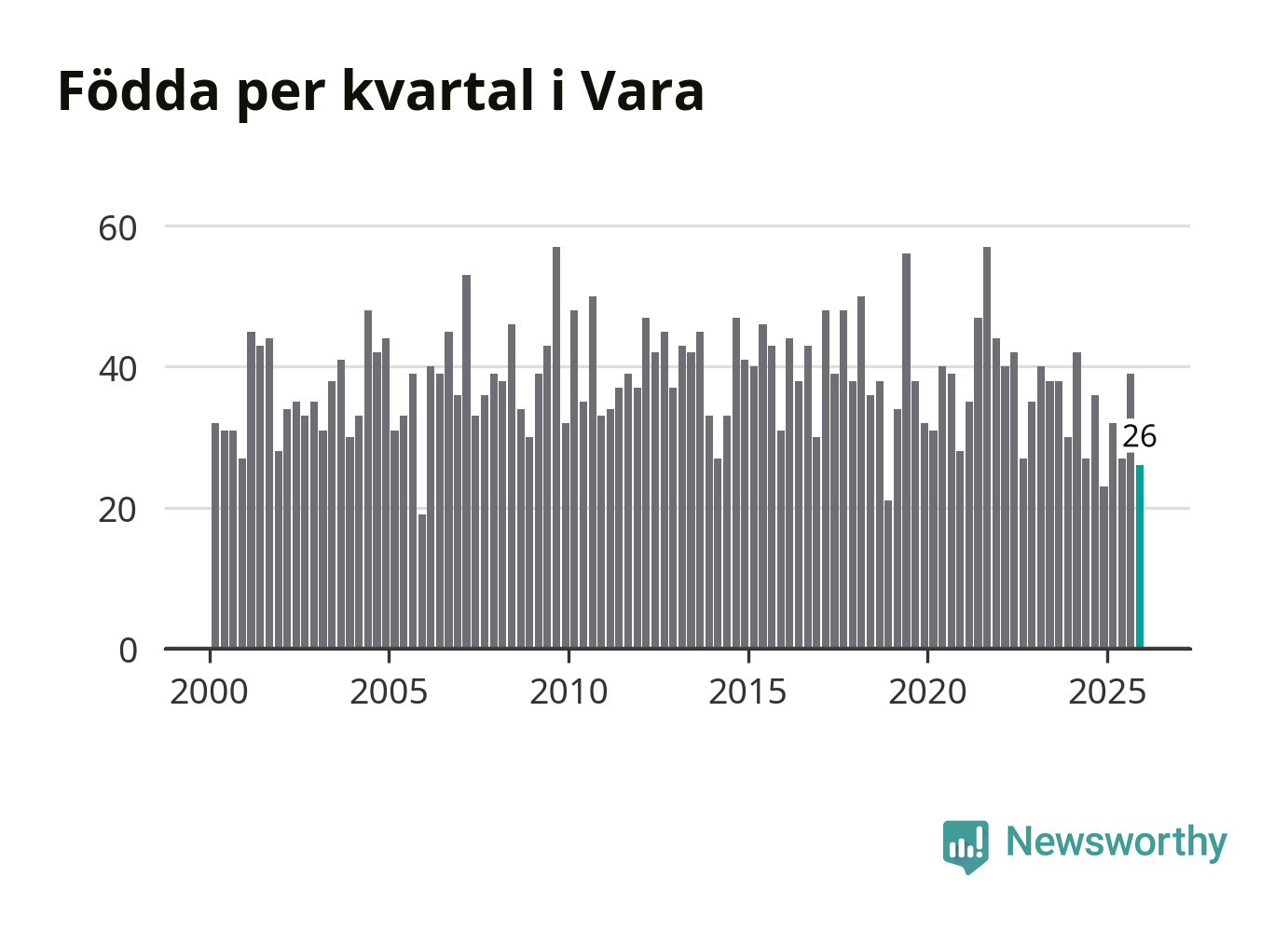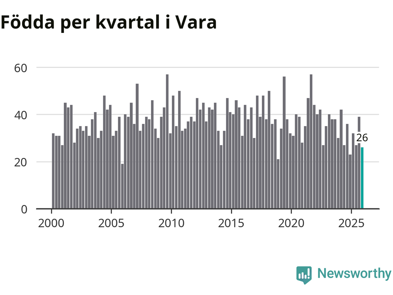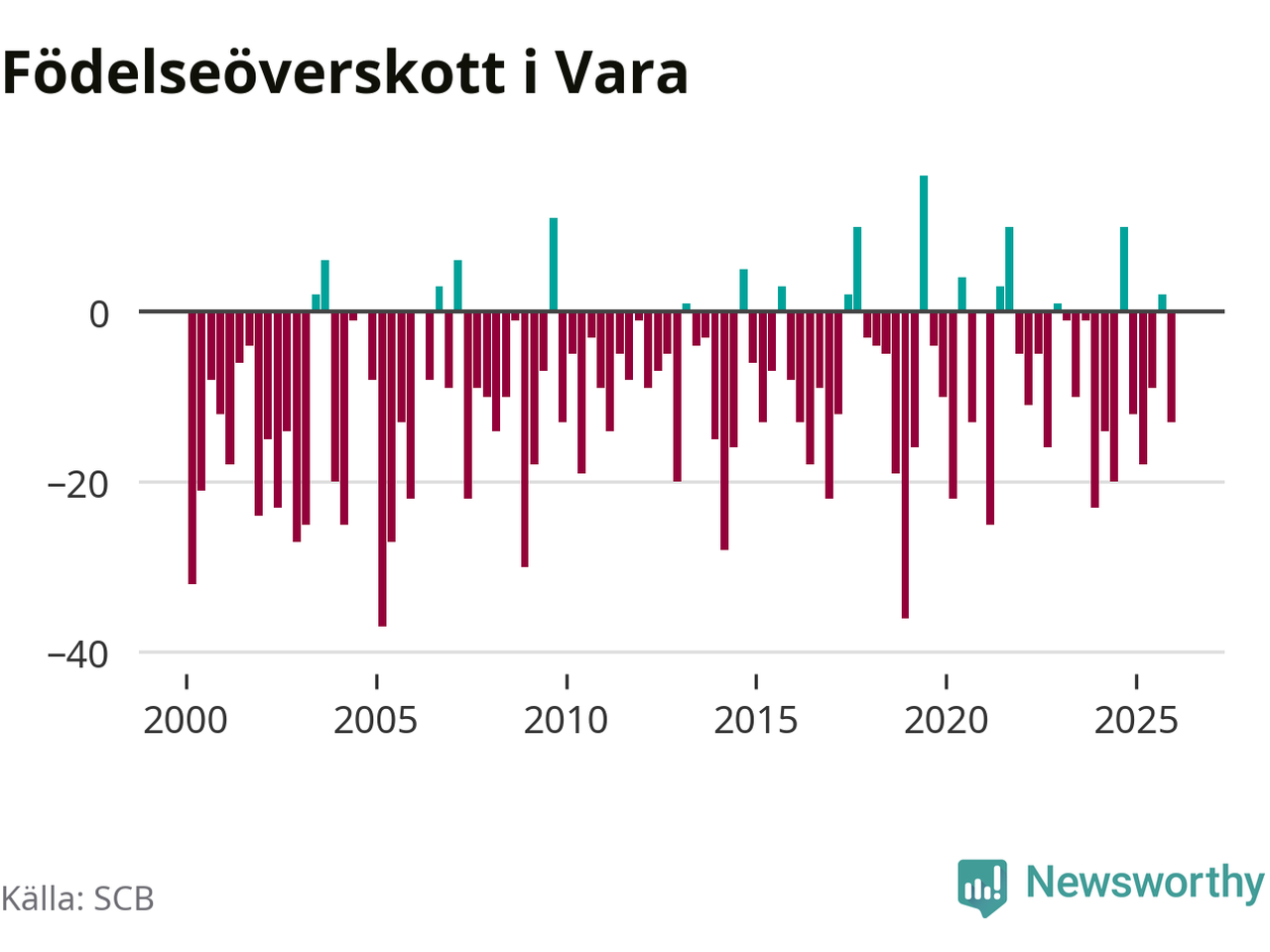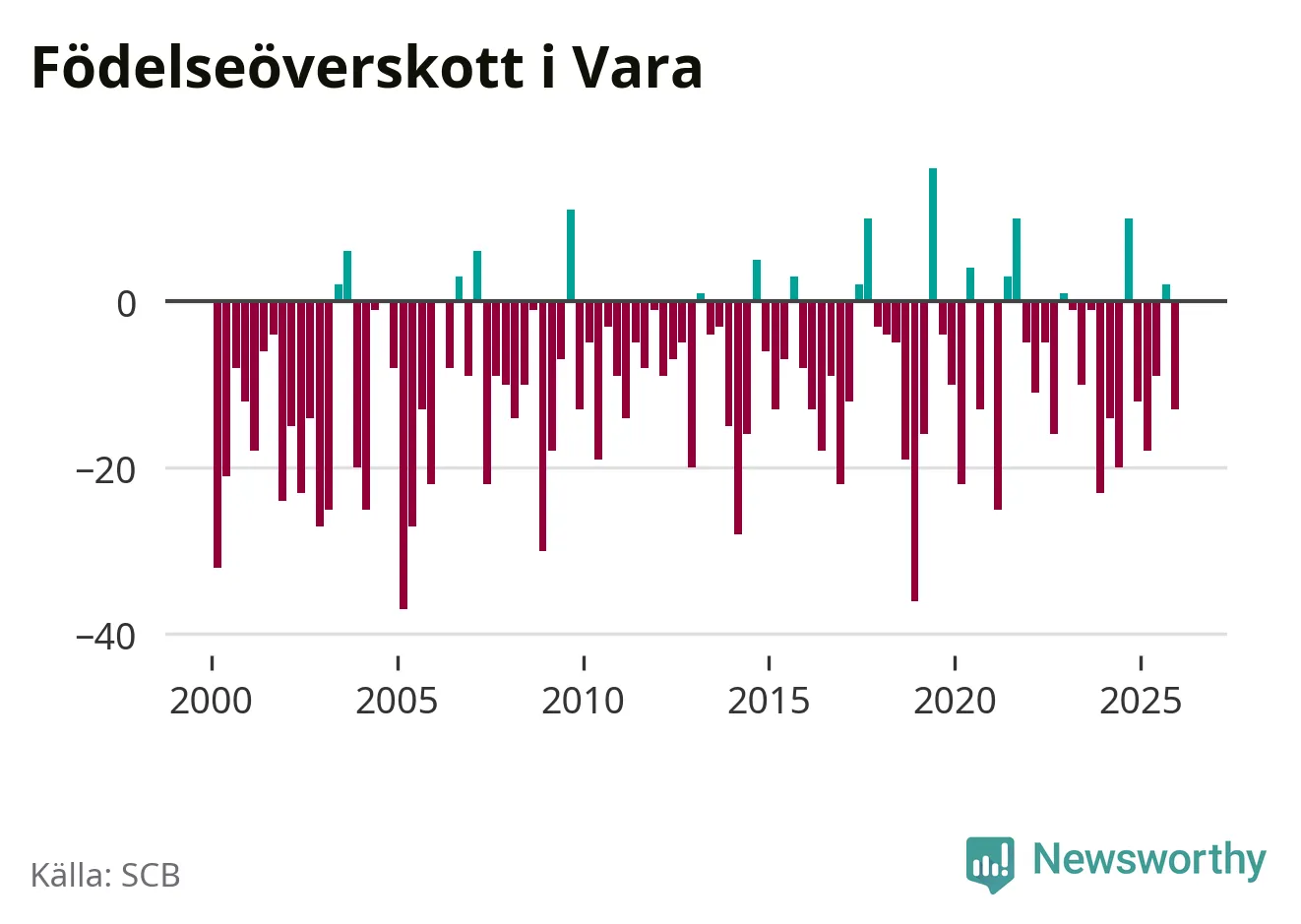 Enligt SCB:s siffror föddes 26 barn i Vara under det senaste kvartalet. Samtidigt avled 39 personer. Vara hade alltså ett negativt födelsenetto, vilket kommunen historiskt sett oftast har haft.