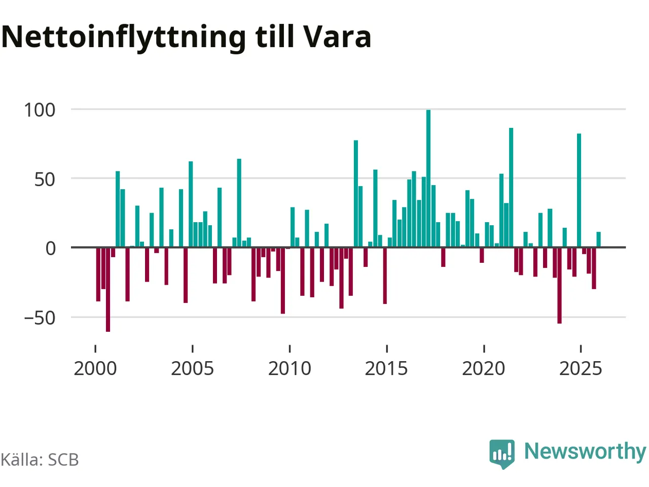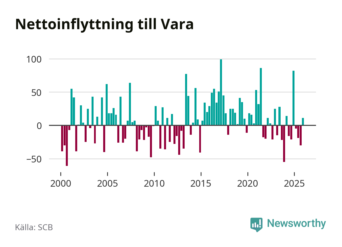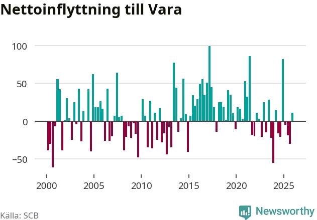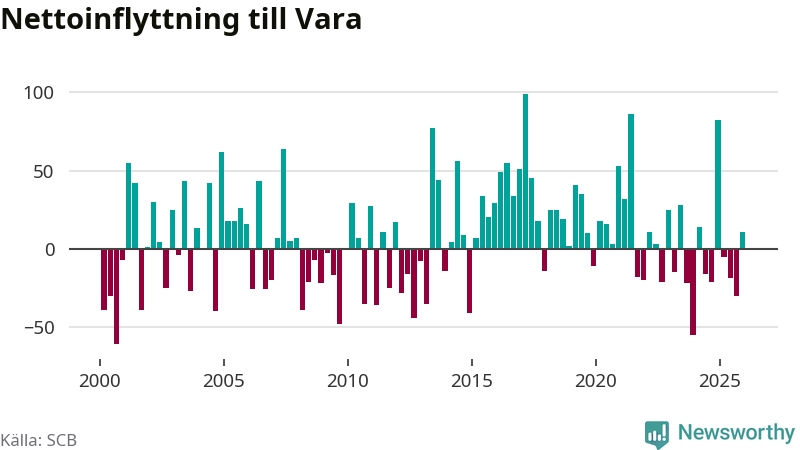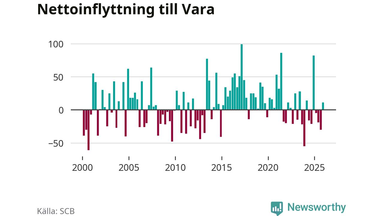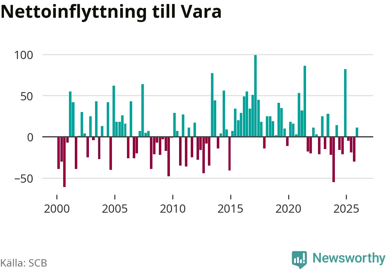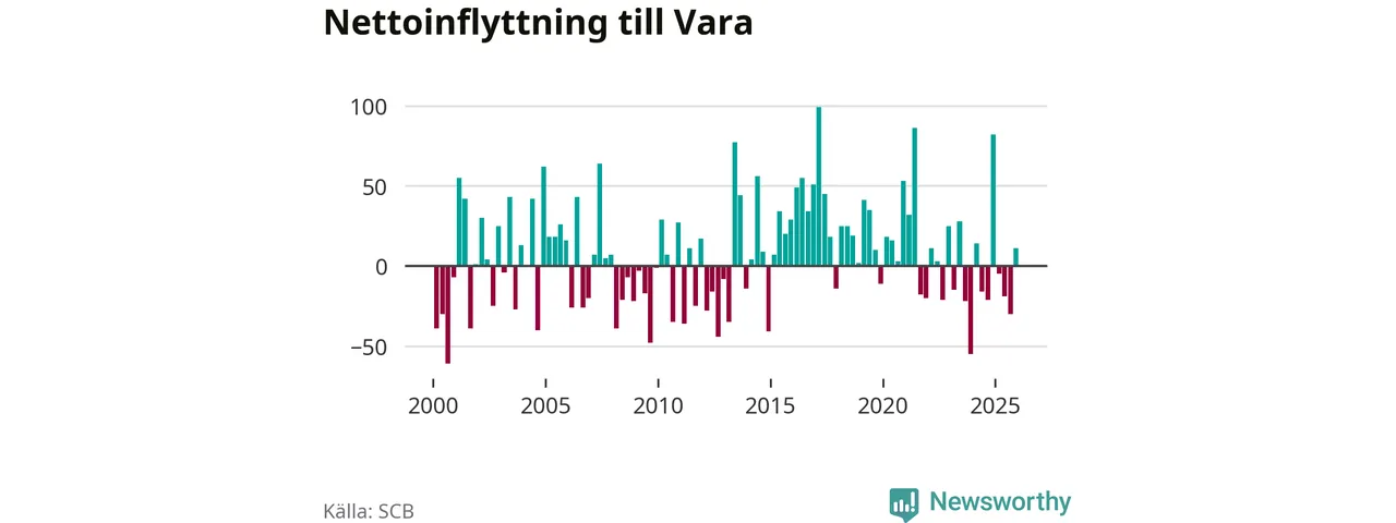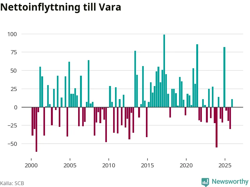 Under fjärde kvartalet 2025 flyttade 182 personer till kommunen medan 171 personer flyttade därifrån. Sedan seklets början har Vara oftast haft ett positivt flyttnetto, inklusive det senaste kvartalet.