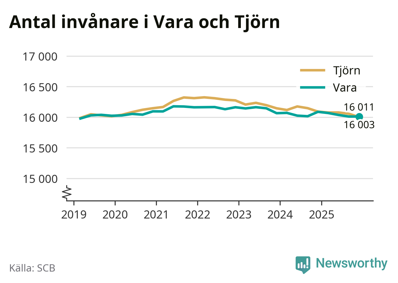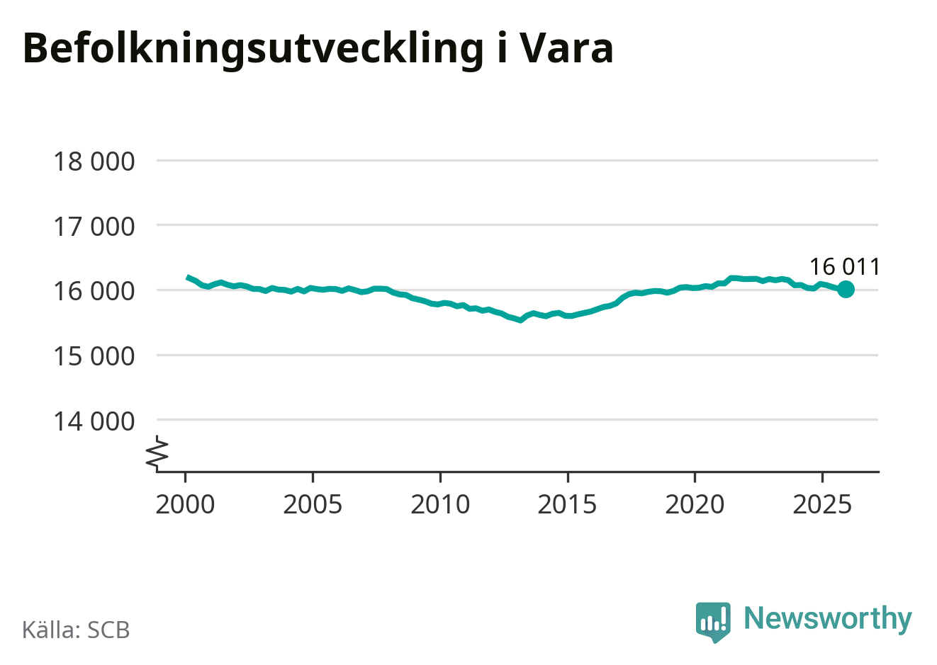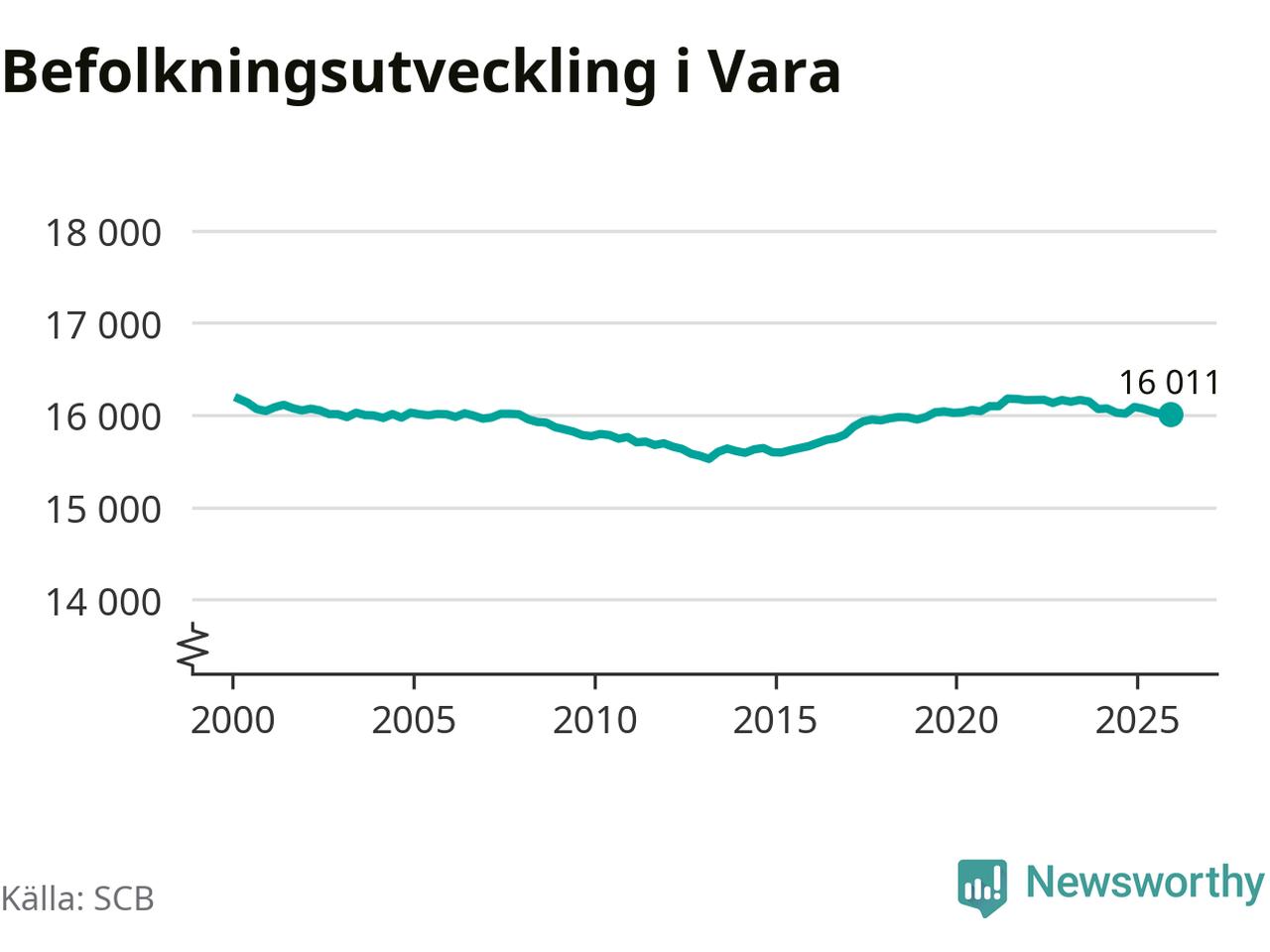Den 31 december bodde 16 011 personer i Vara kommun, enligt SCB:s senaste siffror. Det är lika många som i slutet av tredje kvartalet, men det skulle lika gärna kunna röra sig om en liten ökning eller liten minskning av befolkningen. SCB gör en liten, slumpmässig, justering av siffrorna för att skydda enskilda individers identitet.
