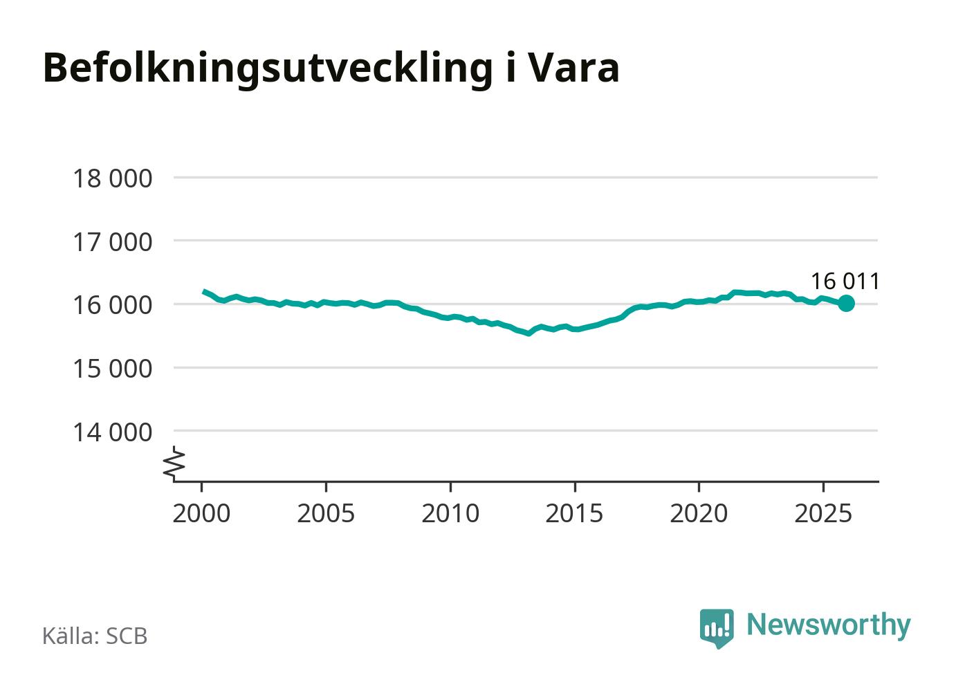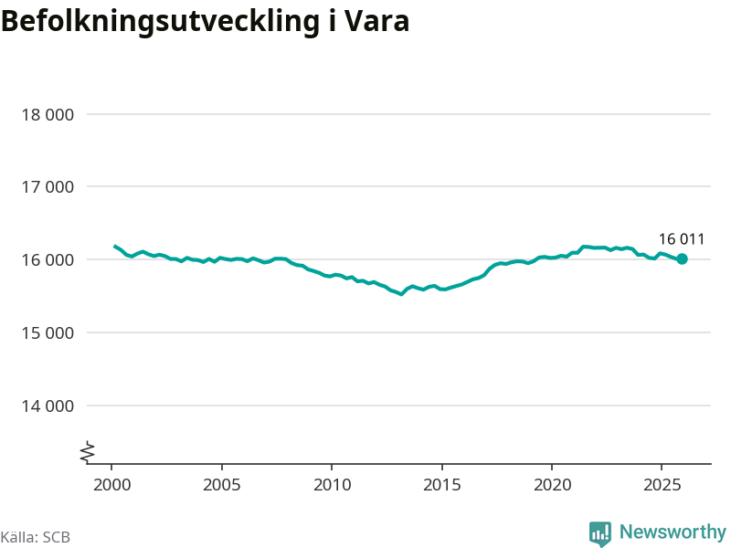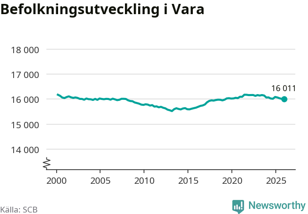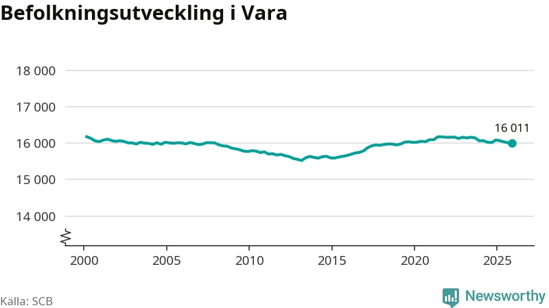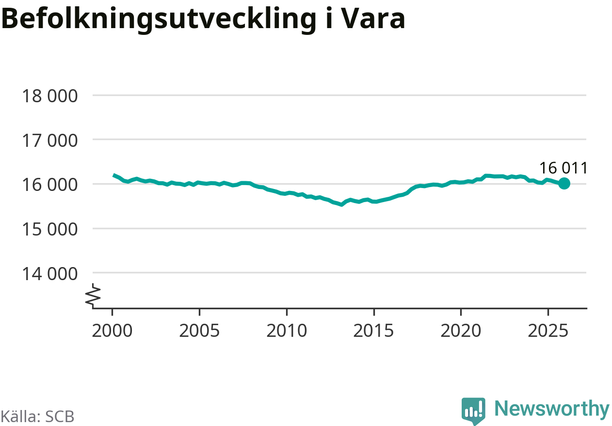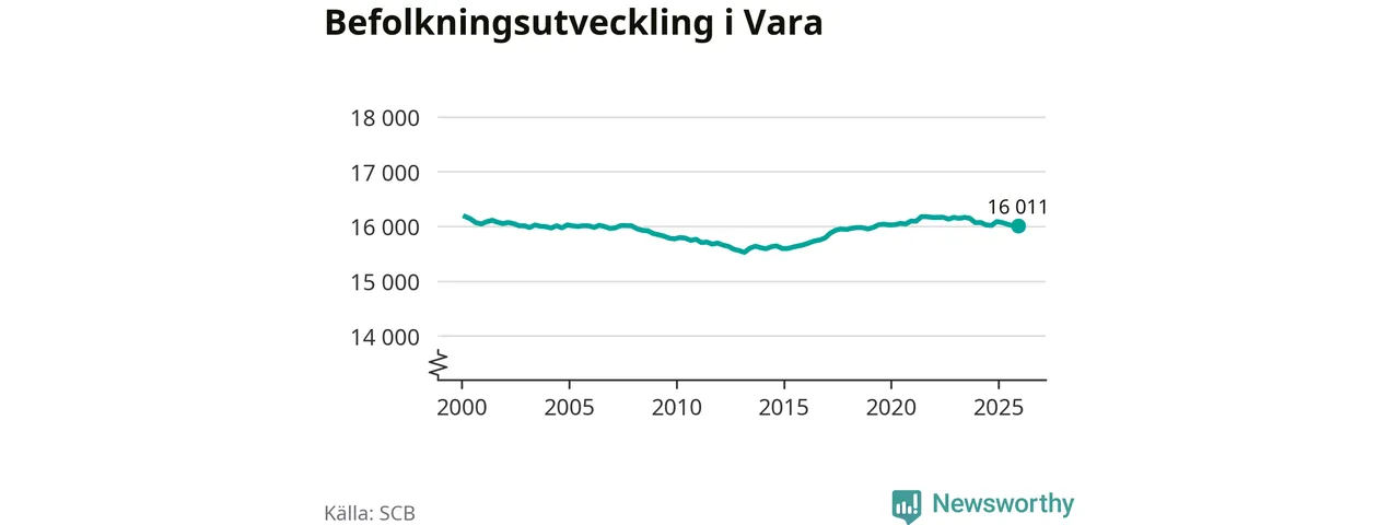 Jämfört med för ett år sedan har befolkningen i Vara minskat med knappt 80 personer – vilket motsvarar en nedgång på 0,5 procent. Sedan millennieskiftet har folkmängden minskat med runt 170 personer, eller en procent.