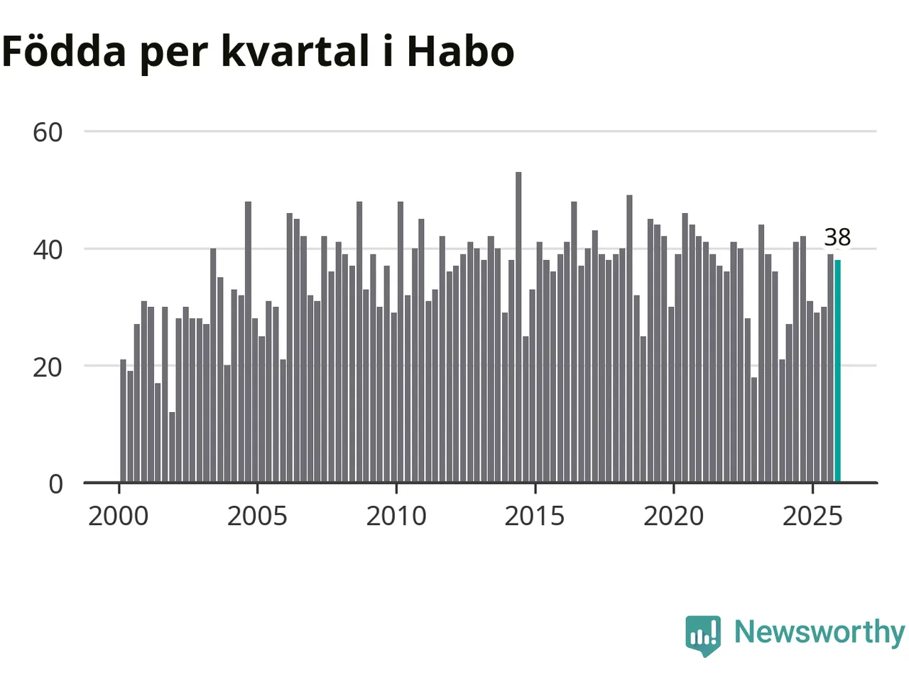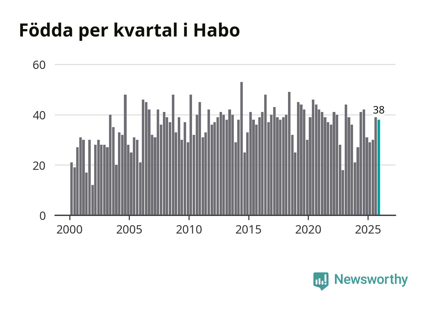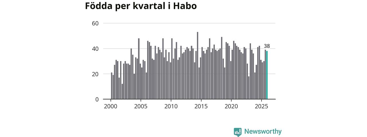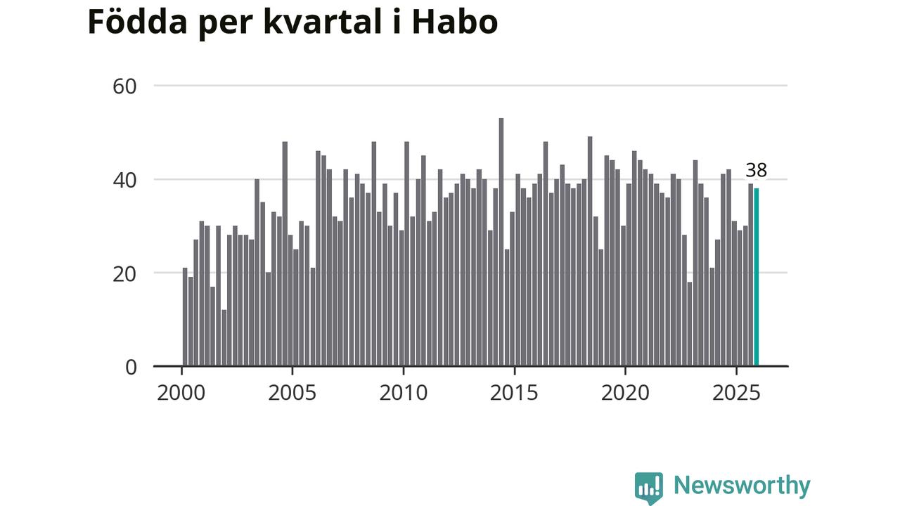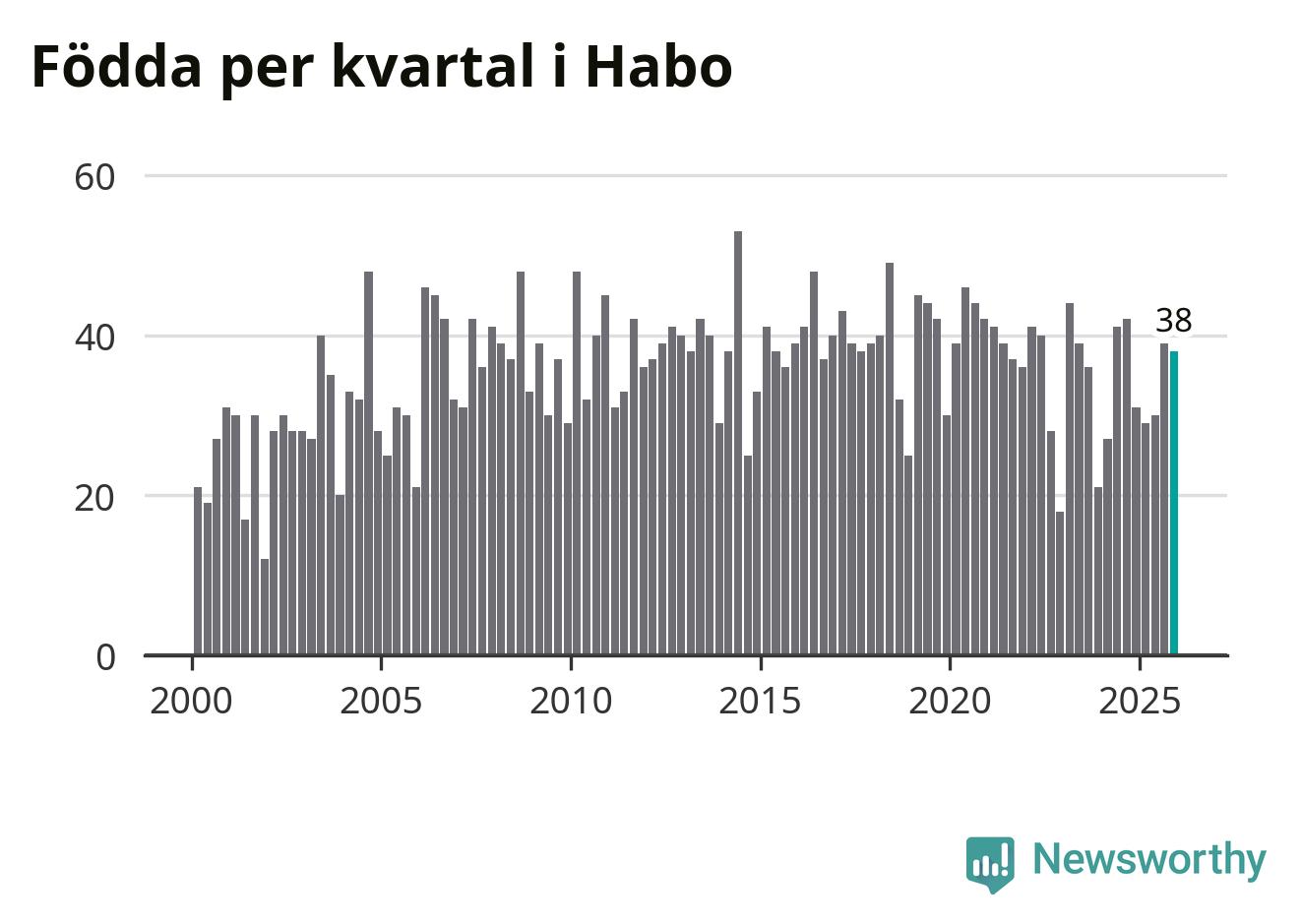 Enligt SCB:s siffror föddes 38 barn i Habo under det senaste kvartalet. Samtidigt avled 29 personer. Habo hade alltså ett positivt födelsenetto, vilket kommunen historiskt sett nästan alltid har haft.