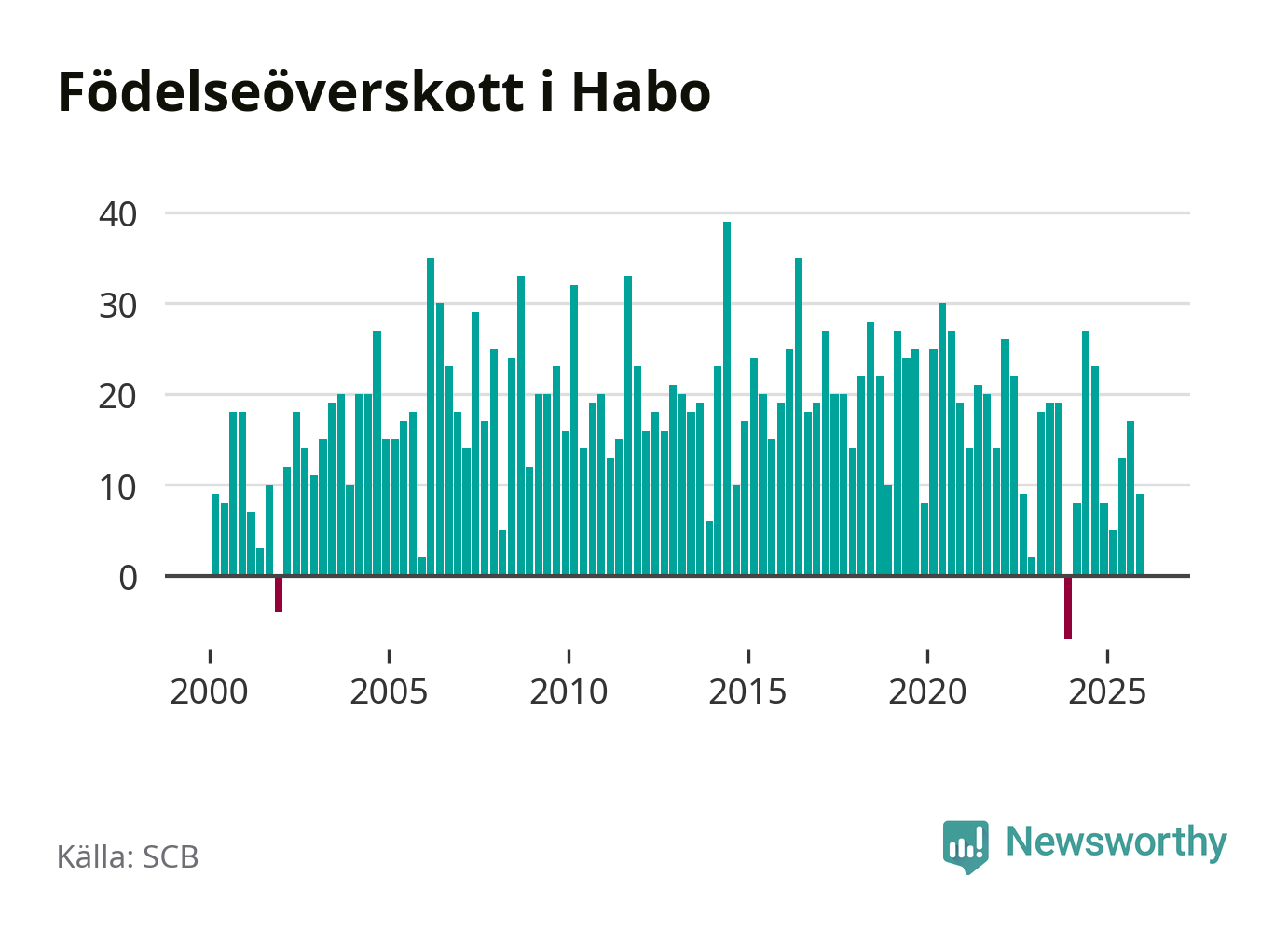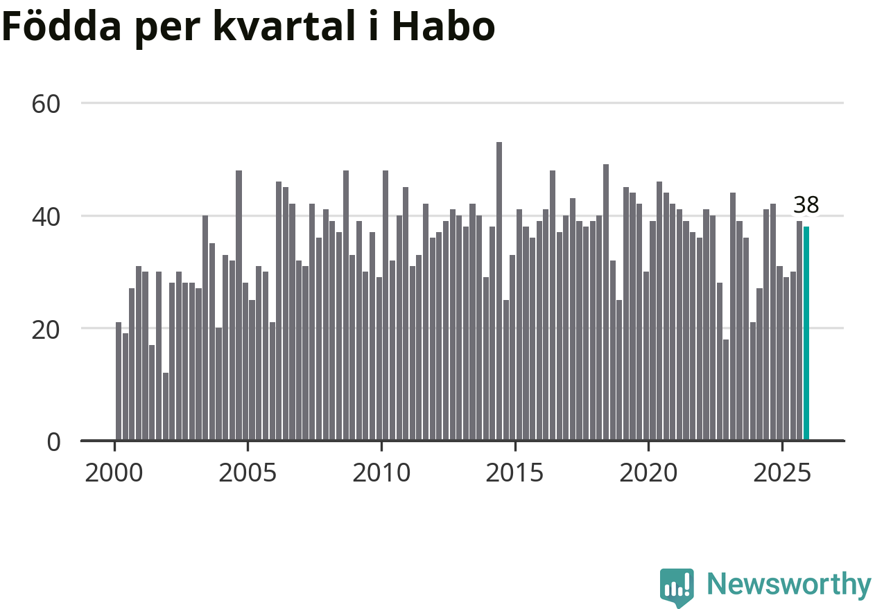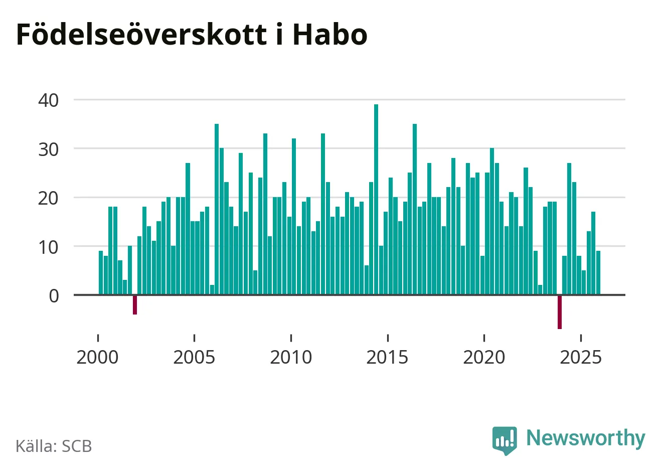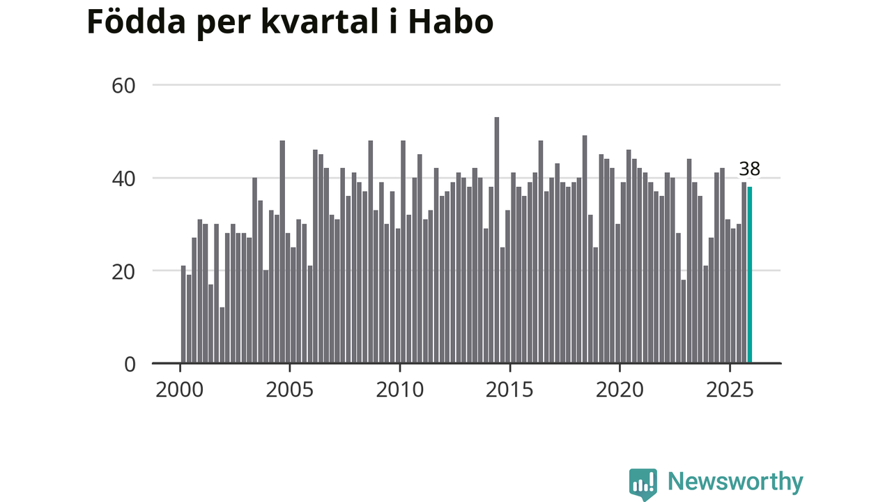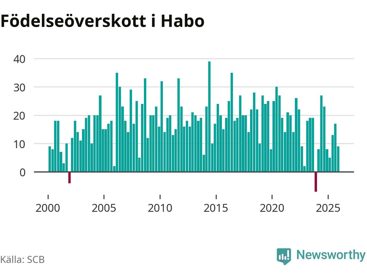 Enligt SCB:s siffror föddes 38 barn i Habo under det senaste kvartalet. Samtidigt avled 29 personer. Habo hade alltså ett positivt födelsenetto, vilket kommunen historiskt sett nästan alltid har haft.