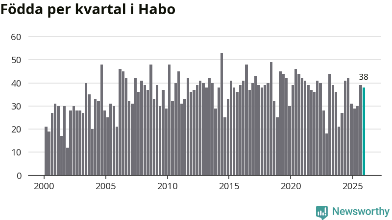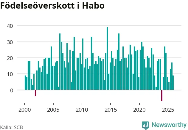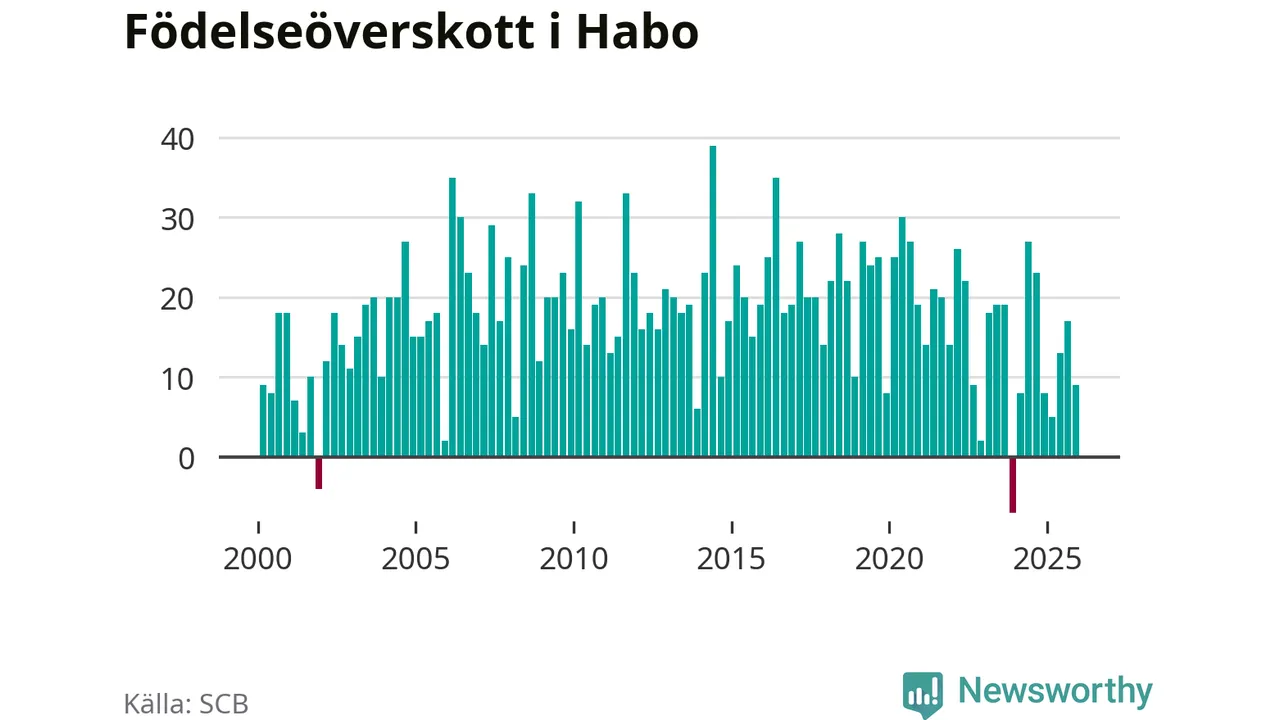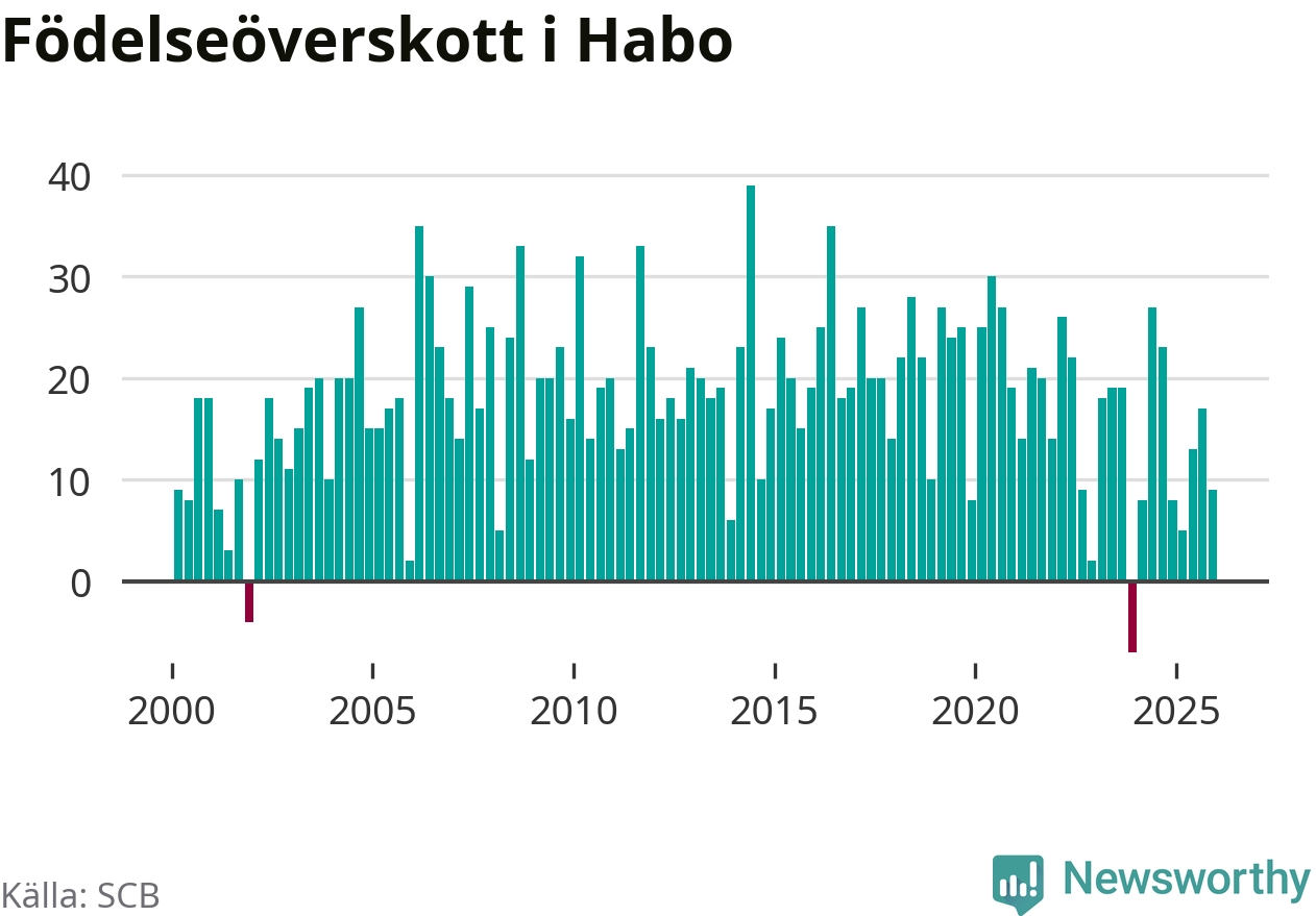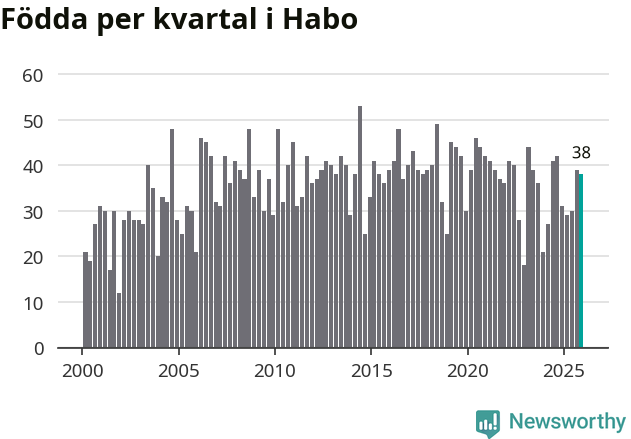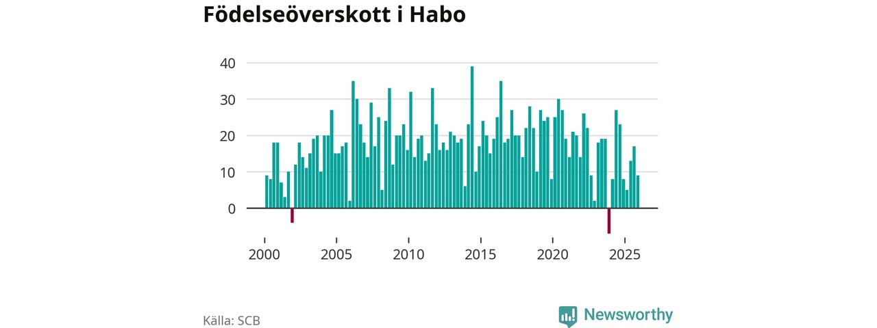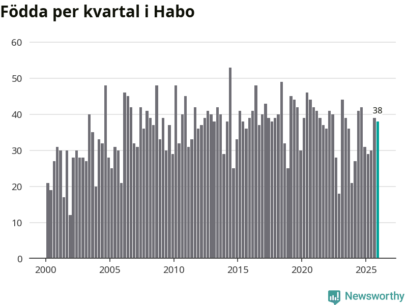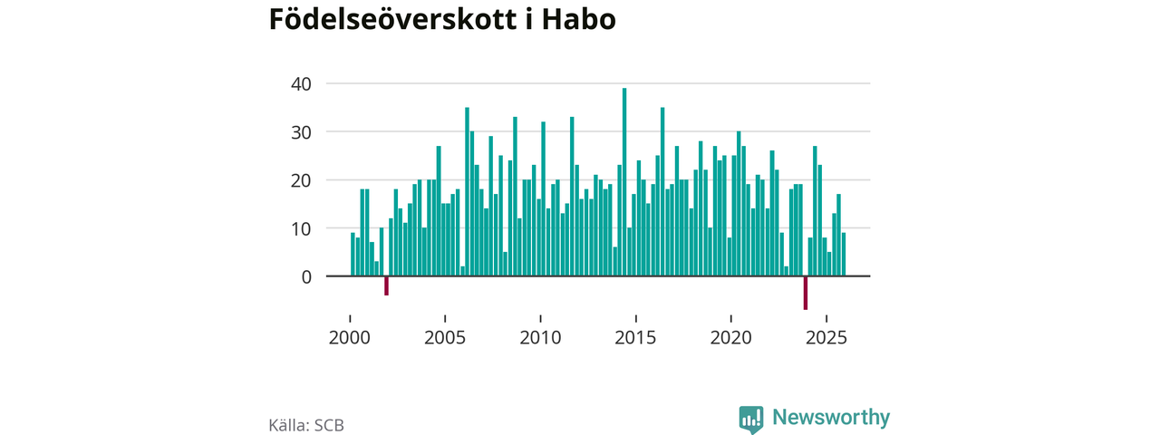 Enligt SCB:s siffror föddes 38 barn i Habo under det senaste kvartalet. Samtidigt avled 29 personer. Habo hade alltså ett positivt födelsenetto, vilket kommunen historiskt sett nästan alltid har haft.