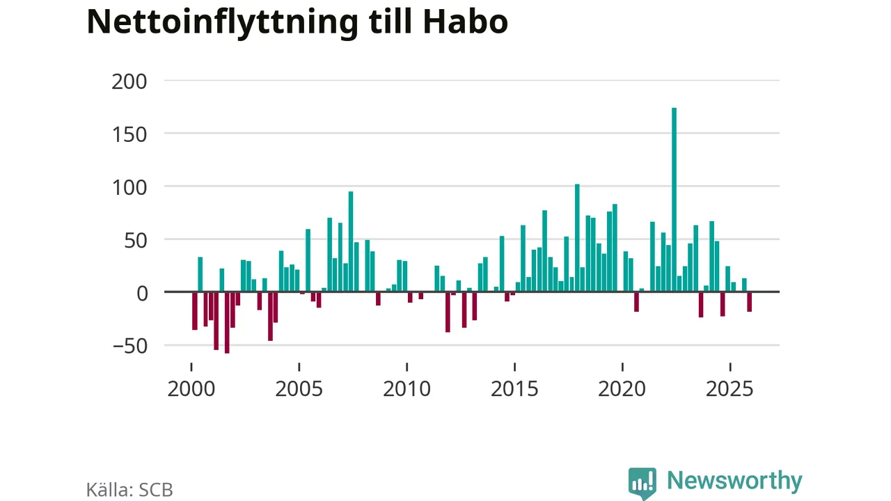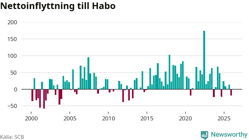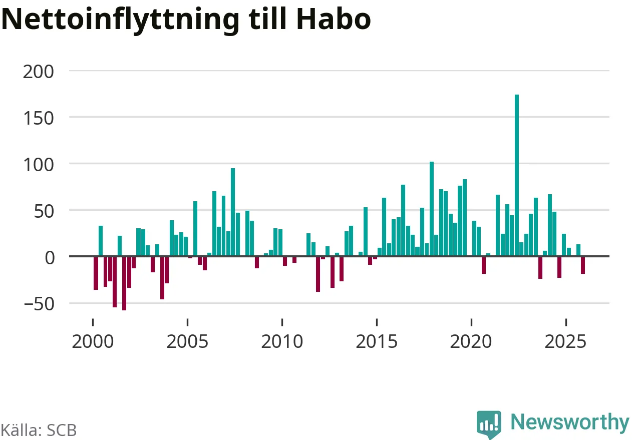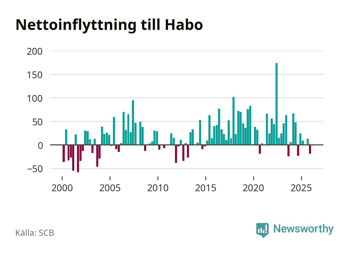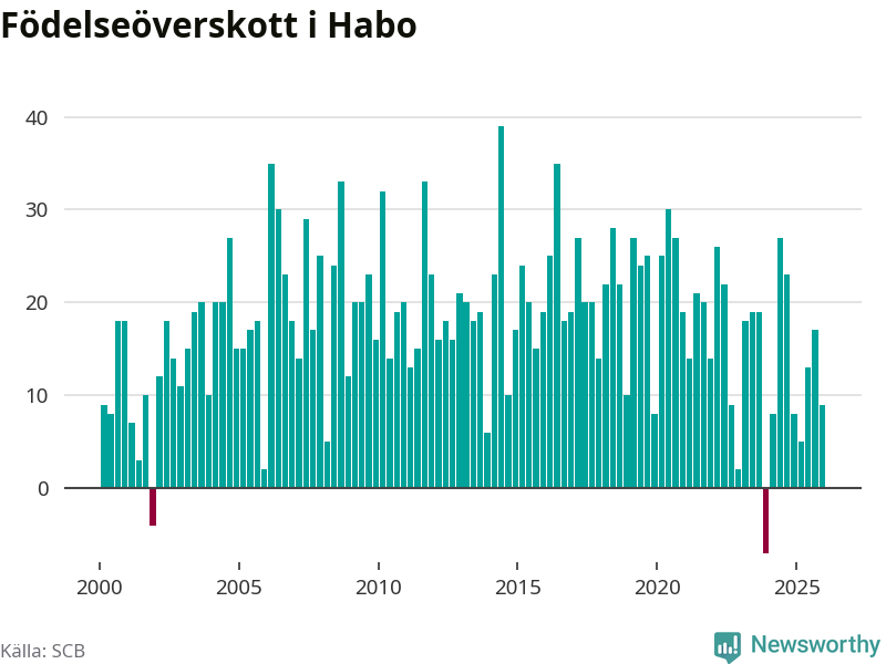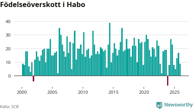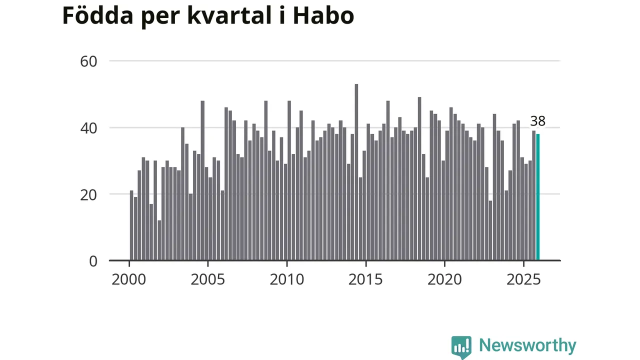 Enligt SCB:s siffror föddes 38 barn i Habo under det senaste kvartalet. Samtidigt avled 29 personer. Habo hade alltså ett positivt födelsenetto, vilket kommunen historiskt sett nästan alltid har haft.