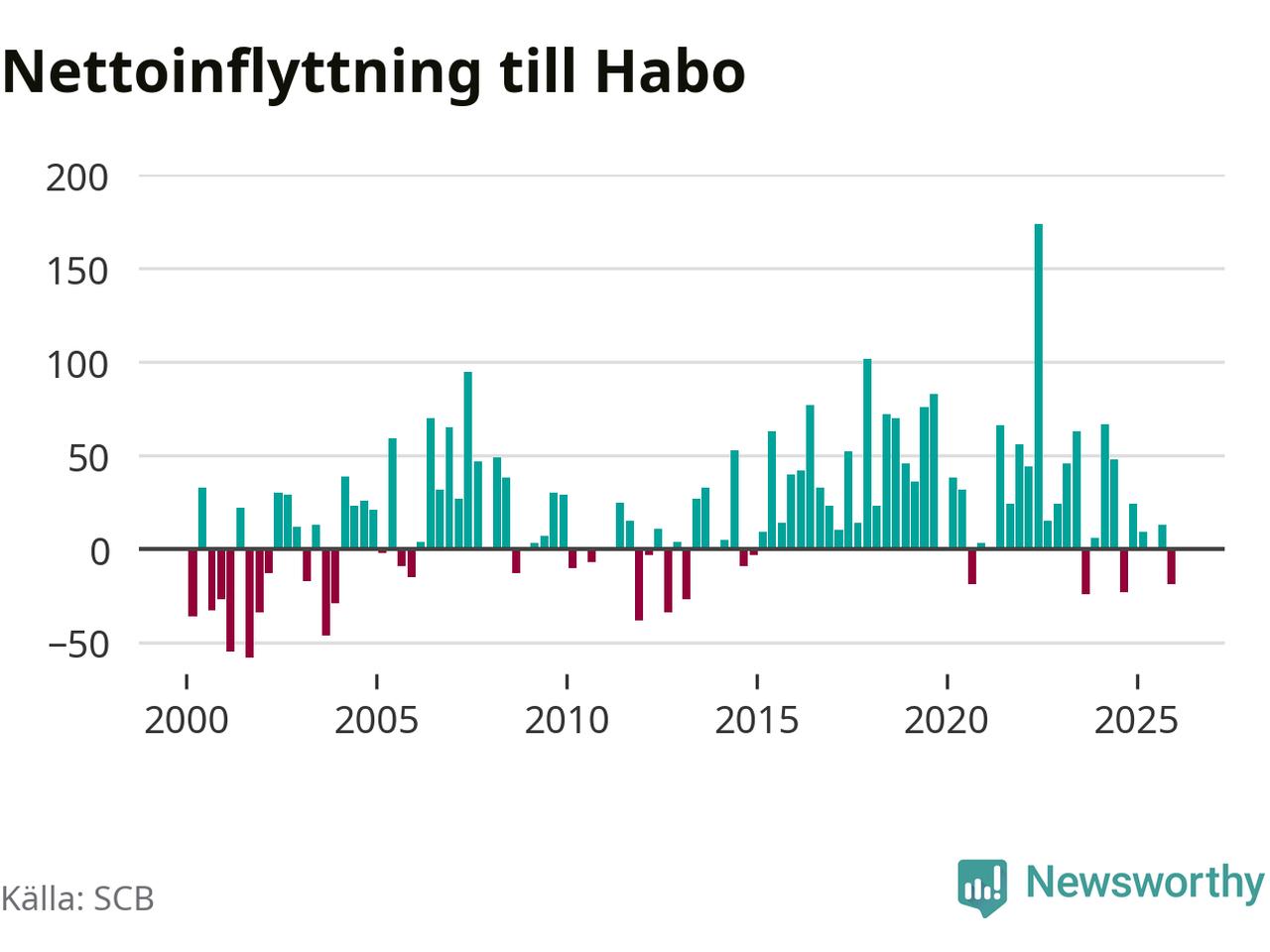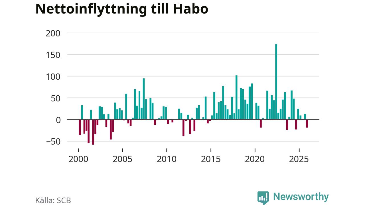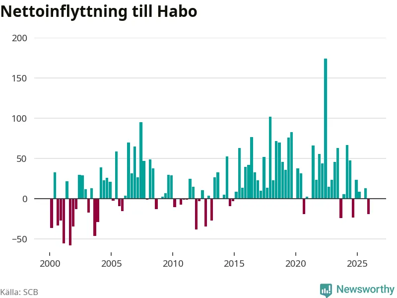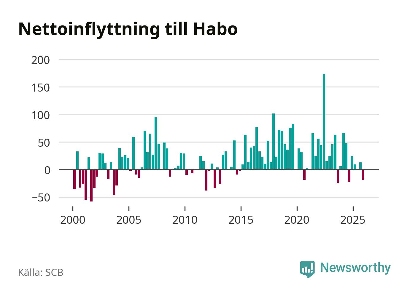 Under fjärde kvartalet 2025 flyttade 119 personer till kommunen medan 138 personer flyttade därifrån. Sedan seklets början har Habo haft ett positivt flyttnetto under nästan alla kvartal.
