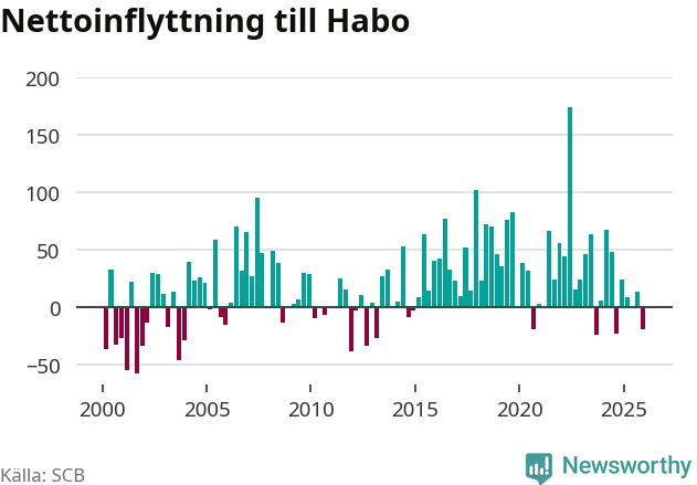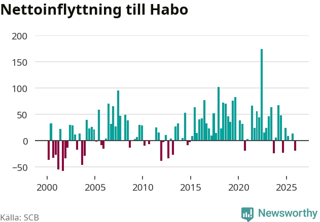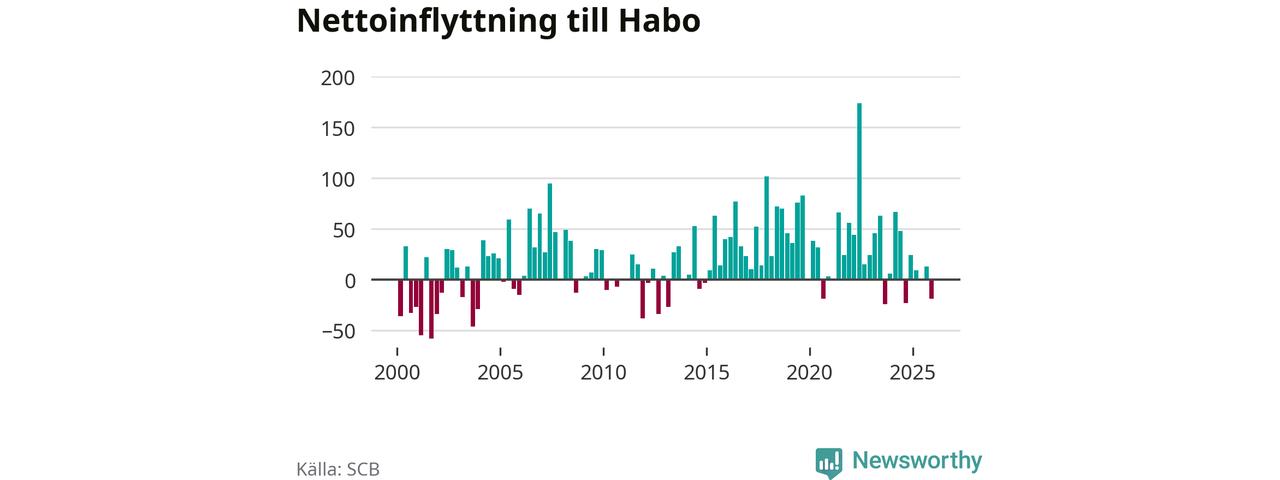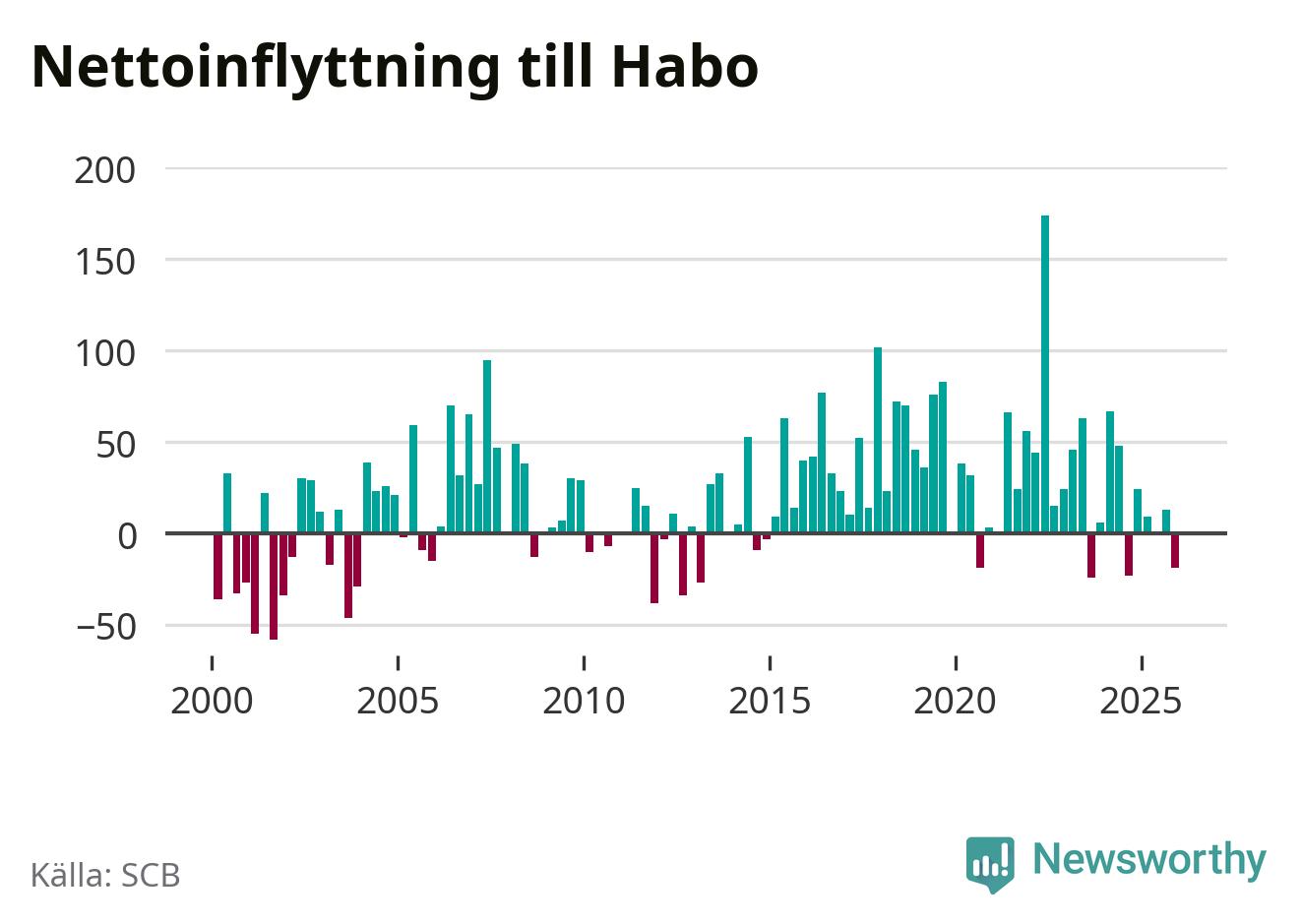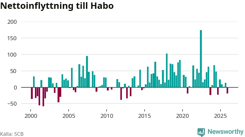 Under fjärde kvartalet 2025 flyttade 119 personer till kommunen medan 138 personer flyttade därifrån. Sedan seklets början har Habo haft ett positivt flyttnetto under nästan alla kvartal.