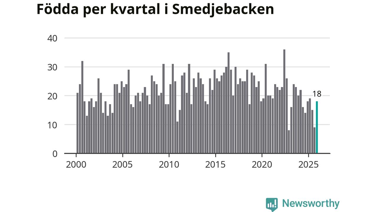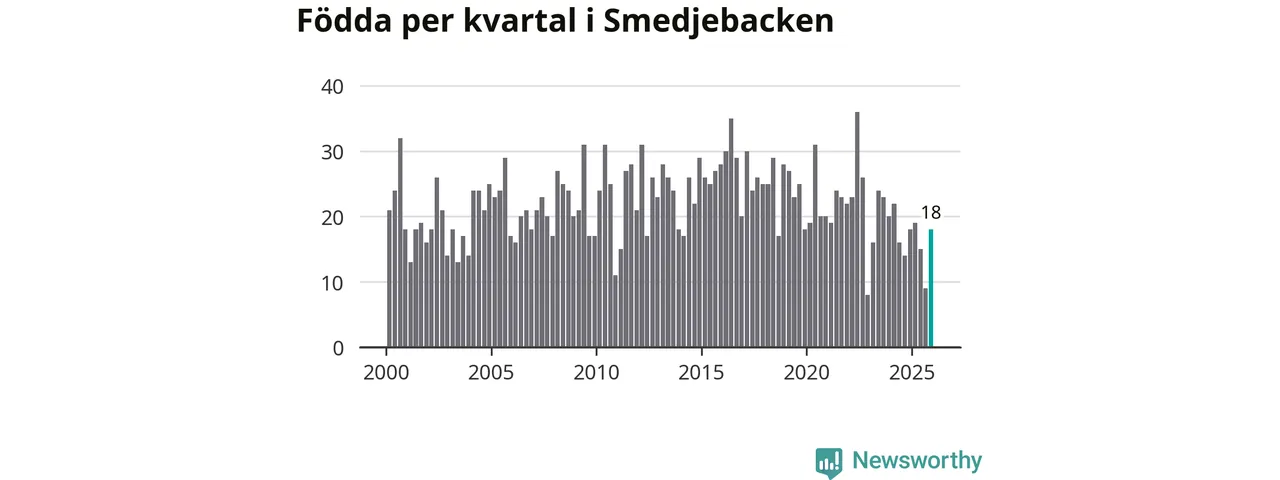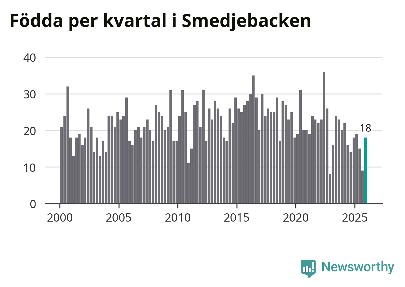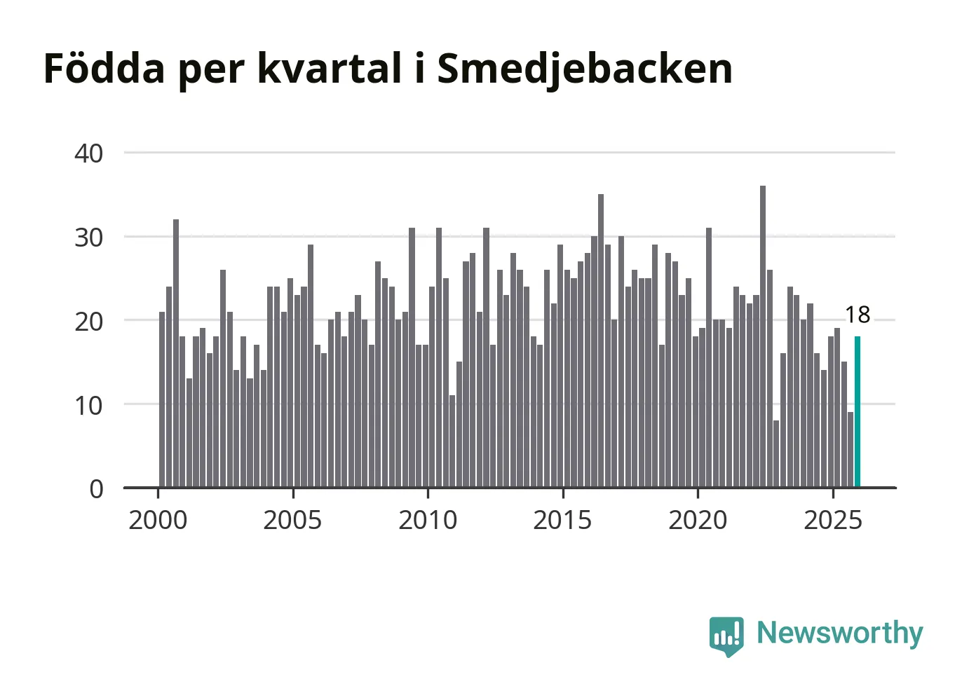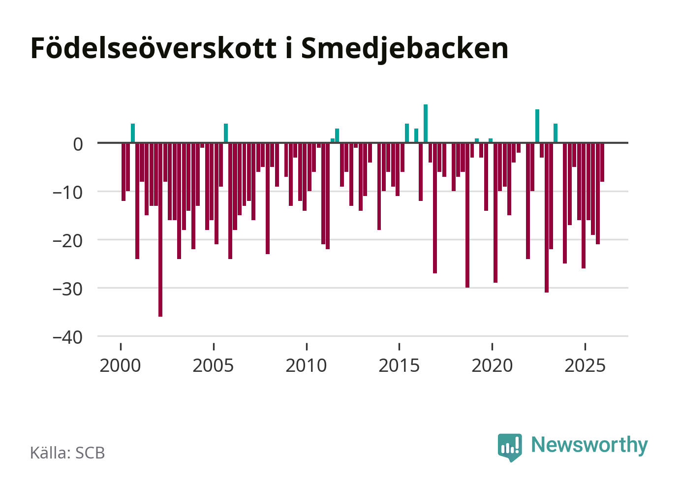 Enligt SCB:s siffror föddes 18 barn i Smedjebacken under det senaste kvartalet. Samtidigt avled 26 personer. Smedjebacken hade alltså ett negativt födelsenetto, vilket kommunen historiskt sett oftast har haft.