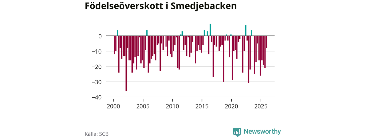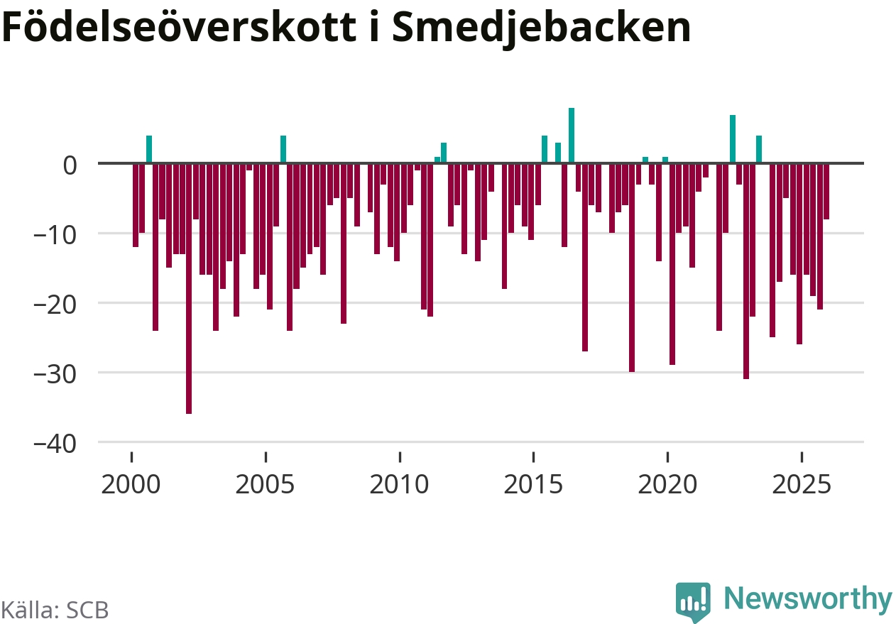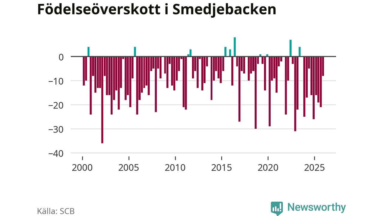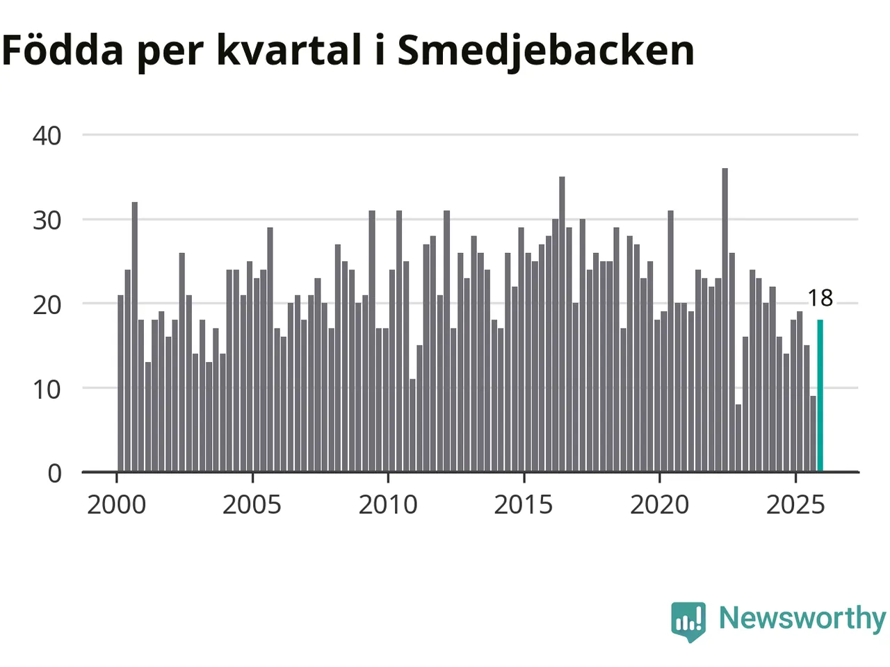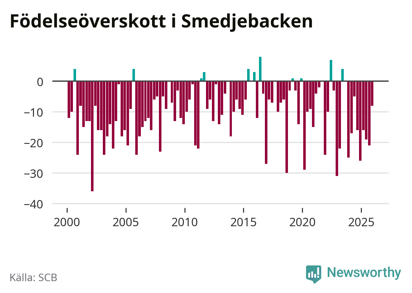 Enligt SCB:s siffror föddes 18 barn i Smedjebacken under det senaste kvartalet. Samtidigt avled 26 personer. Smedjebacken hade alltså ett negativt födelsenetto, vilket kommunen historiskt sett oftast har haft.