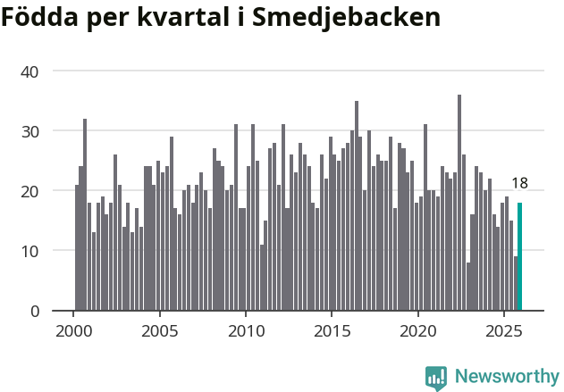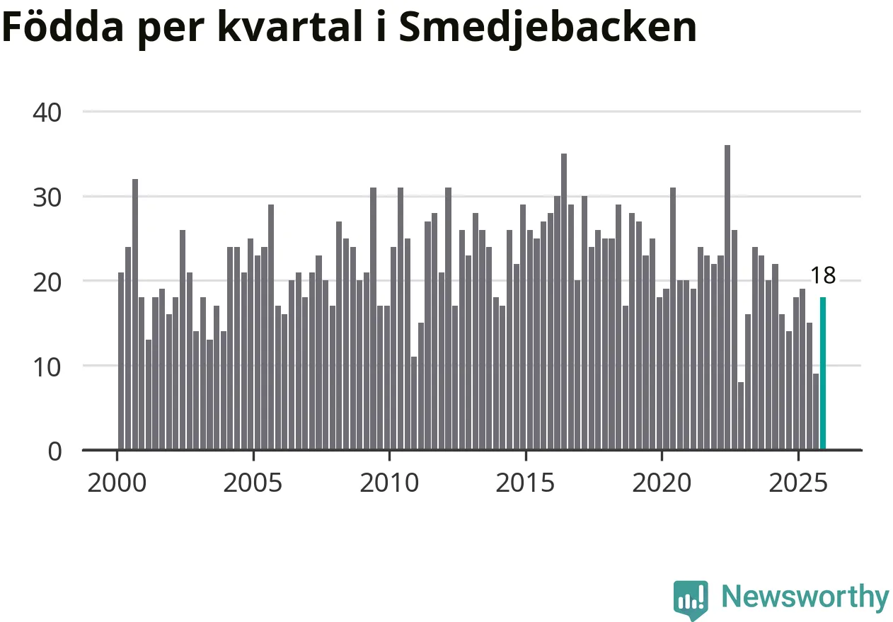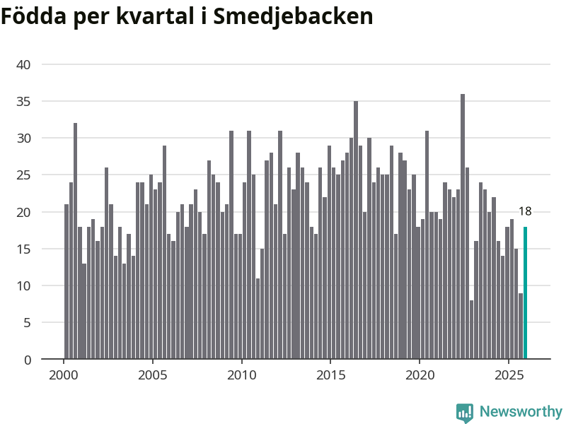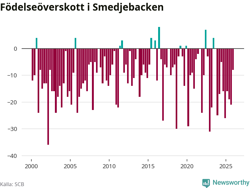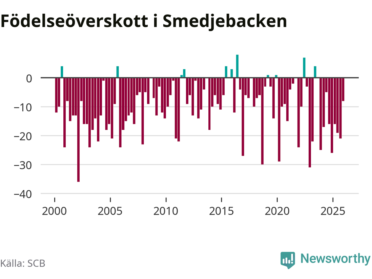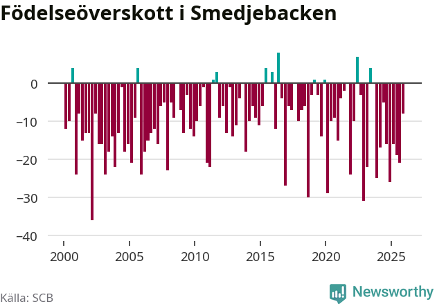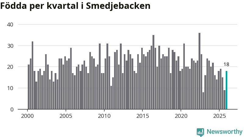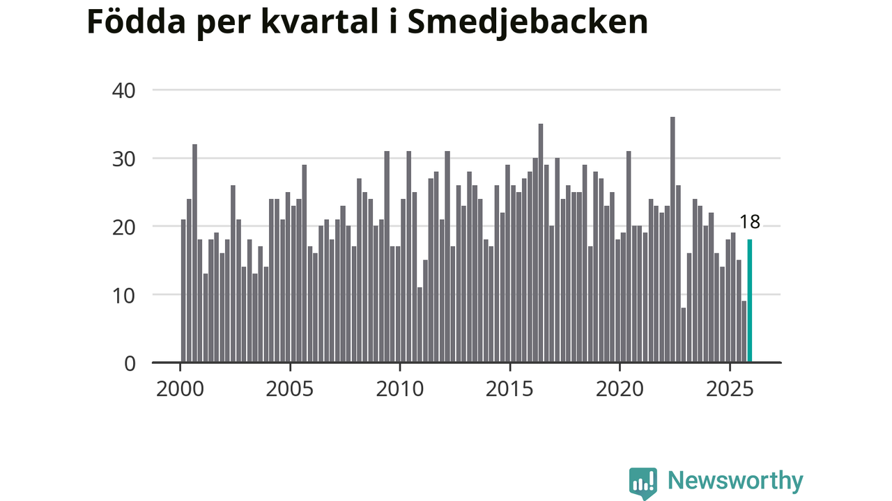 Enligt SCB:s siffror föddes 18 barn i Smedjebacken under det senaste kvartalet. Samtidigt avled 26 personer. Smedjebacken hade alltså ett negativt födelsenetto, vilket kommunen historiskt sett oftast har haft.