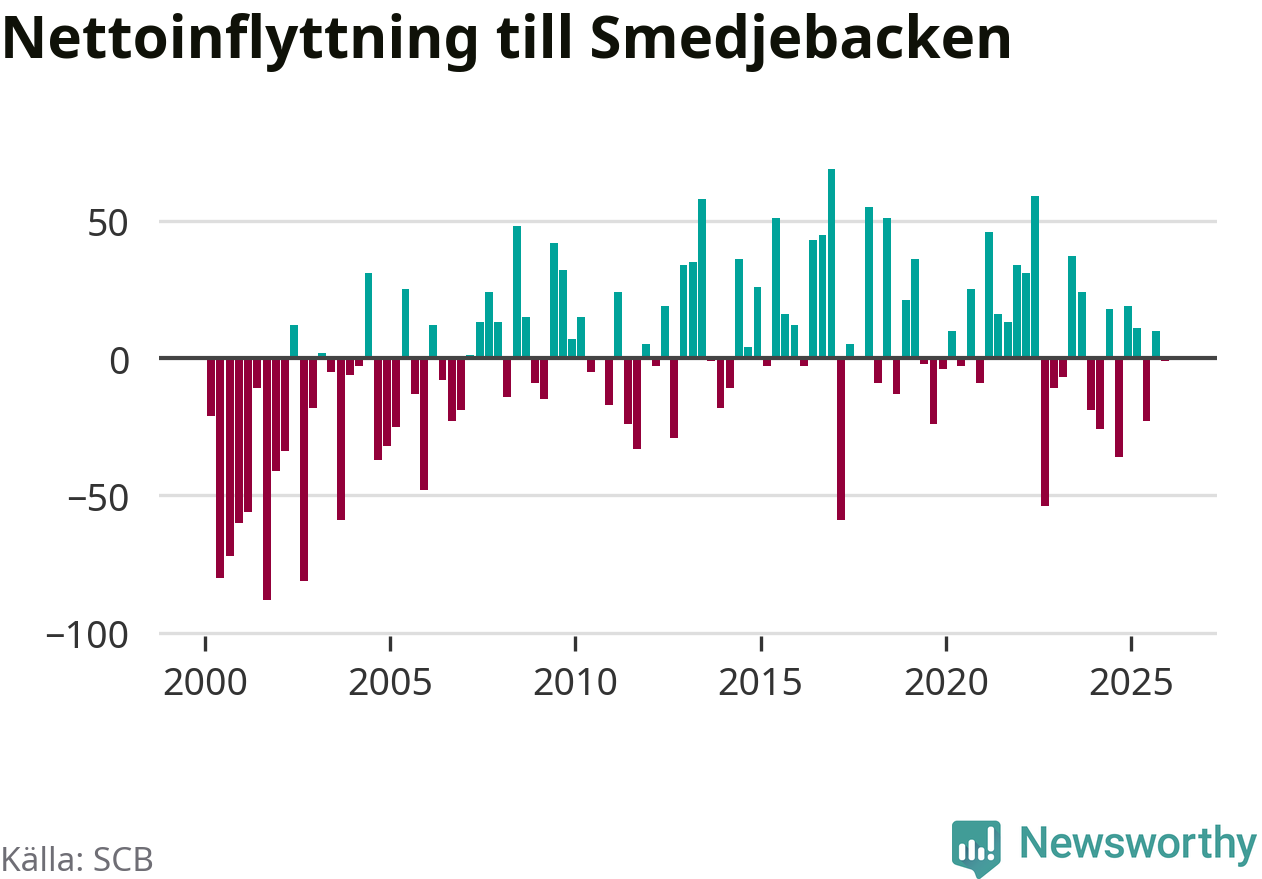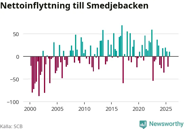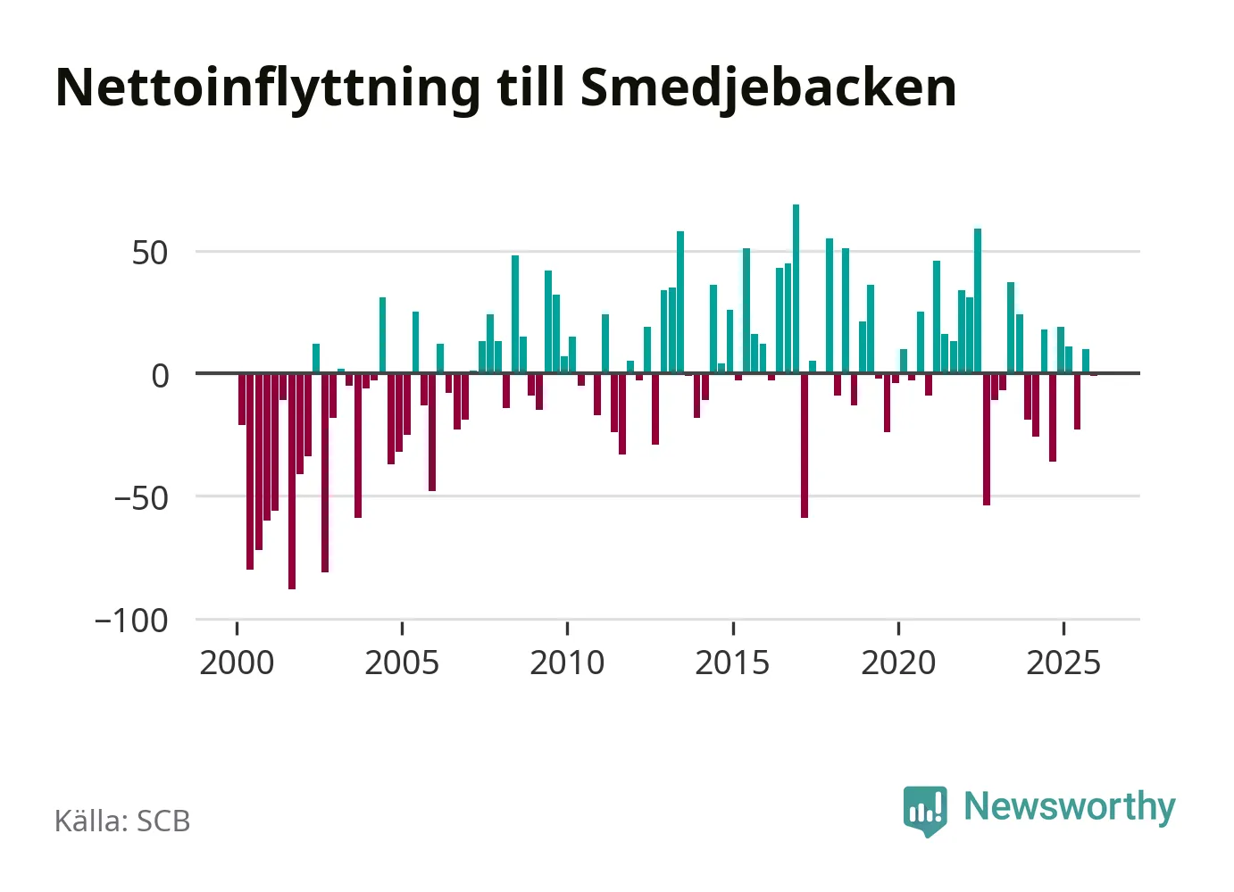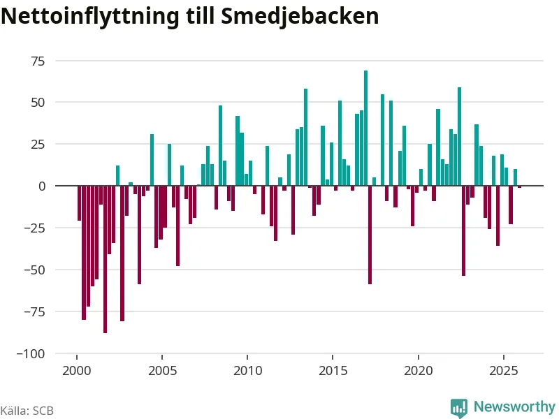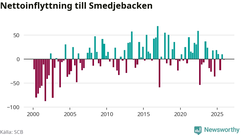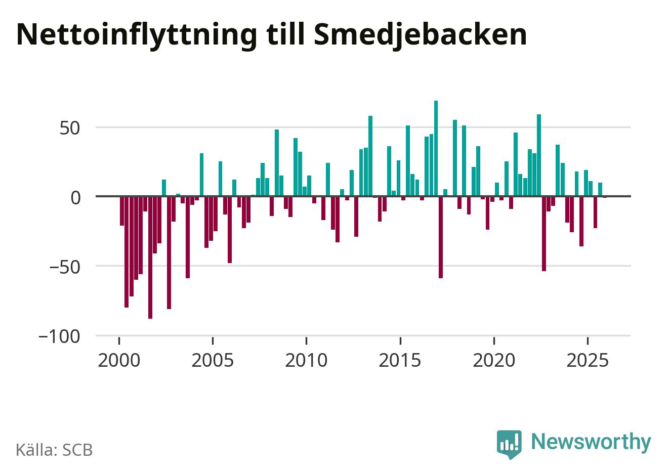 Under fjärde kvartalet 2025 flyttade 126 personer till kommunen medan 127 personer flyttade därifrån. Skillnaden mellan antalet in- och utflyttade är så liten att den lika gärna kan bero på SCB:s slumpmässiga brus. Sedan seklets början har Smedjebacken oftast haft ett positivt flyttnetto.