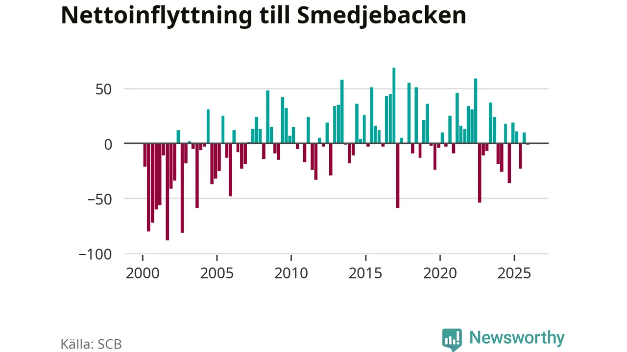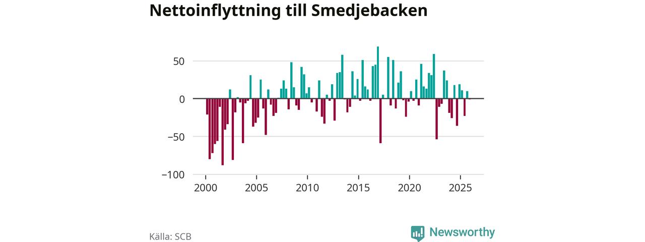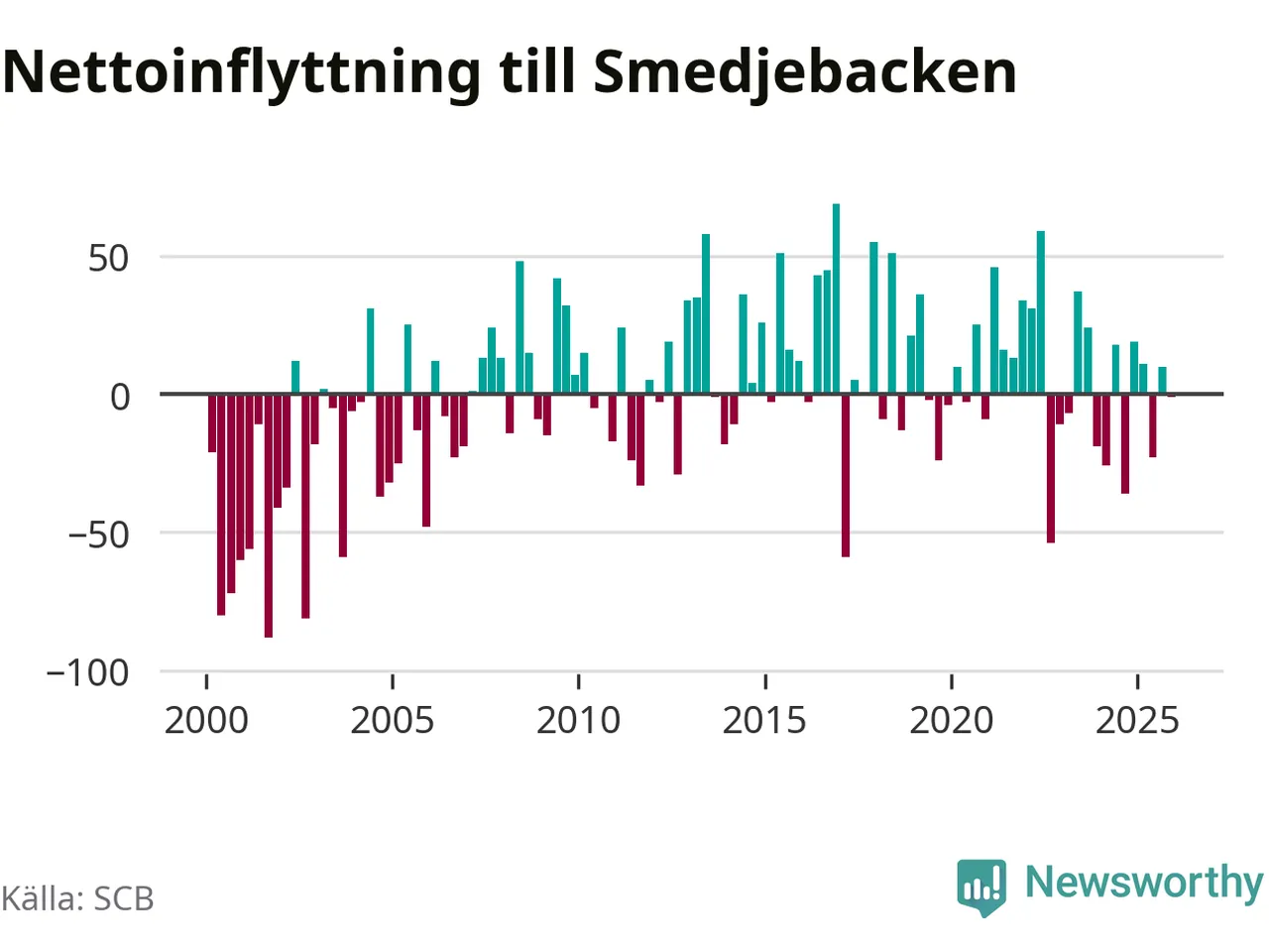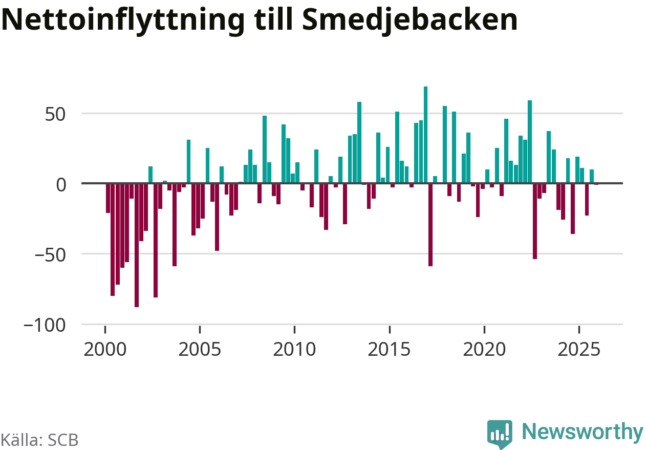 Under fjärde kvartalet 2025 flyttade 126 personer till kommunen medan 127 personer flyttade därifrån. Skillnaden mellan antalet in- och utflyttade är så liten att den lika gärna kan bero på SCB:s slumpmässiga brus. Sedan seklets början har Smedjebacken oftast haft ett positivt flyttnetto.