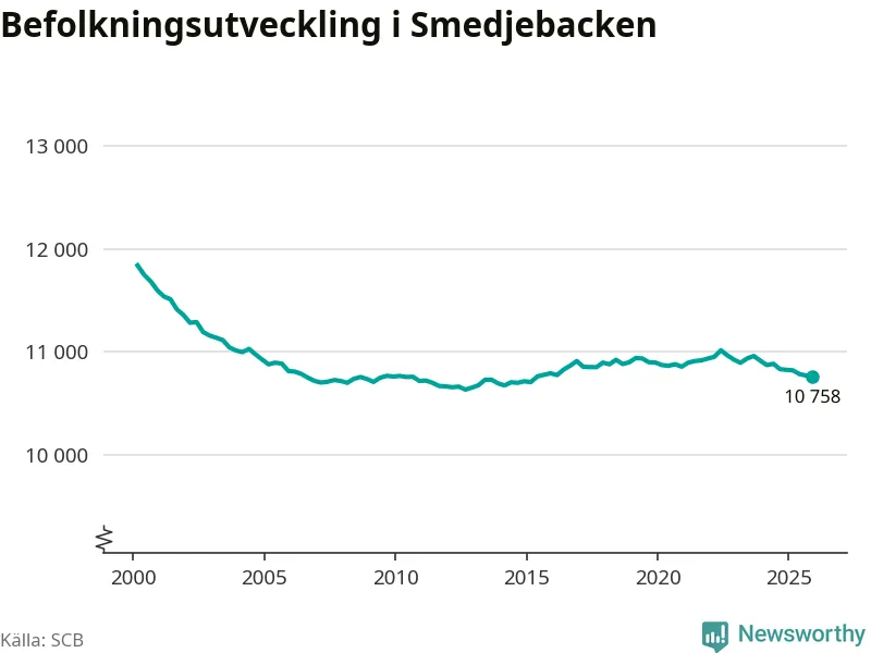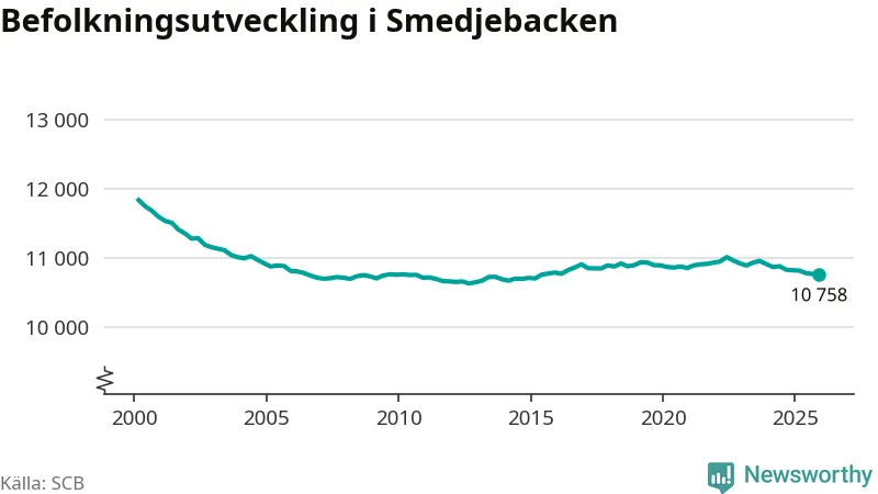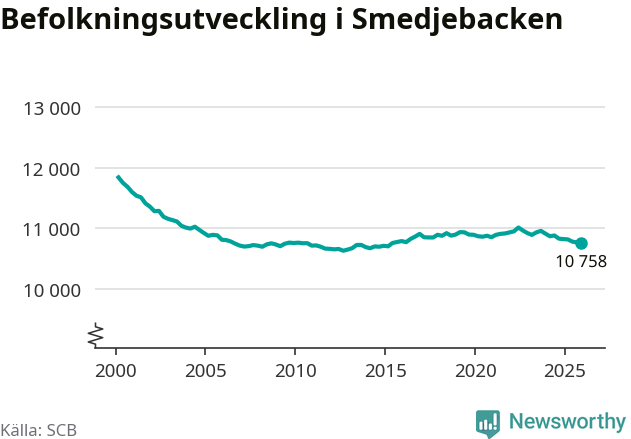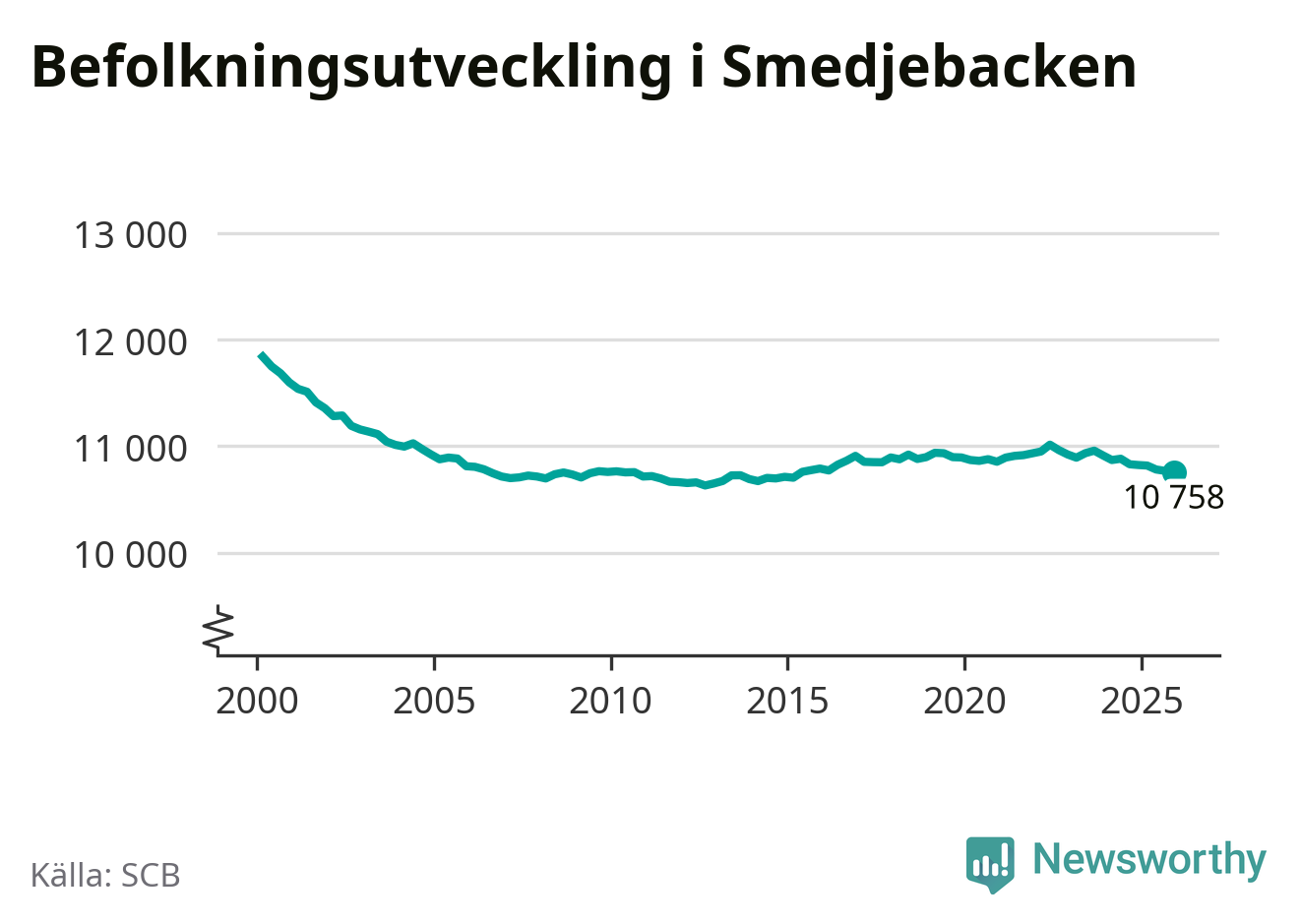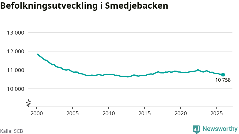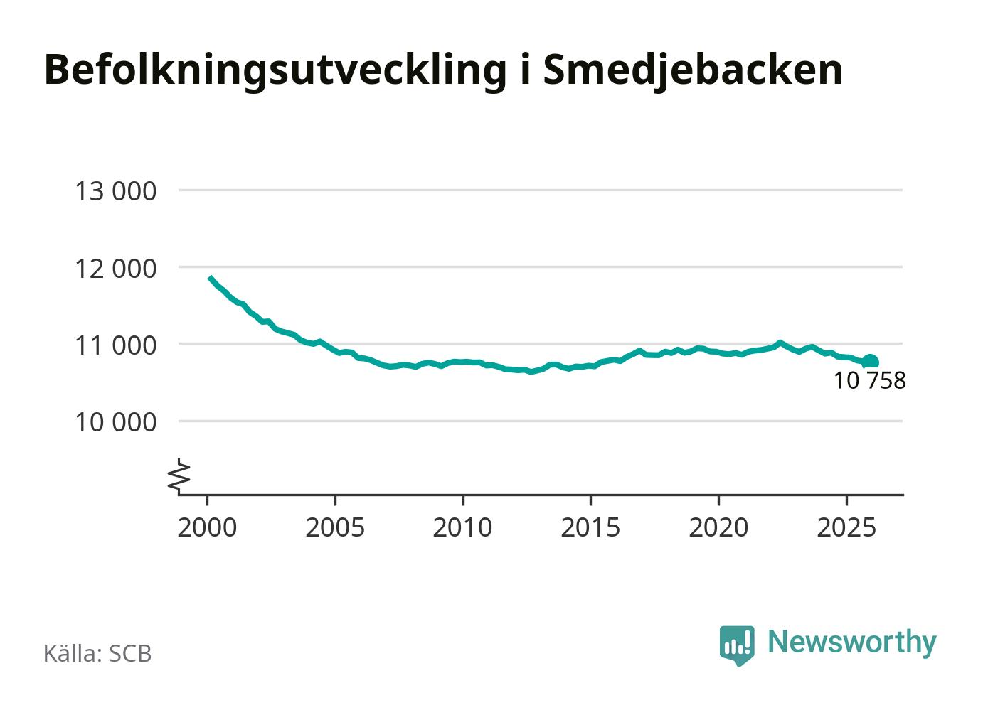 Jämfört med för ett år sedan har befolkningen i Smedjebacken minskat med knappt 70 personer – vilket motsvarar en nedgång på 0,6 procent. Sedan millennieskiftet har folkmängden minskat med runt 1 080 personer, eller nio procent.