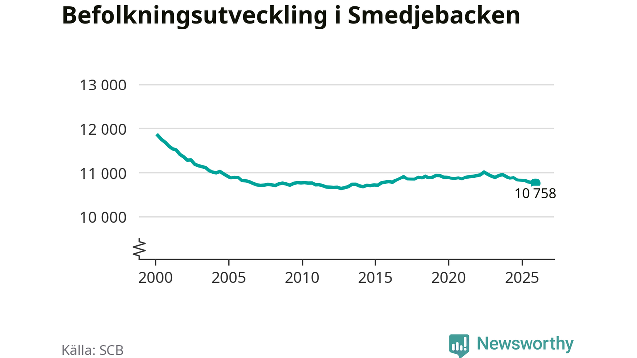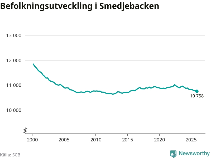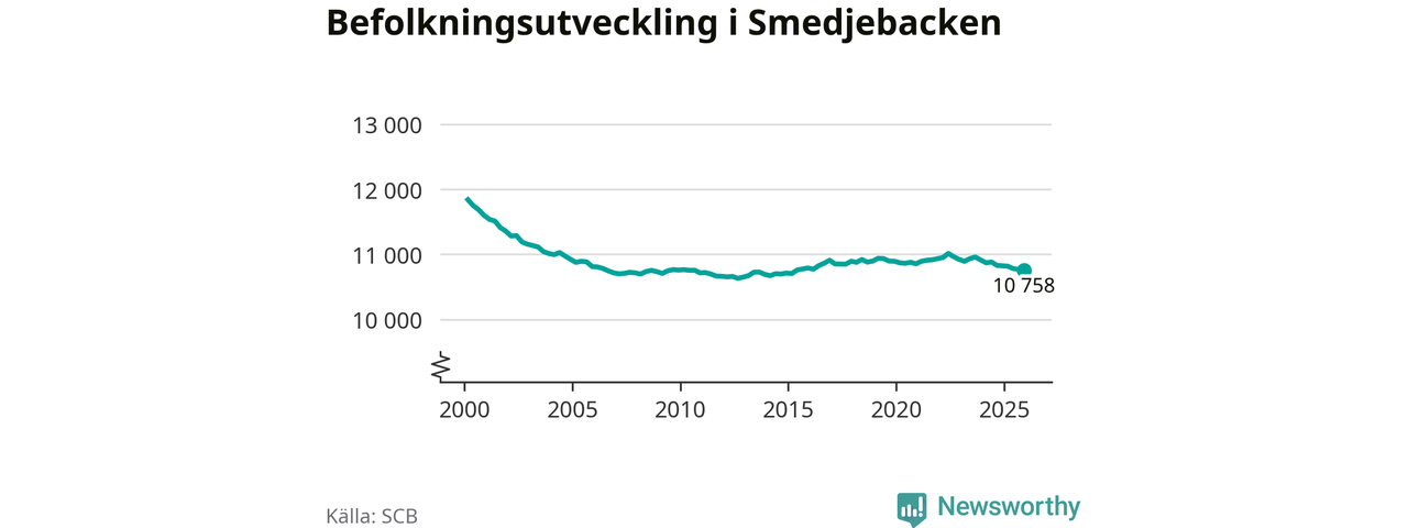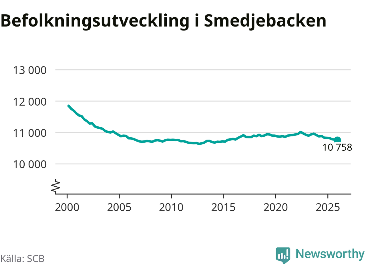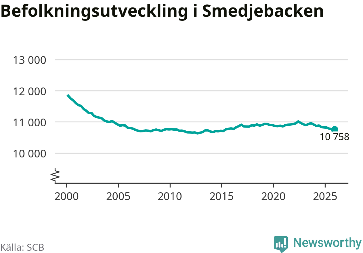 Jämfört med för ett år sedan har befolkningen i Smedjebacken minskat med knappt 70 personer – vilket motsvarar en nedgång på 0,6 procent. Sedan millennieskiftet har folkmängden minskat med runt 1 080 personer, eller nio procent.