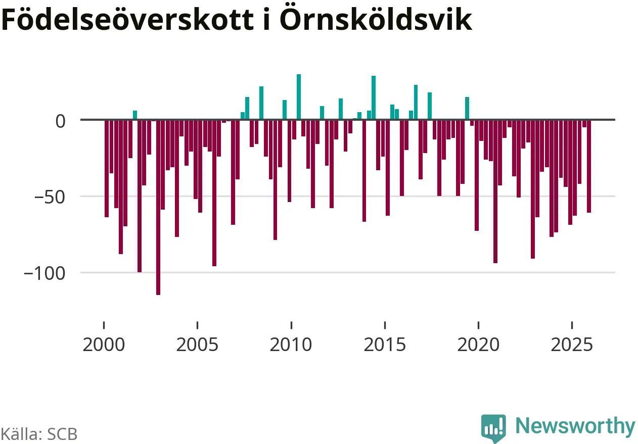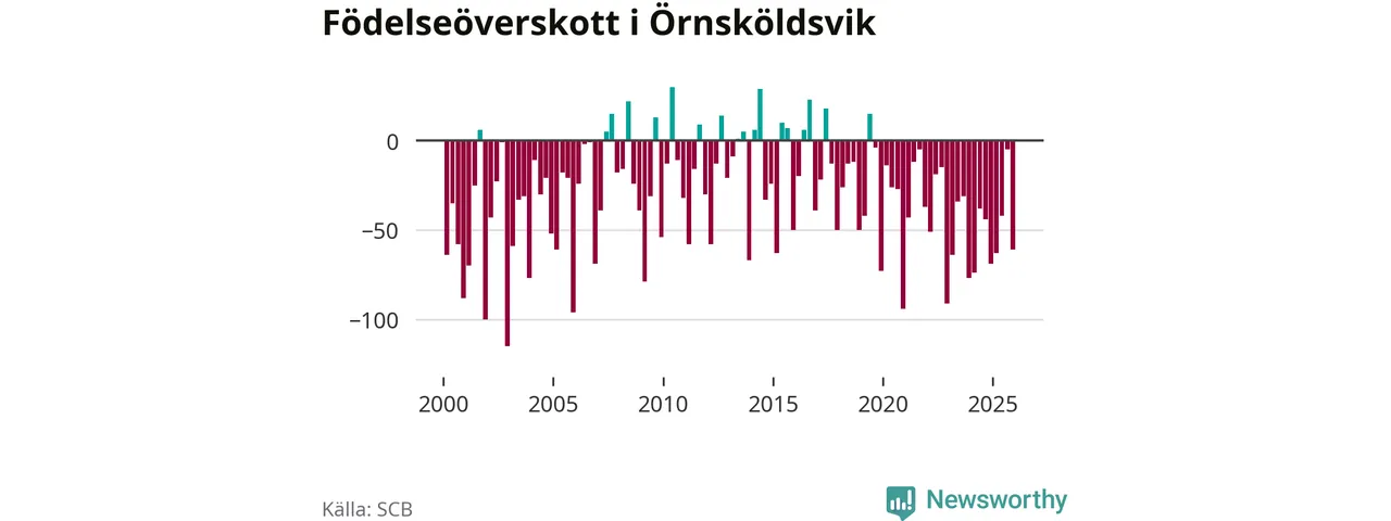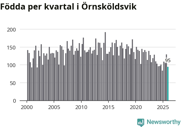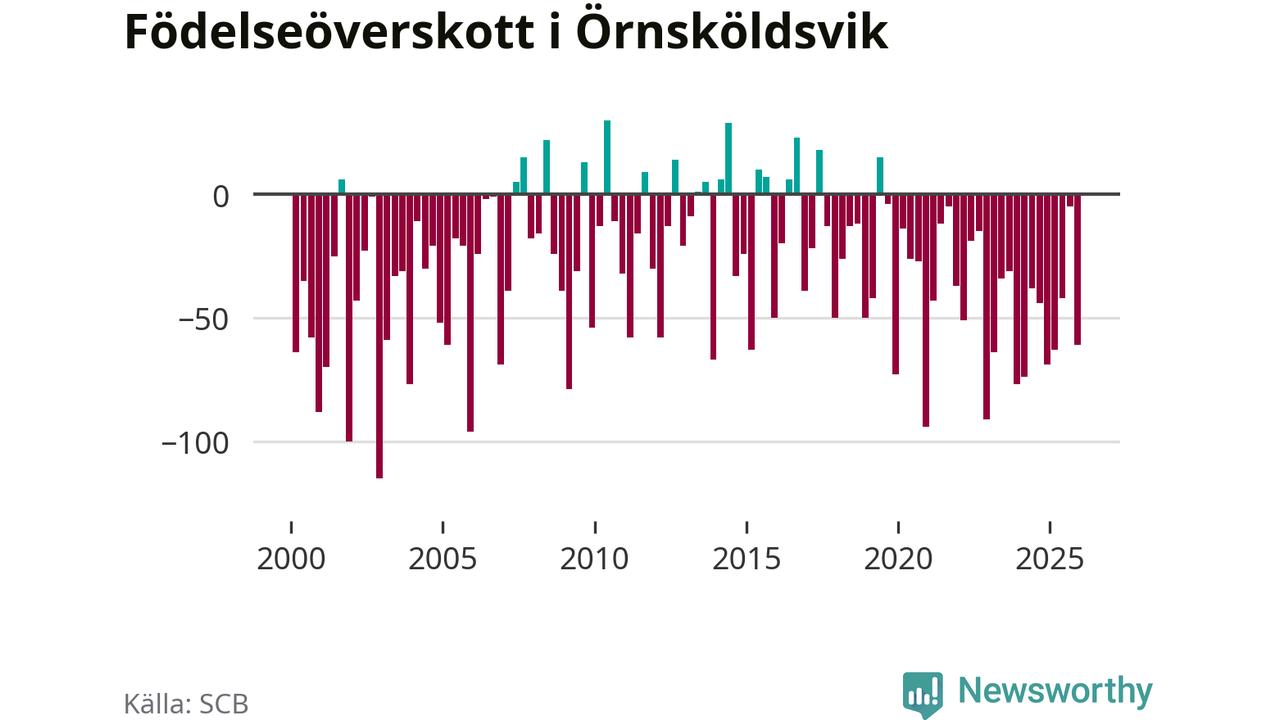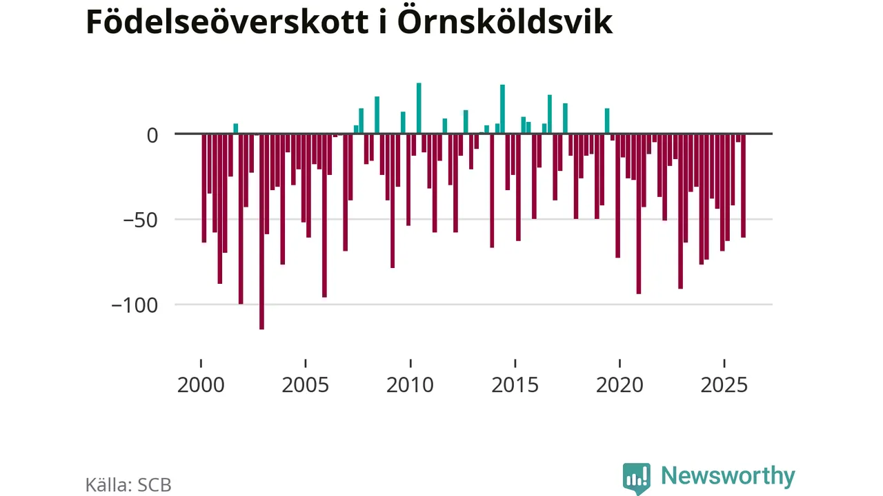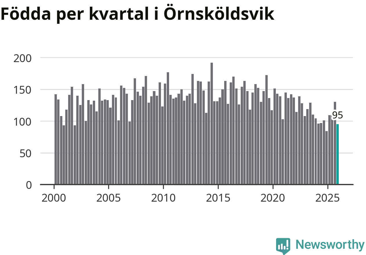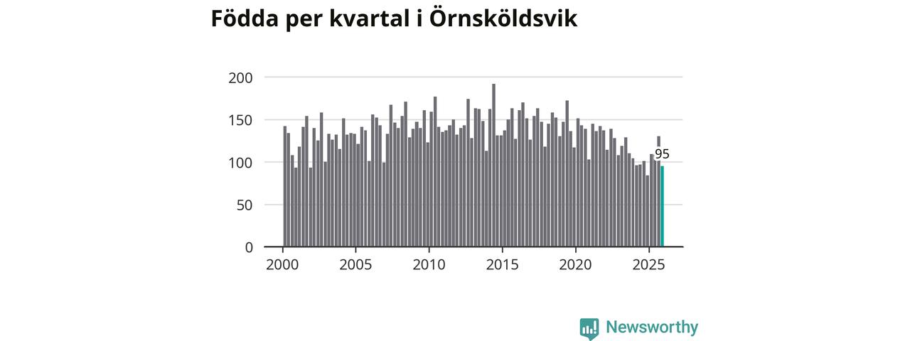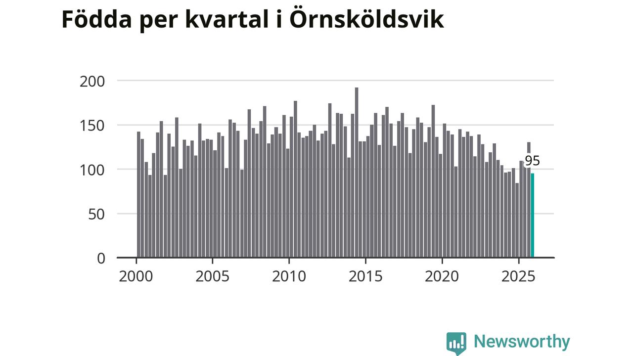Enligt SCB:s siffror föddes 95 barn i Örnsköldsvik under det senaste kvartalet. Samtidigt avled 156 personer. Örnsköldsvik hade alltså ett negativt födelsenetto, vilket kommunen historiskt sett nästan alltid har haft.