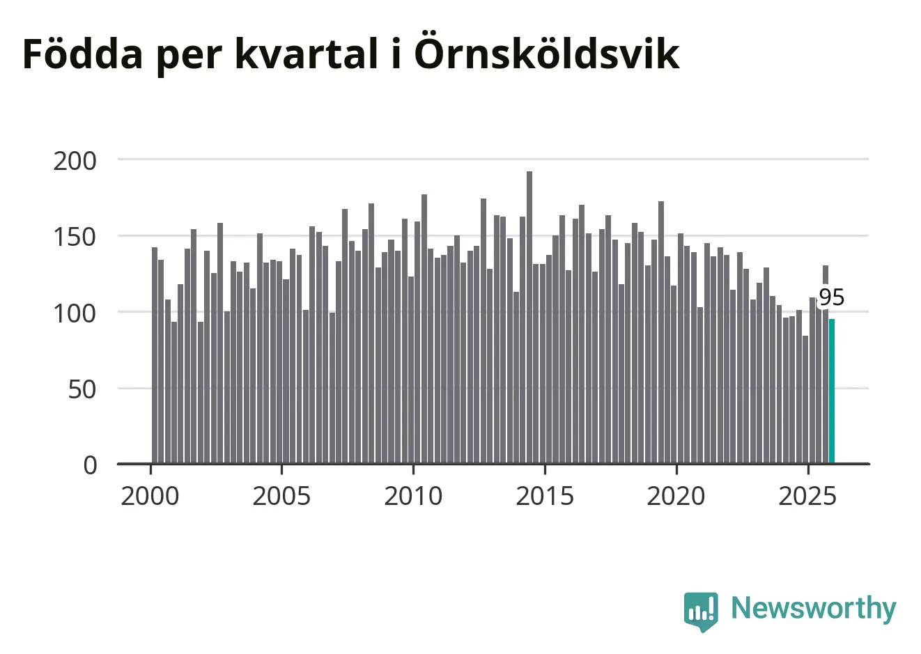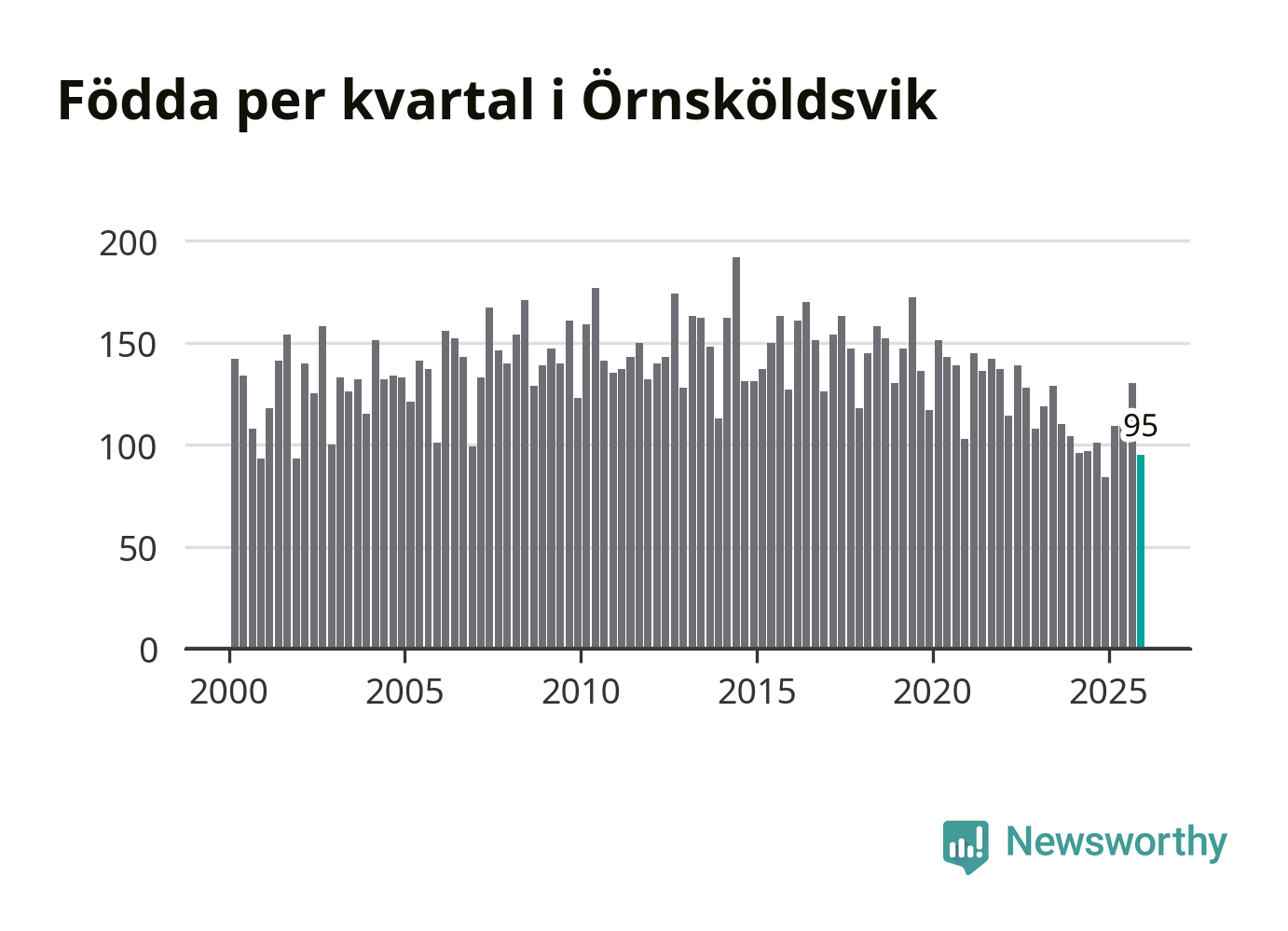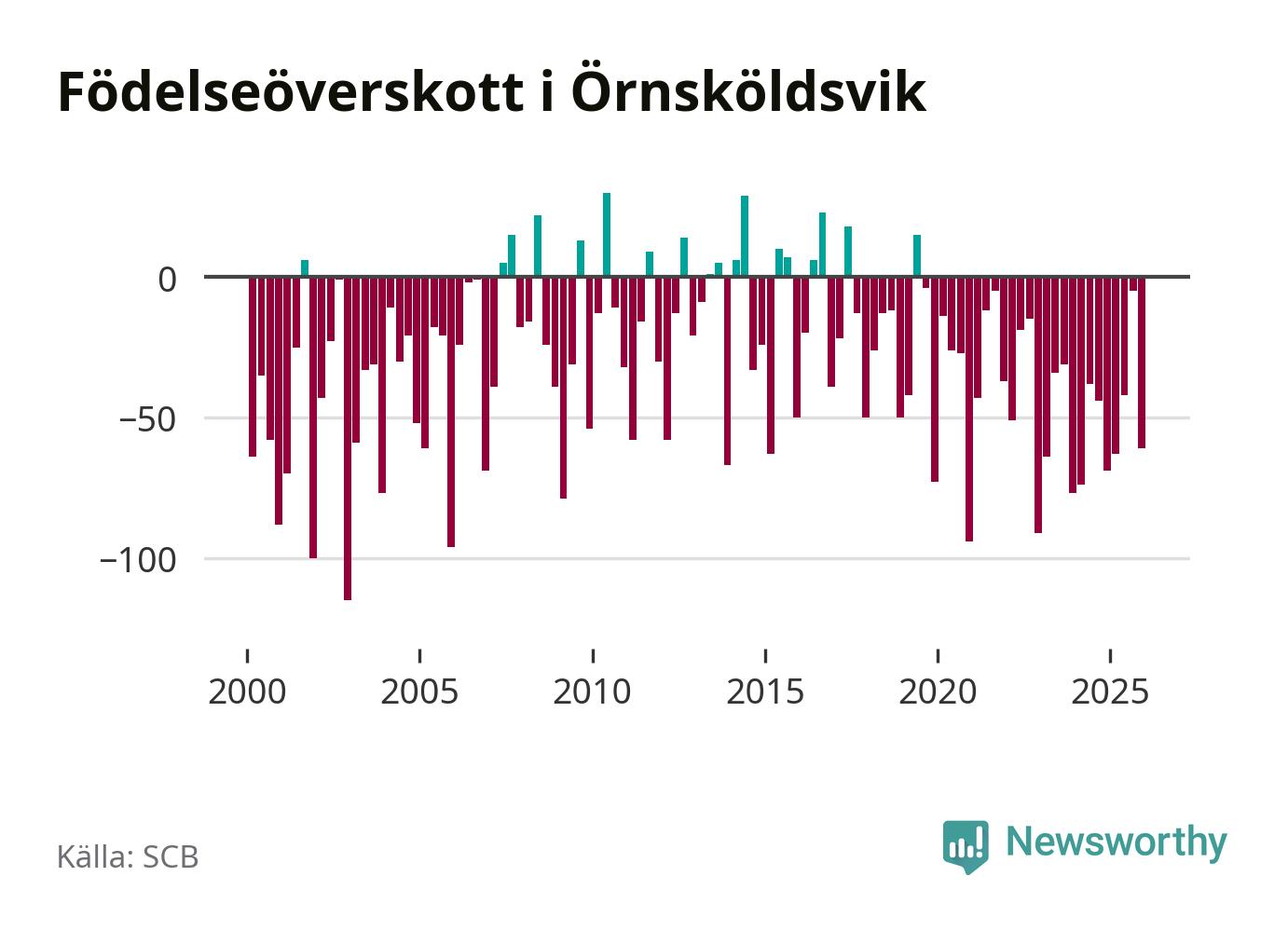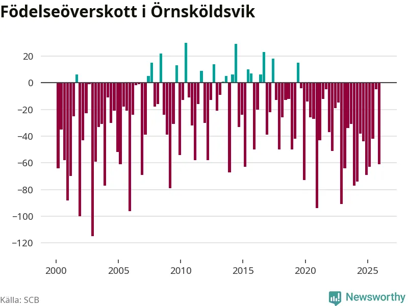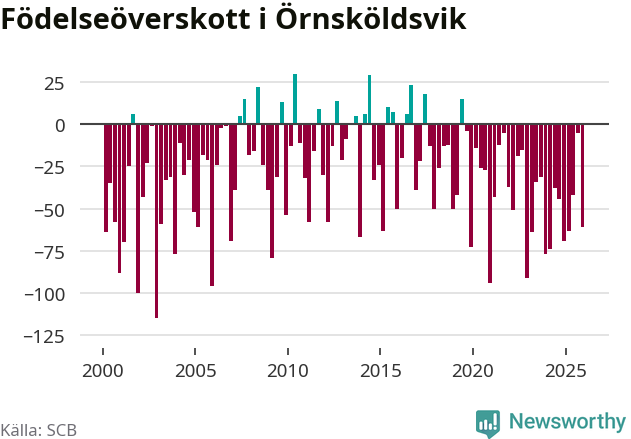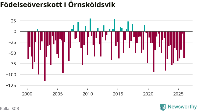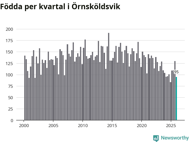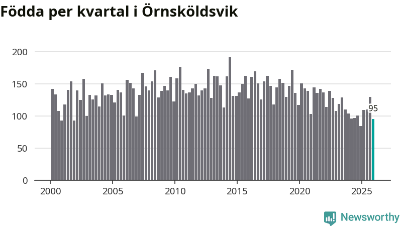 Enligt SCB:s siffror föddes 95 barn i Örnsköldsvik under det senaste kvartalet. Samtidigt avled 156 personer. Örnsköldsvik hade alltså ett negativt födelsenetto, vilket kommunen historiskt sett nästan alltid har haft.