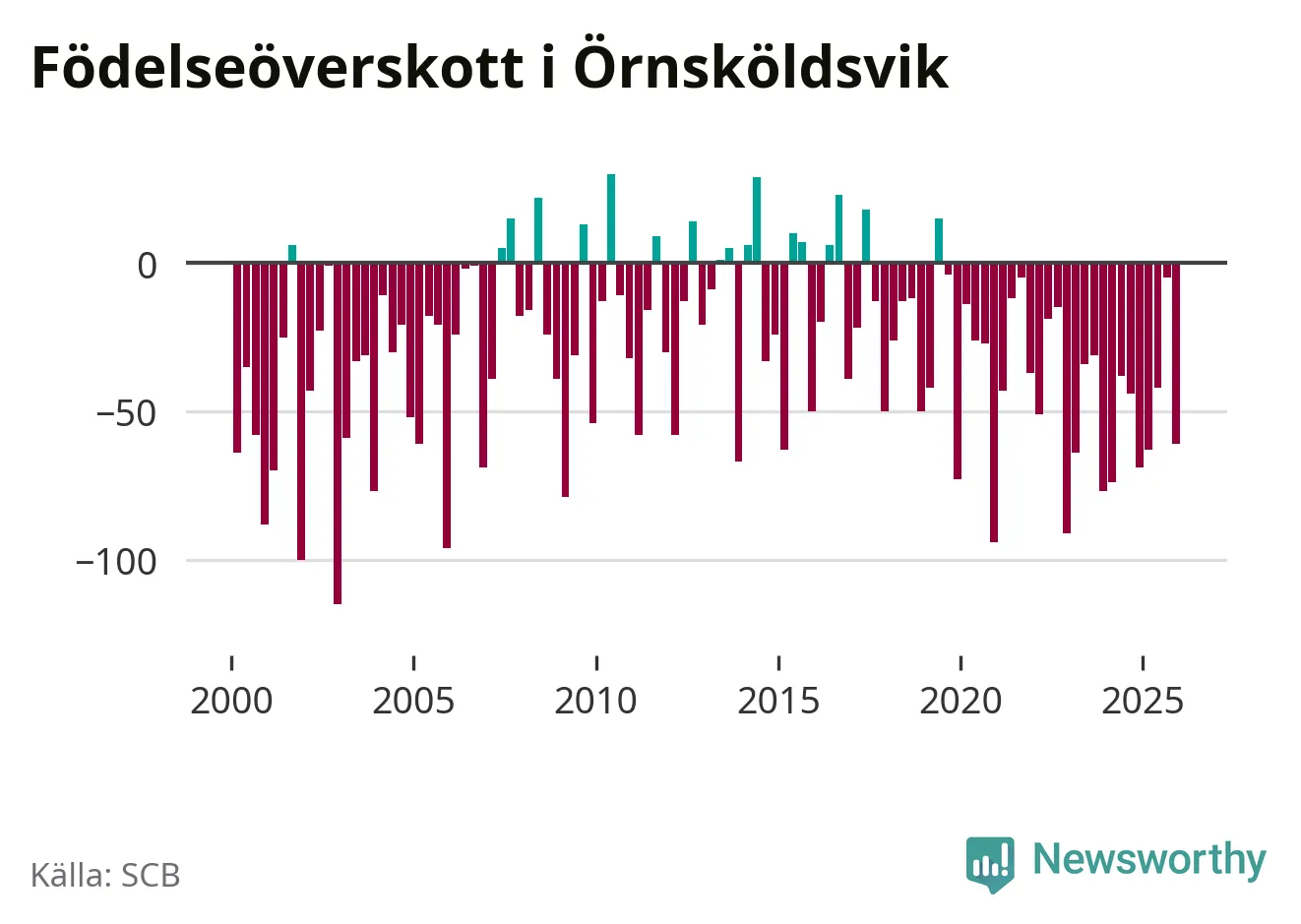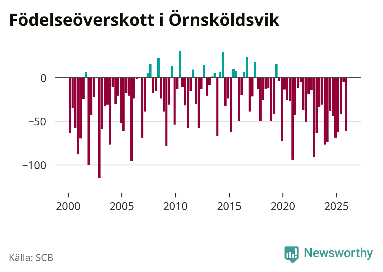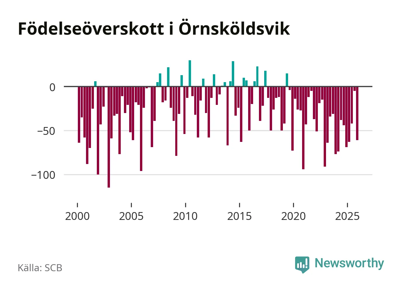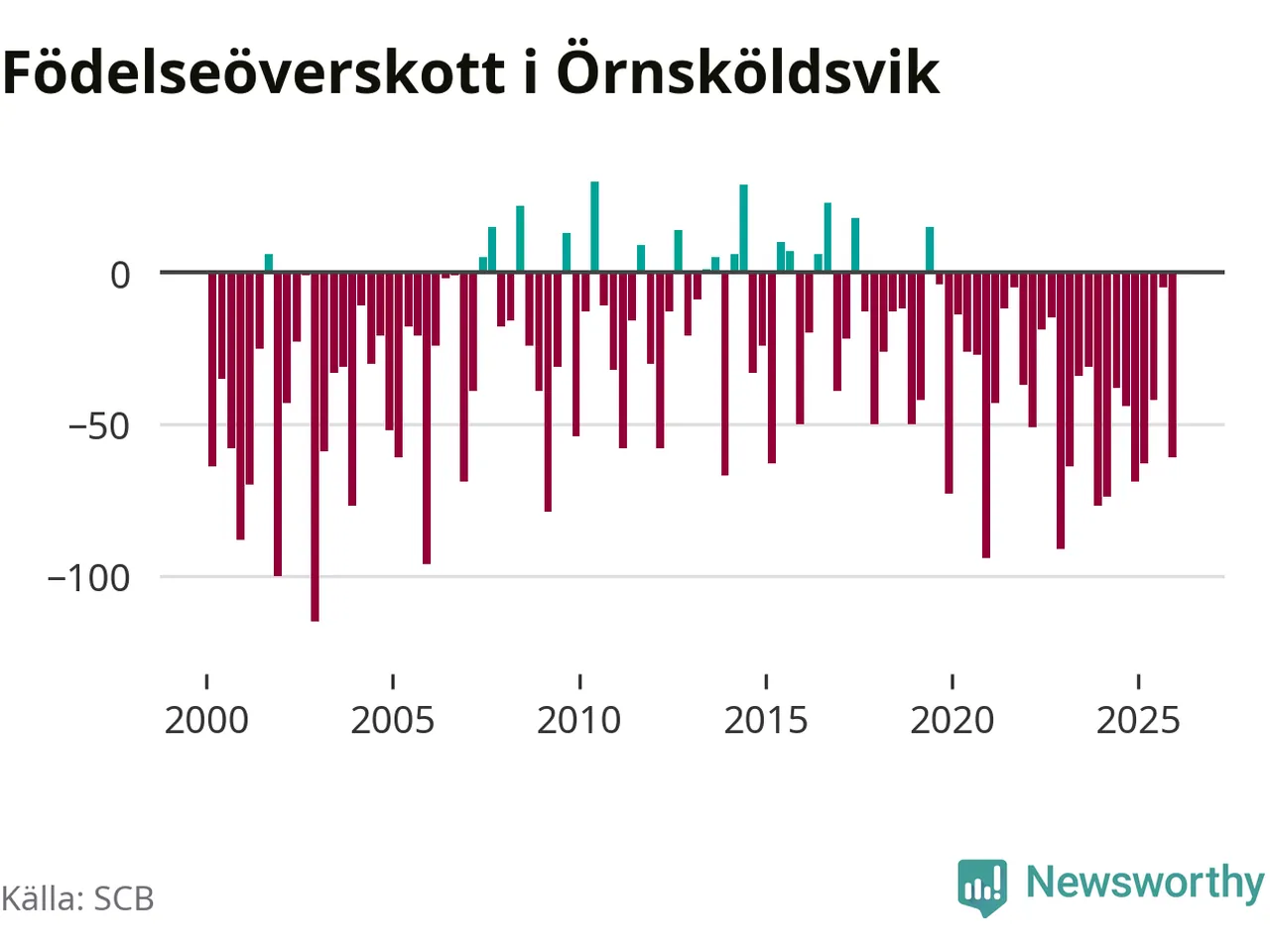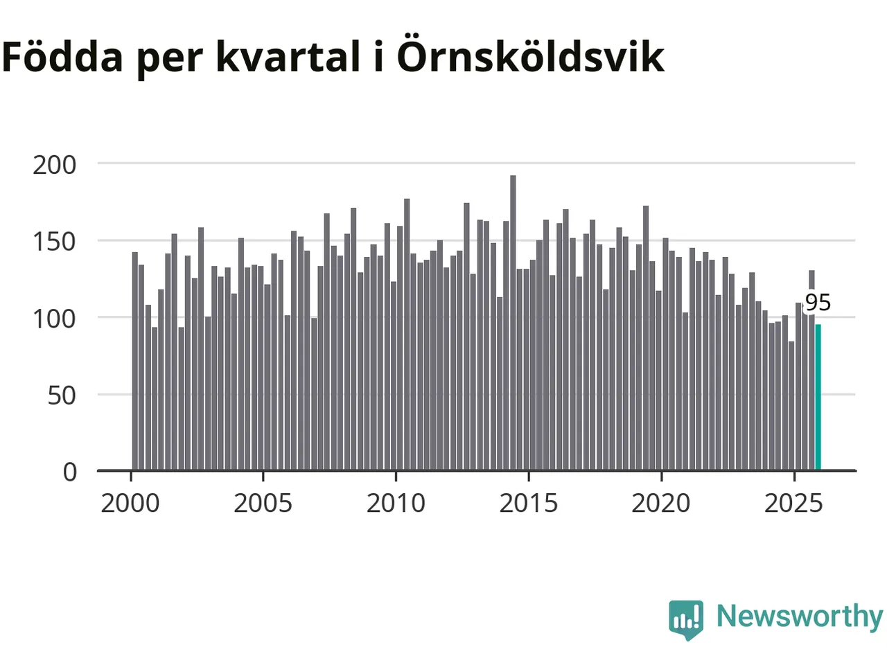Enligt SCB:s siffror föddes 95 barn i Örnsköldsvik under det senaste kvartalet. Samtidigt avled 156 personer. Örnsköldsvik hade alltså ett negativt födelsenetto, vilket kommunen historiskt sett nästan alltid har haft.