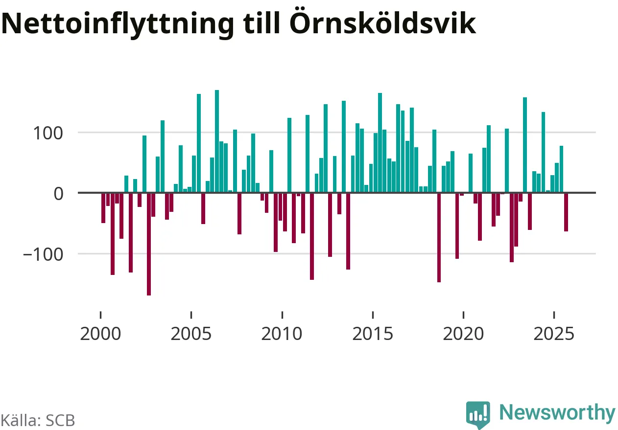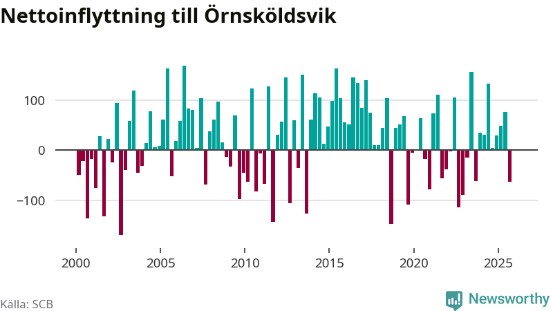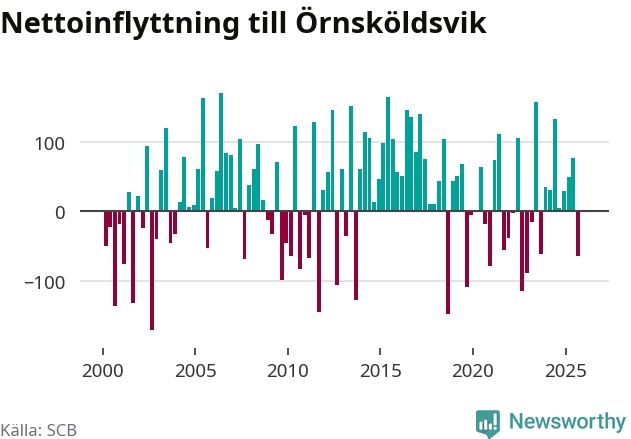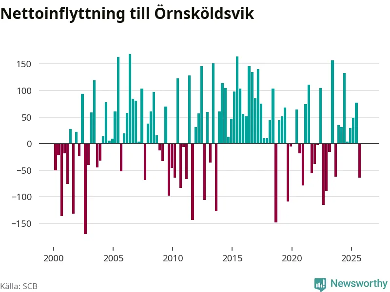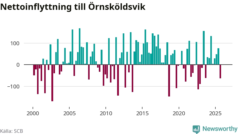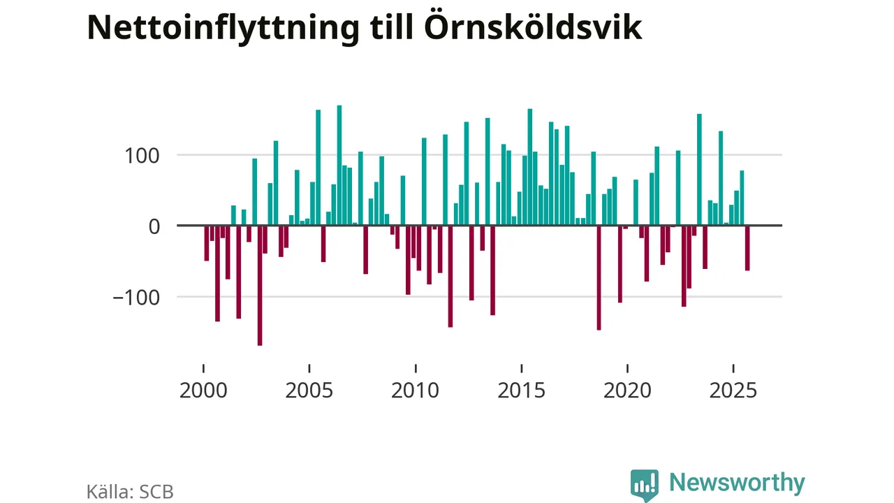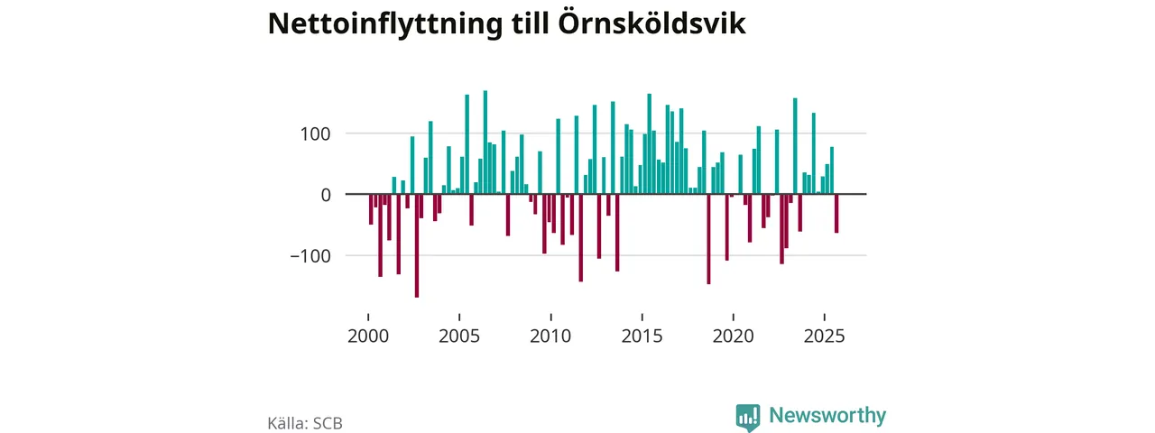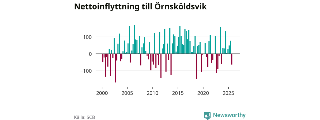 Under fjärde kvartalet 2025 flyttade 303 personer till kommunen medan 304 personer flyttade därifrån. Skillnaden mellan antalet in- och utflyttade är så liten att den lika gärna kan bero på SCB:s slumpmässiga brus. Sedan seklets början har Örnsköldsvik oftast haft ett positivt flyttnetto.