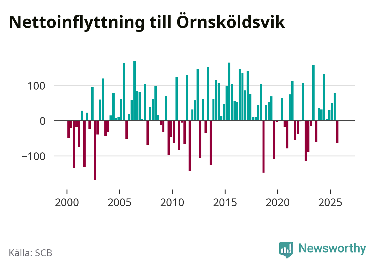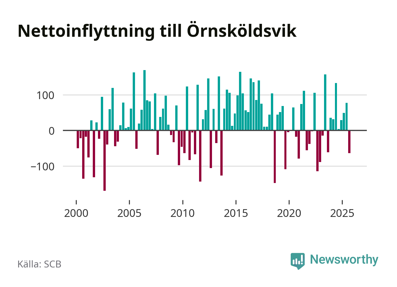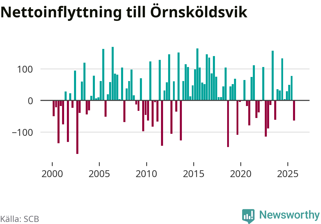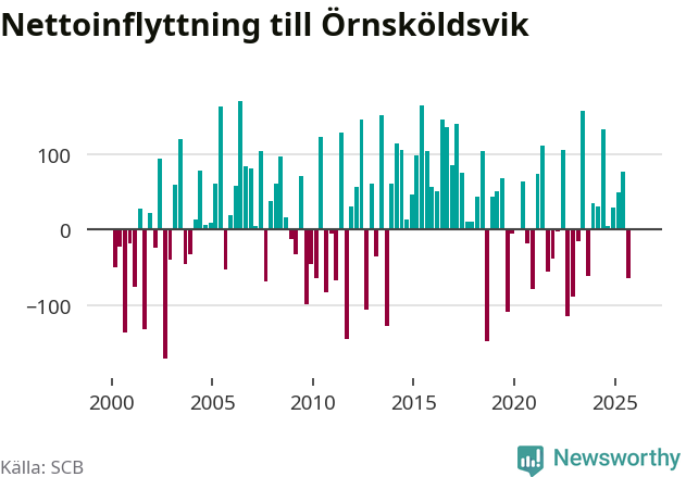 Under fjärde kvartalet 2025 flyttade 303 personer till kommunen medan 304 personer flyttade därifrån. Skillnaden mellan antalet in- och utflyttade är så liten att den lika gärna kan bero på SCB:s slumpmässiga brus. Sedan seklets början har Örnsköldsvik oftast haft ett positivt flyttnetto.