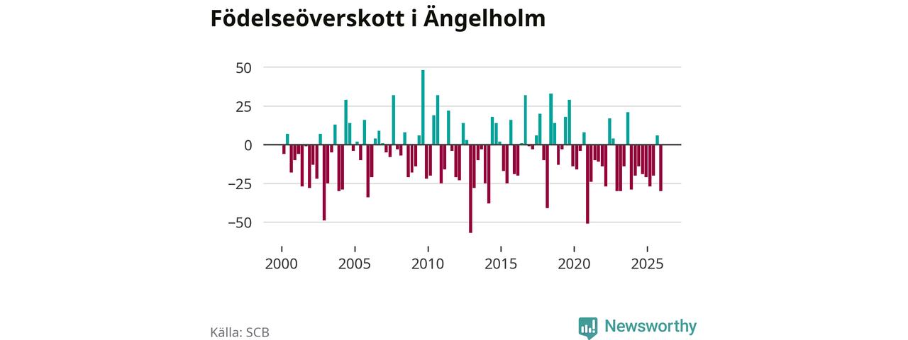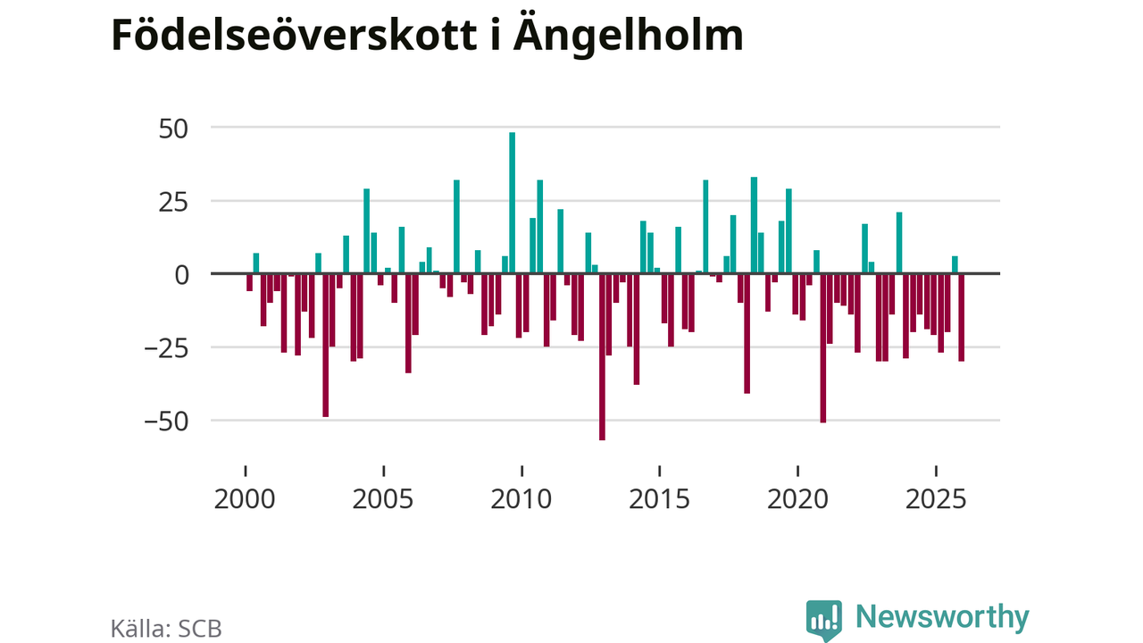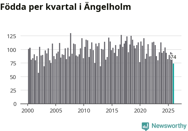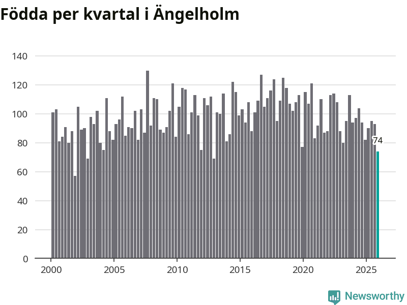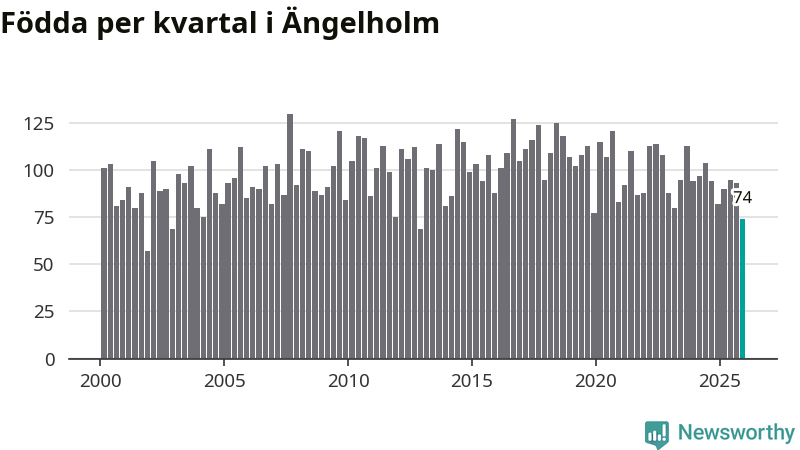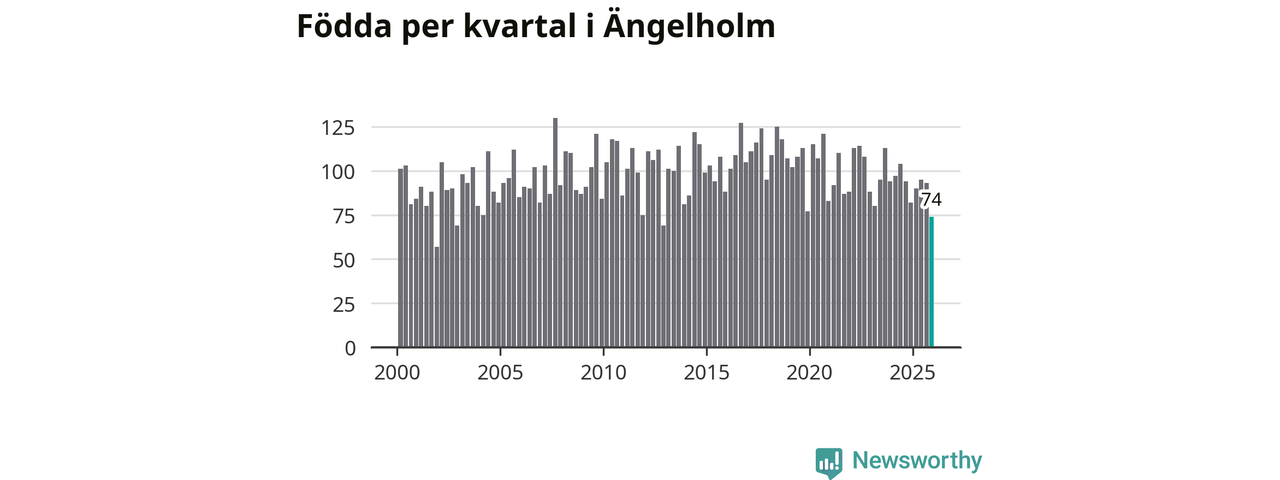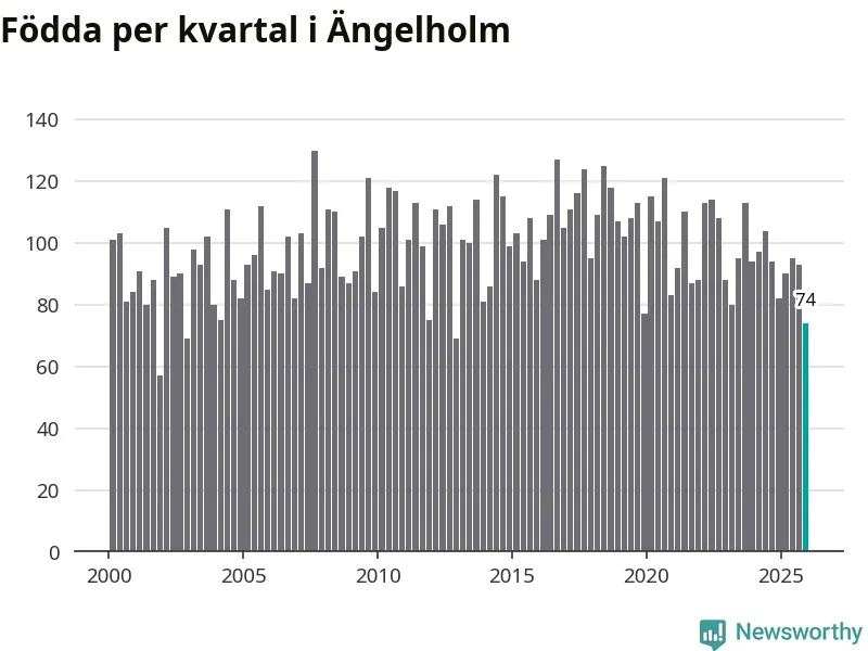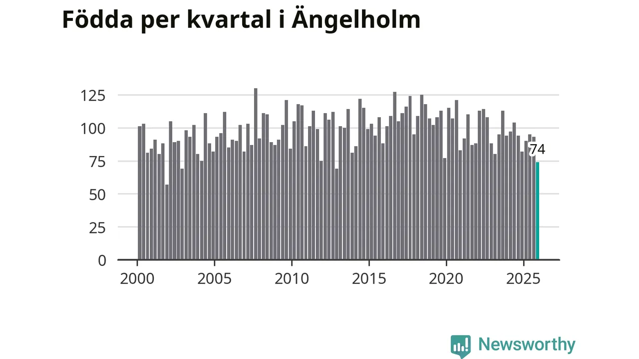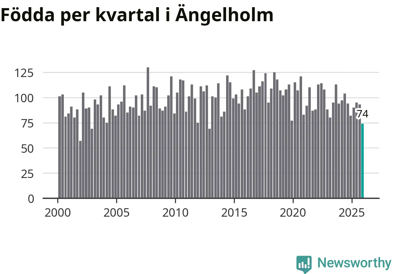 Enligt SCB:s siffror föddes 74 barn i Ängelholm under det senaste kvartalet. Samtidigt avled 104 personer. Ängelholm hade alltså ett negativt födelsenetto, vilket kommunen historiskt sett oftast har haft.
