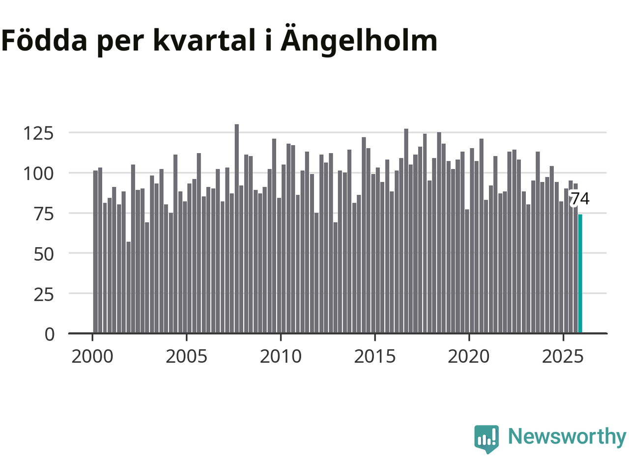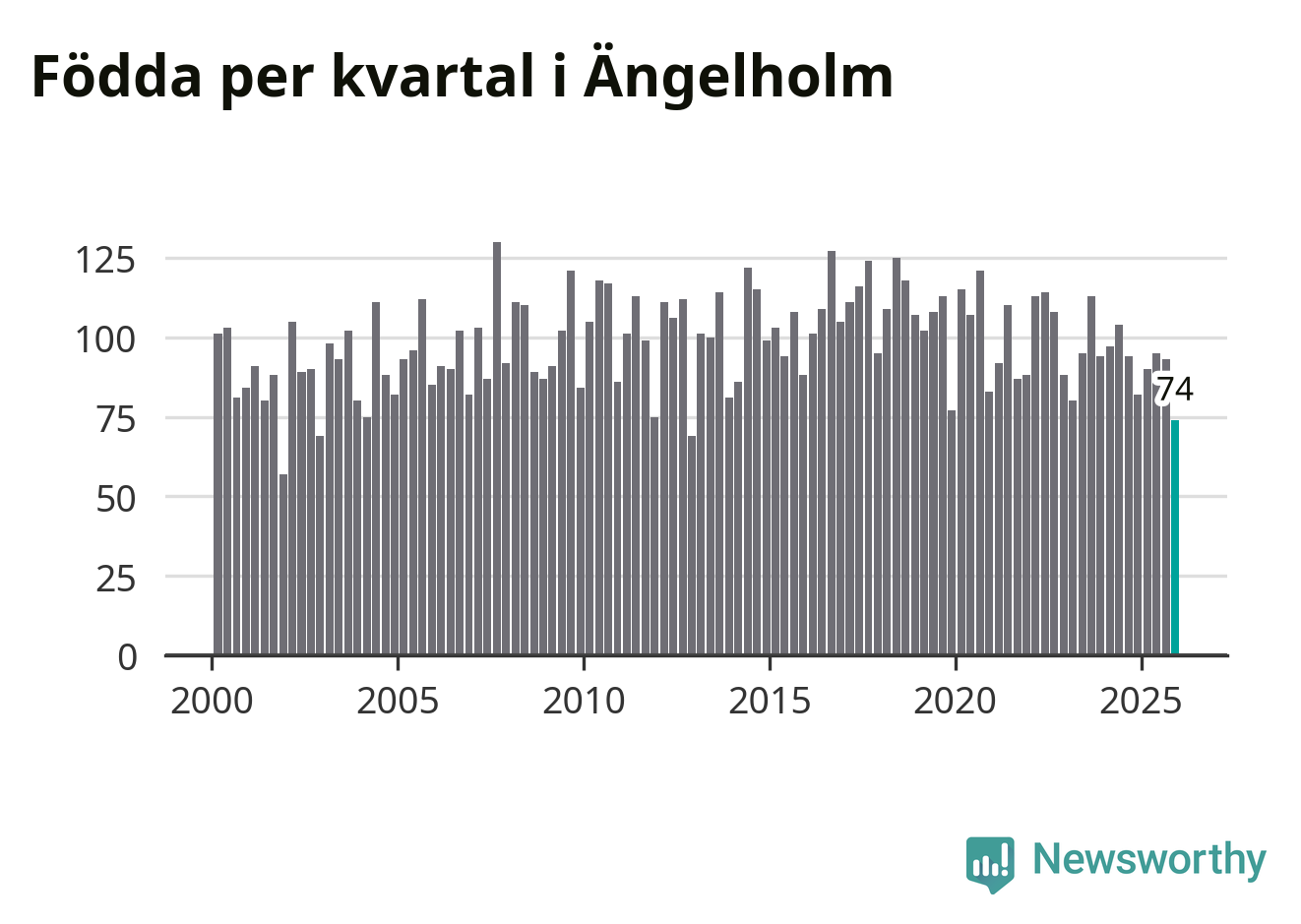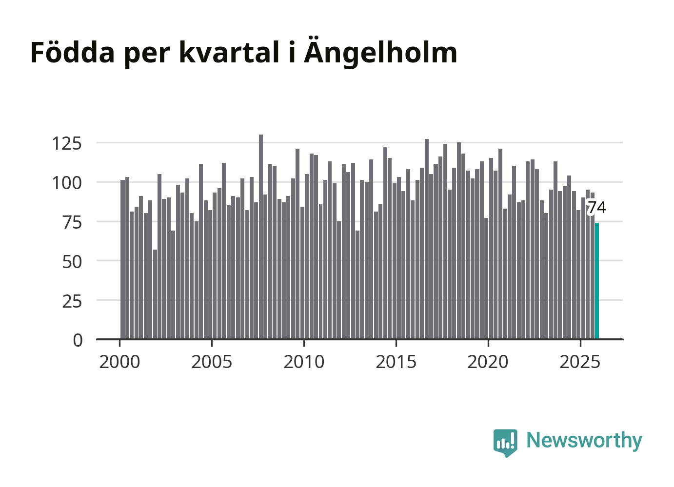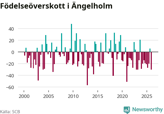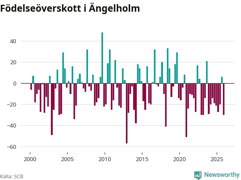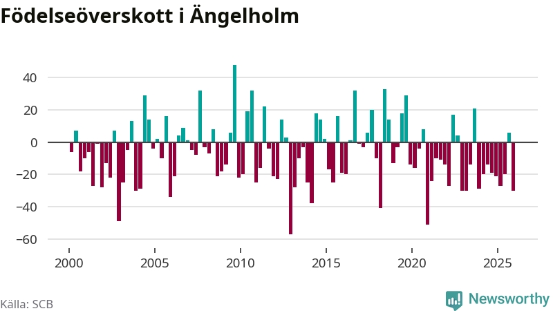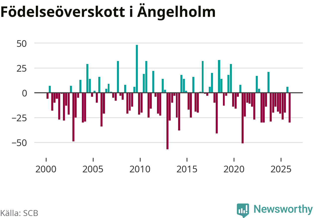 Enligt SCB:s siffror föddes 74 barn i Ängelholm under det senaste kvartalet. Samtidigt avled 104 personer. Ängelholm hade alltså ett negativt födelsenetto, vilket kommunen historiskt sett oftast har haft.