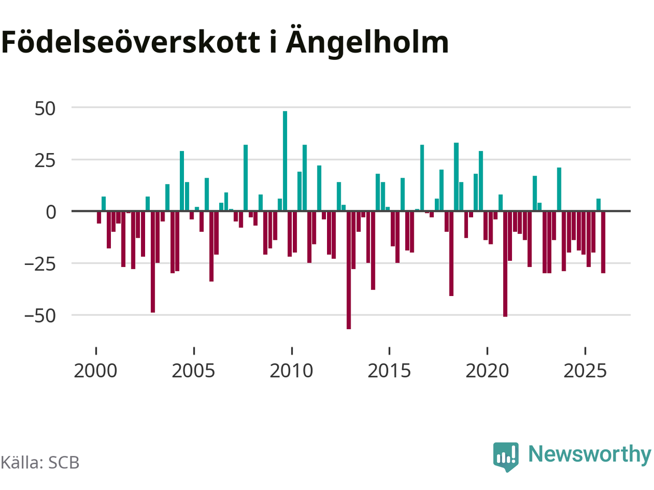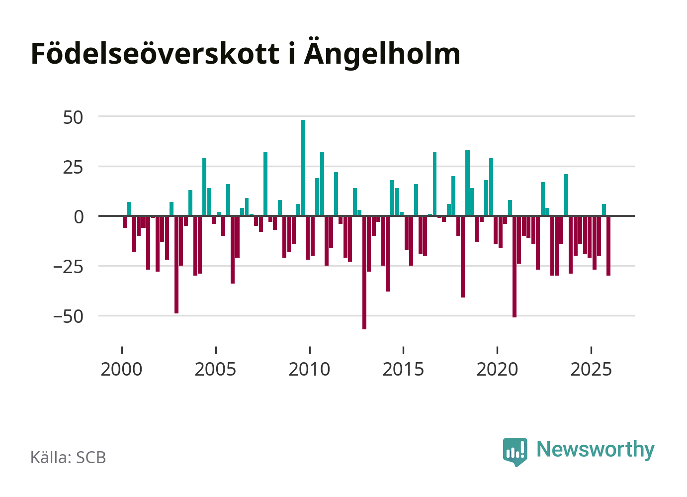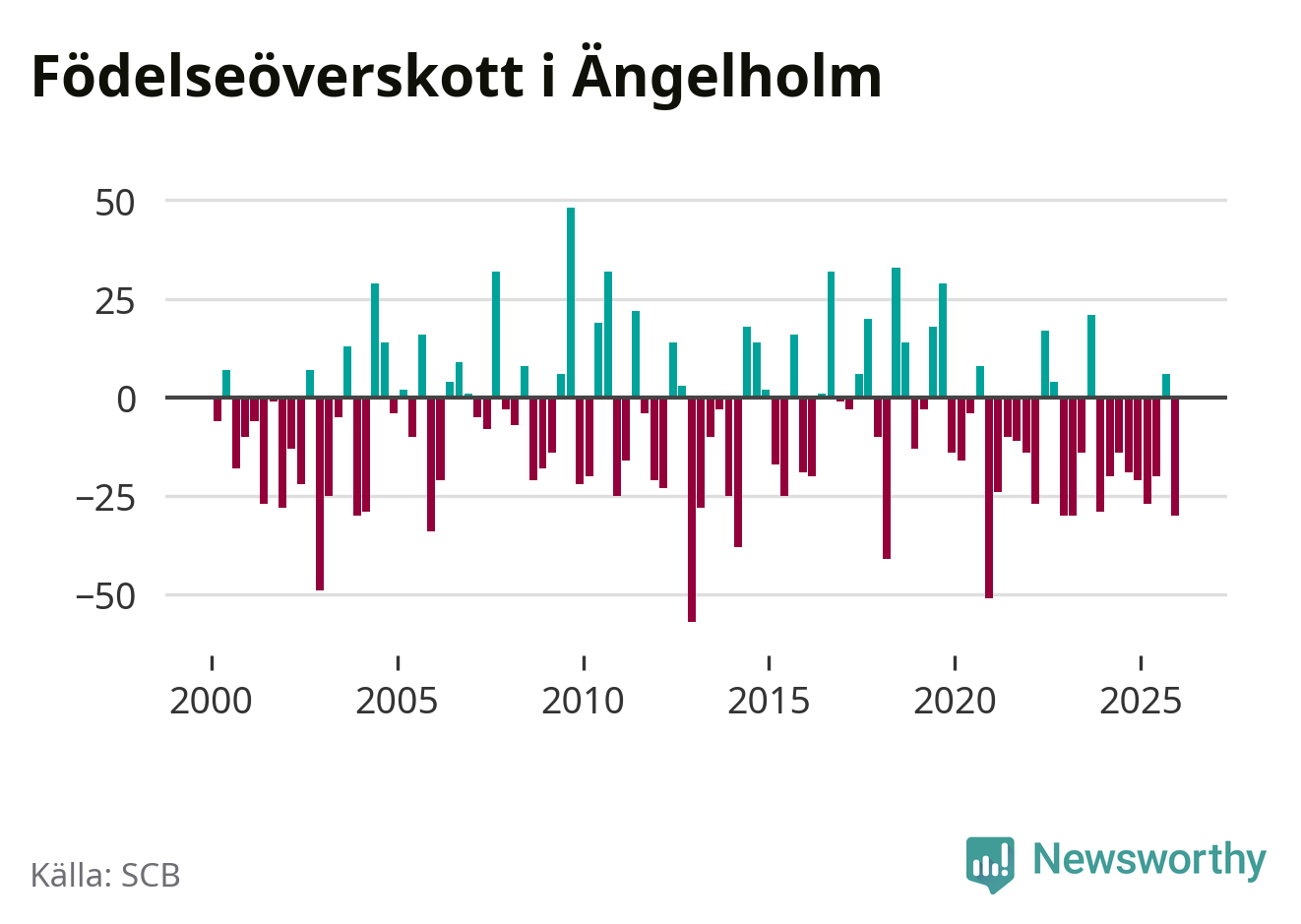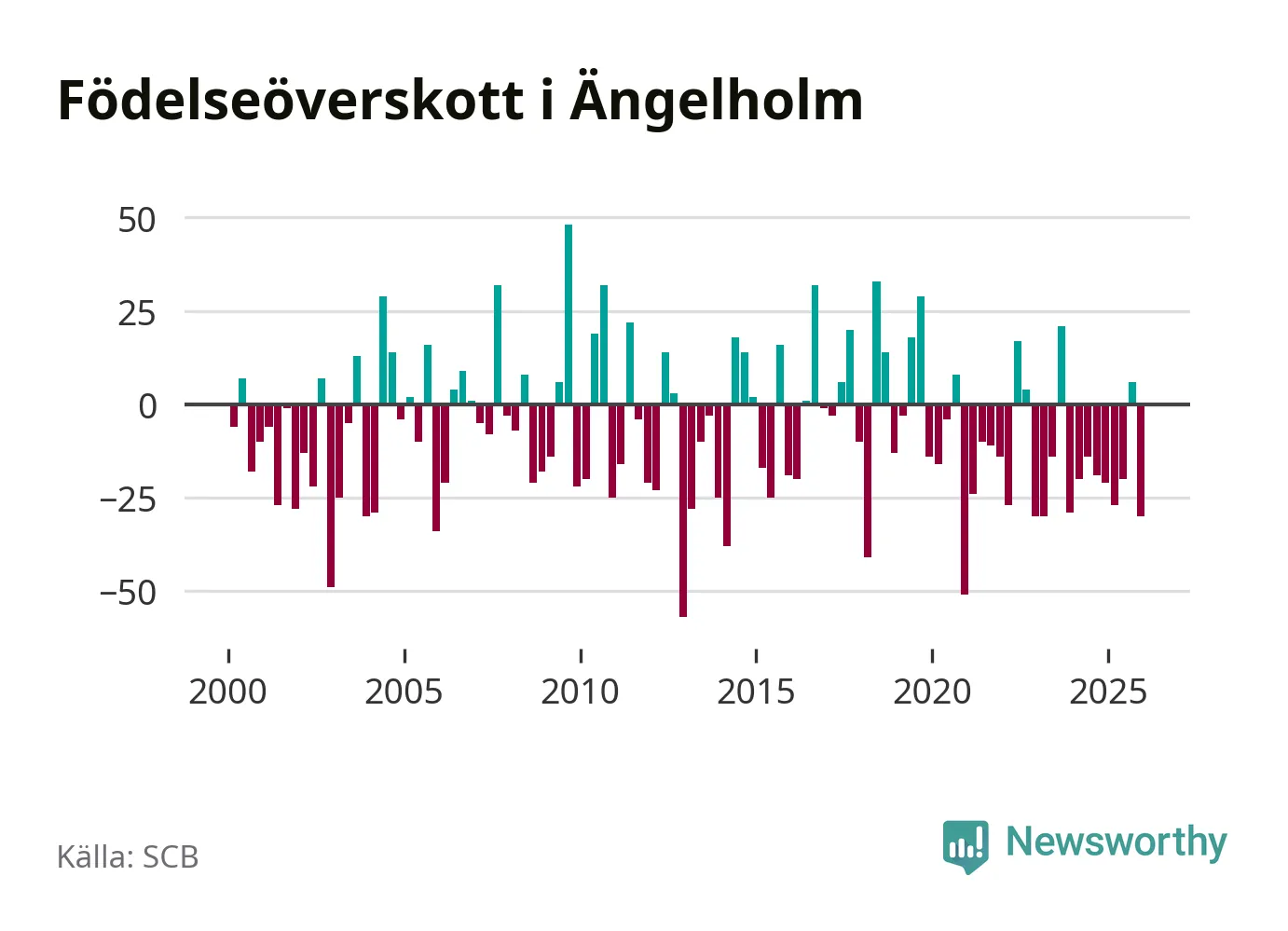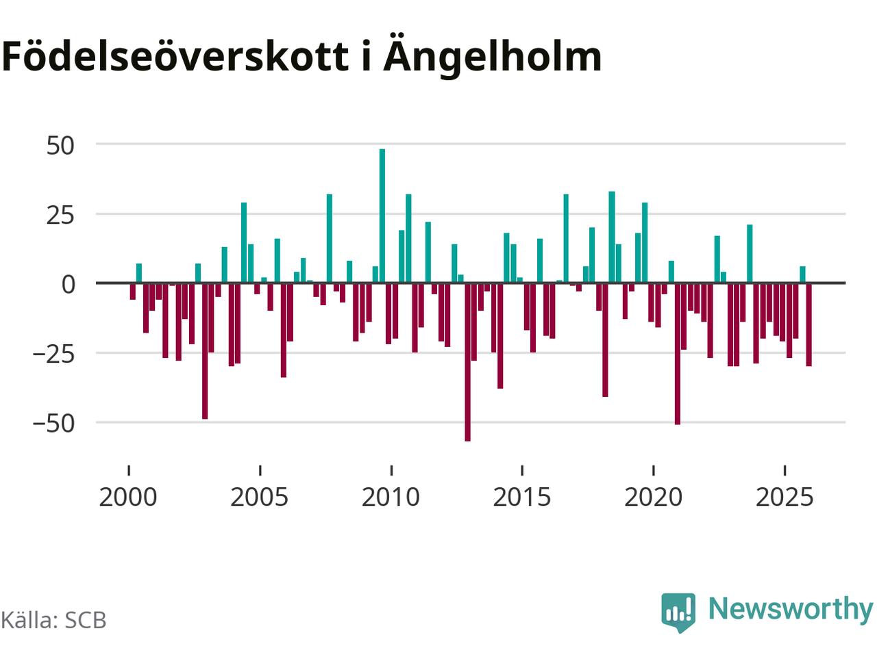 Enligt SCB:s siffror föddes 74 barn i Ängelholm under det senaste kvartalet. Samtidigt avled 104 personer. Ängelholm hade alltså ett negativt födelsenetto, vilket kommunen historiskt sett oftast har haft.