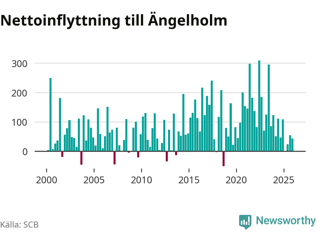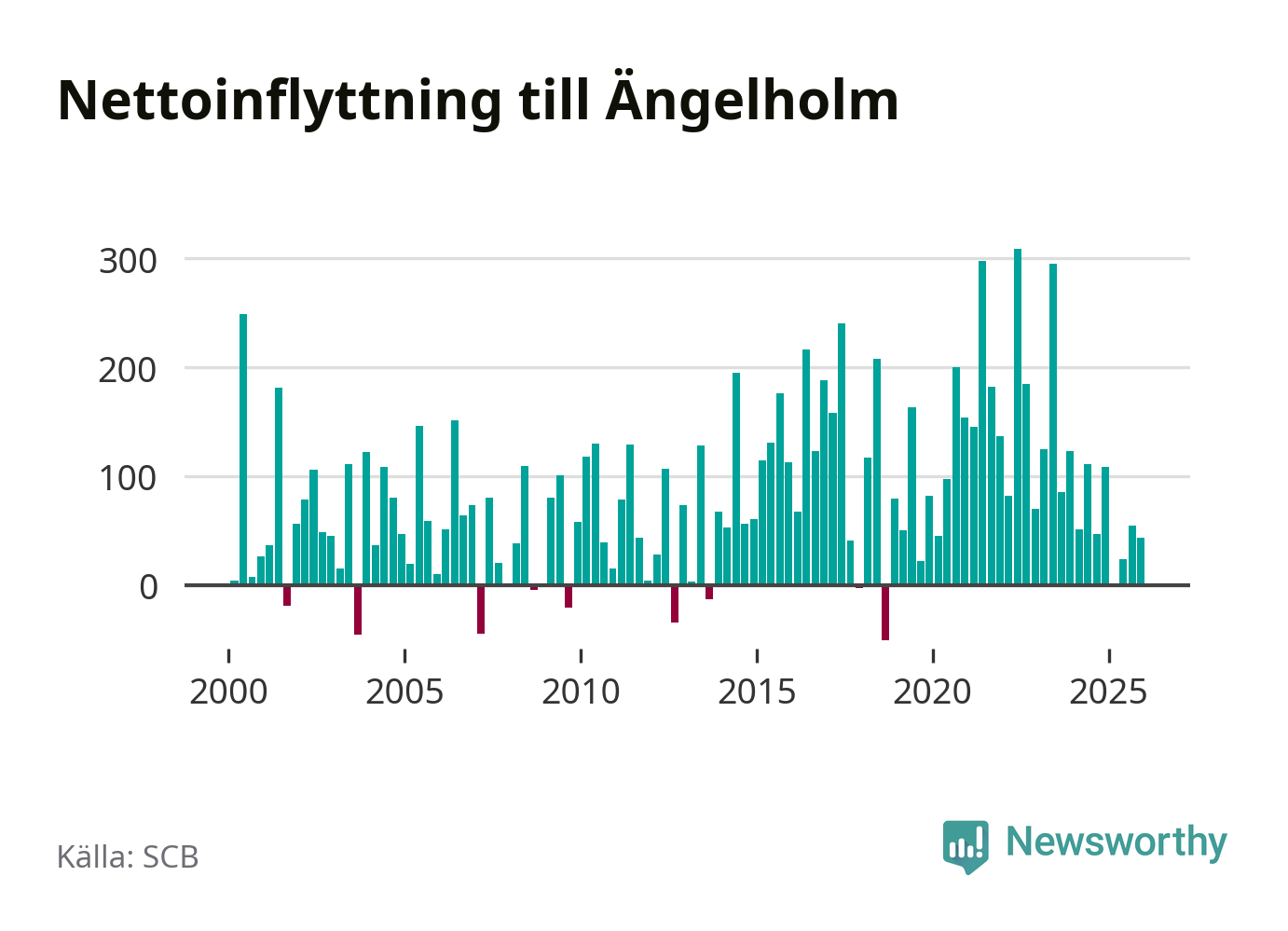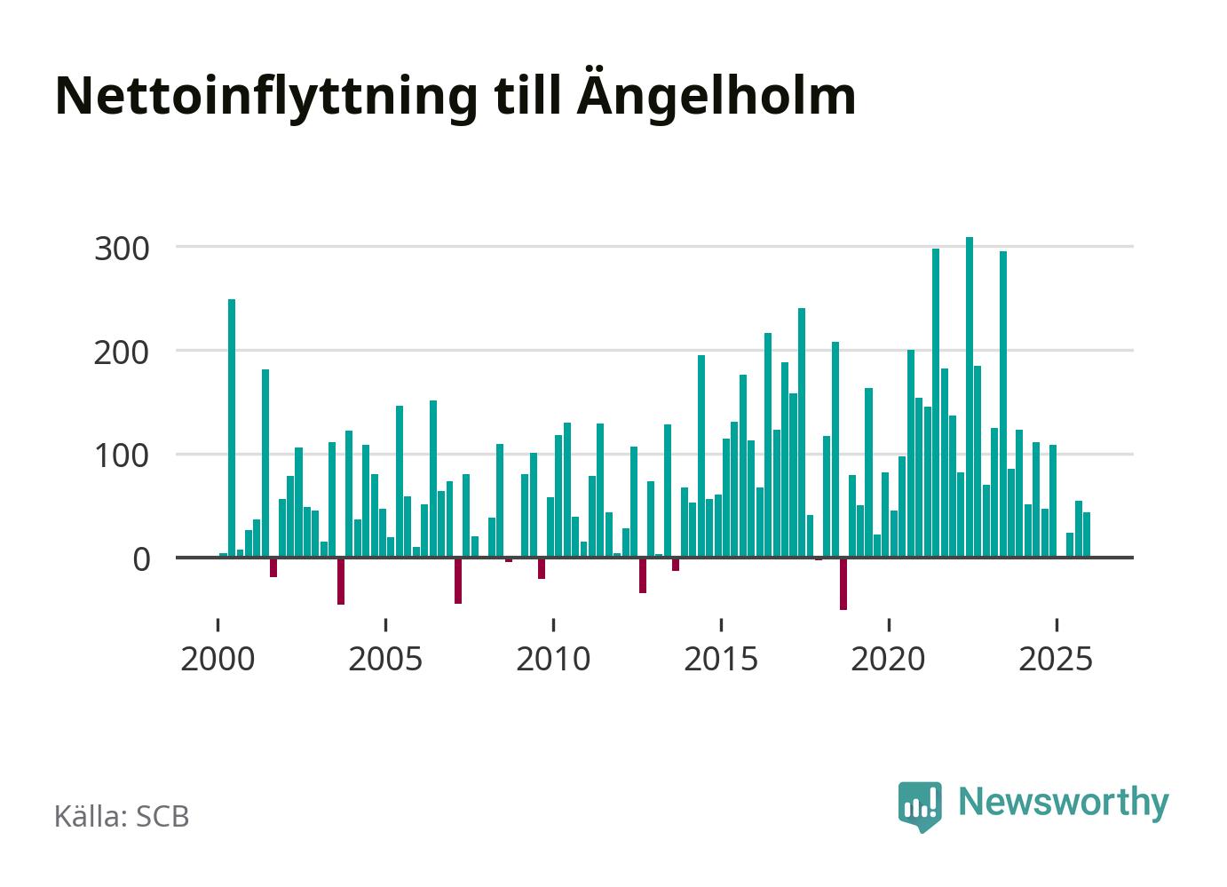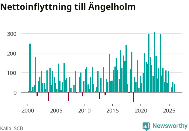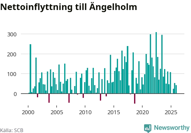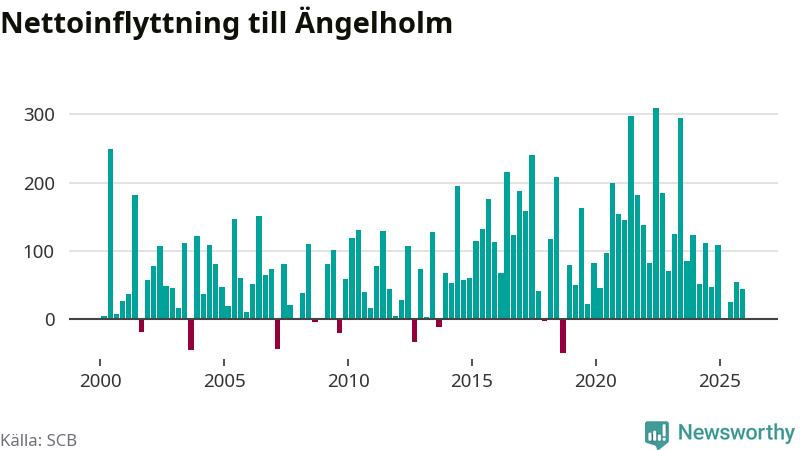 Under fjärde kvartalet 2025 flyttade 507 personer till kommunen medan 464 personer flyttade därifrån. Sedan seklets början har Ängelholm haft ett positivt flyttnetto under nästan alla kvartal, inklusive det senaste kvartalet.