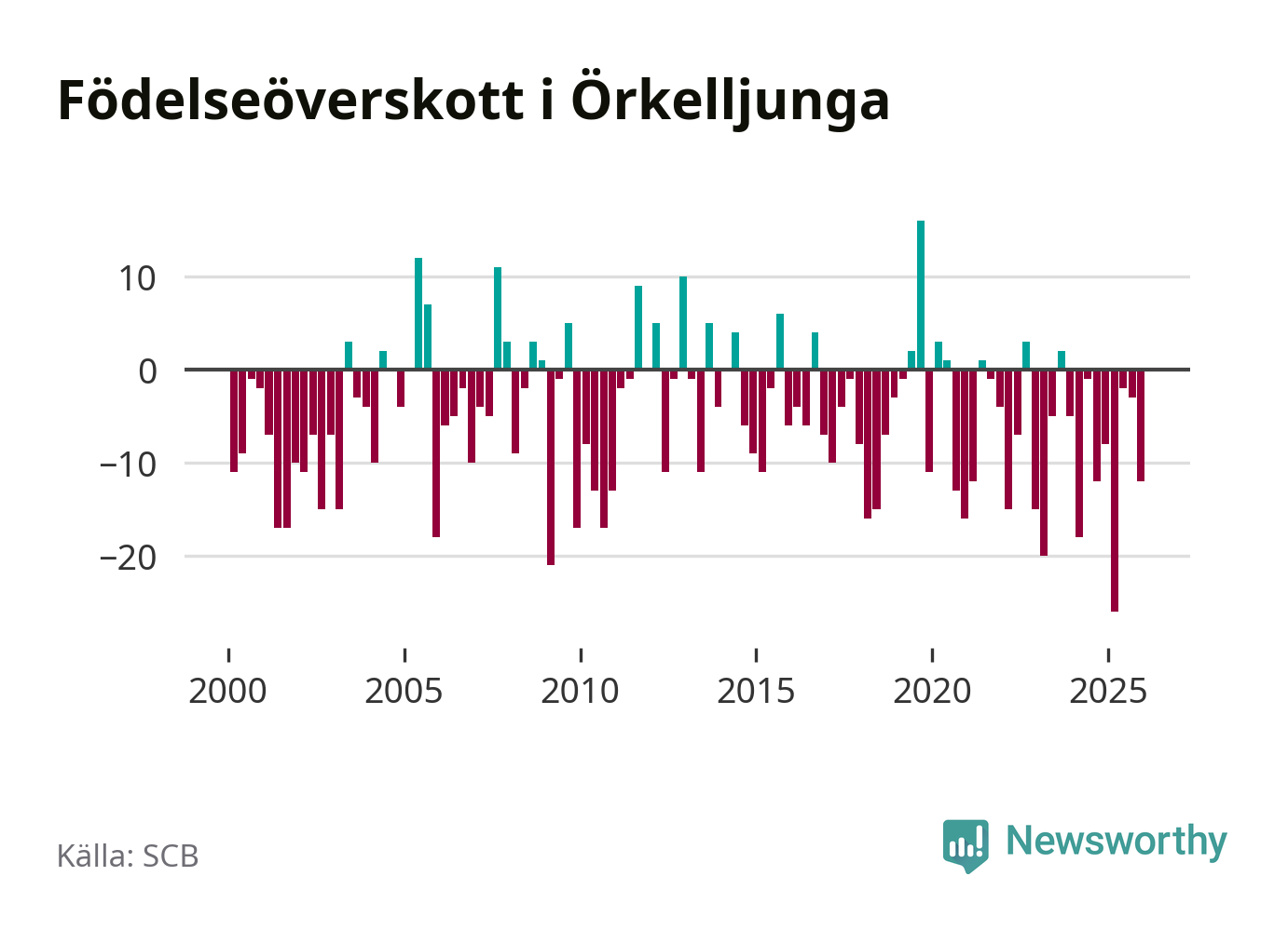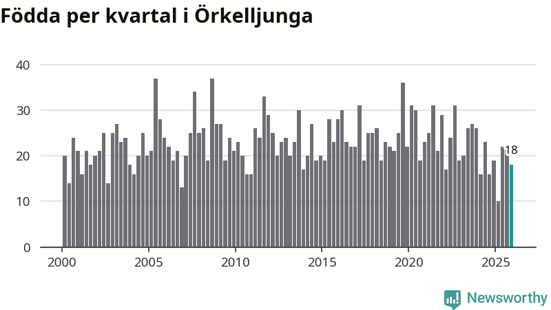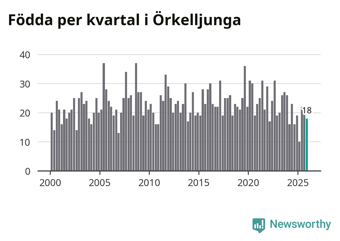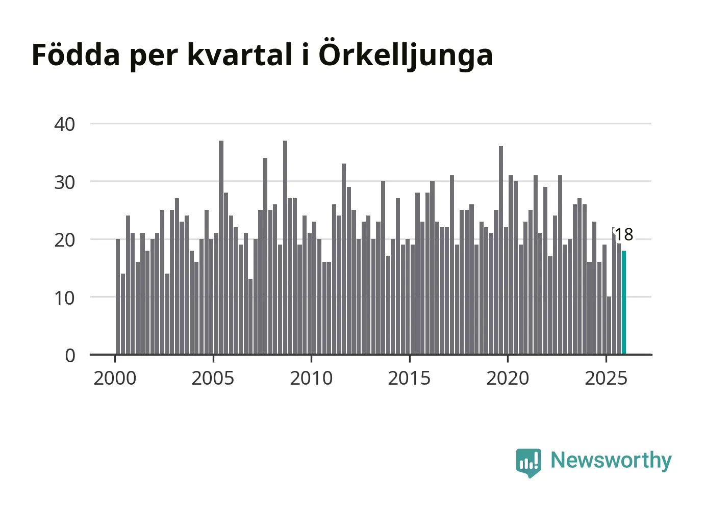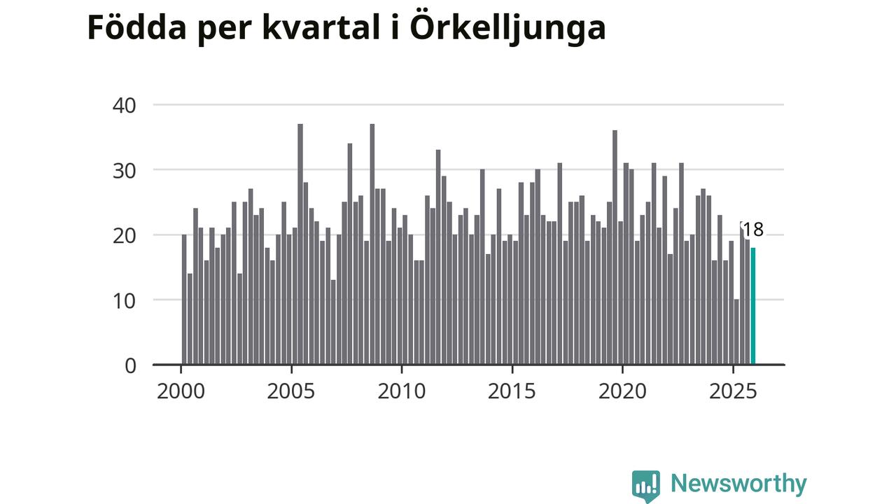 Enligt SCB:s siffror föddes 18 barn i Örkelljunga under det senaste kvartalet. Samtidigt avled 30 personer. Örkelljunga hade alltså ett negativt födelsenetto, vilket kommunen historiskt sett oftast har haft.