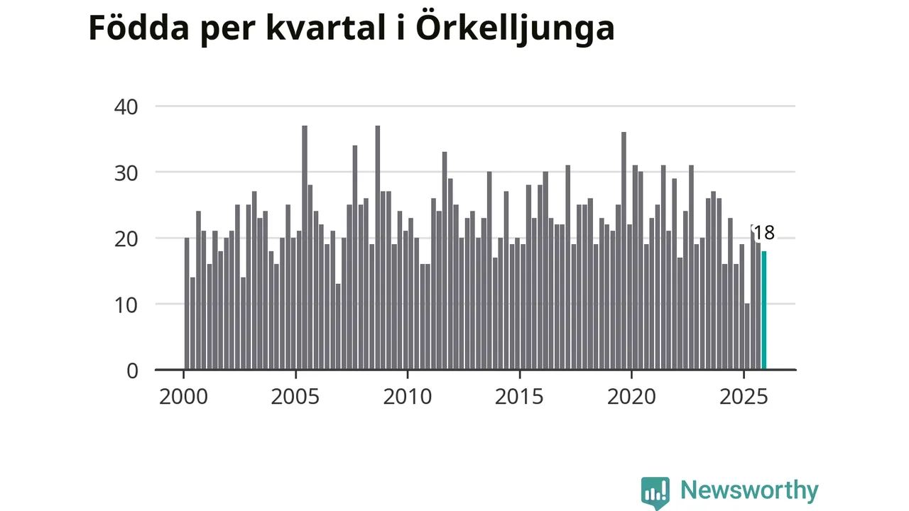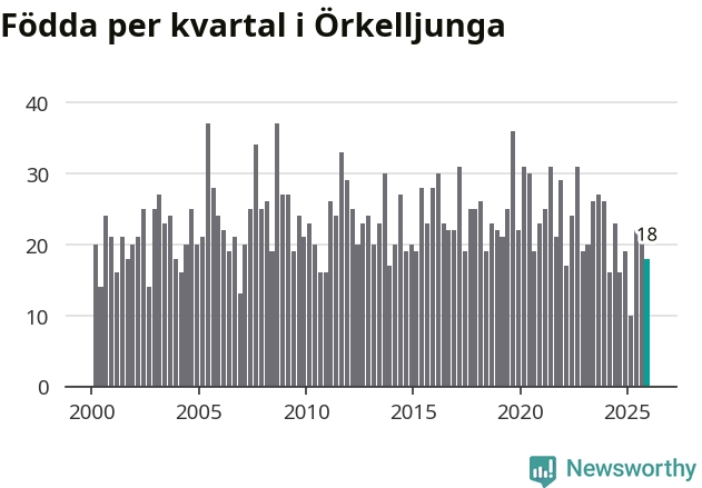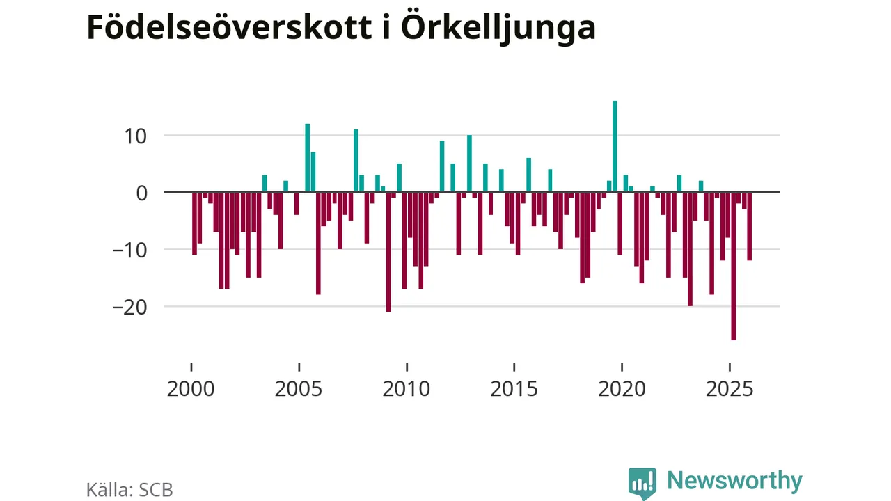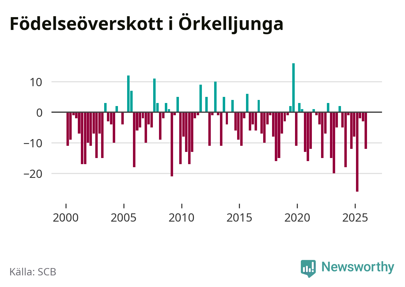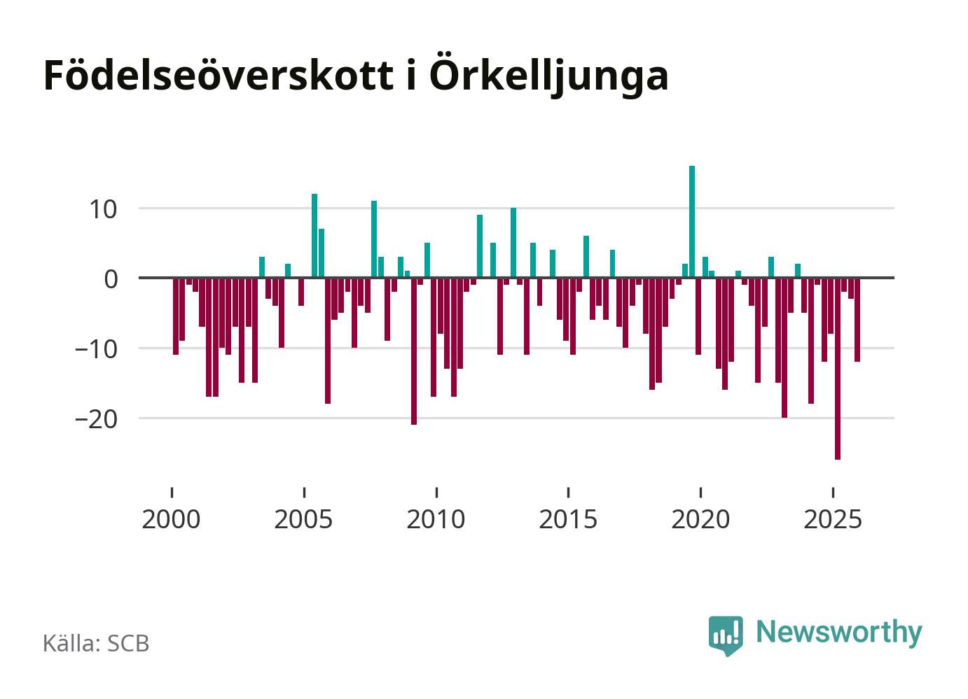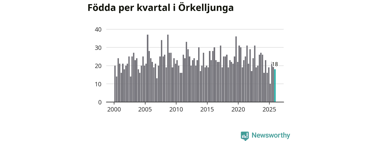 Enligt SCB:s siffror föddes 18 barn i Örkelljunga under det senaste kvartalet. Samtidigt avled 30 personer. Örkelljunga hade alltså ett negativt födelsenetto, vilket kommunen historiskt sett oftast har haft.