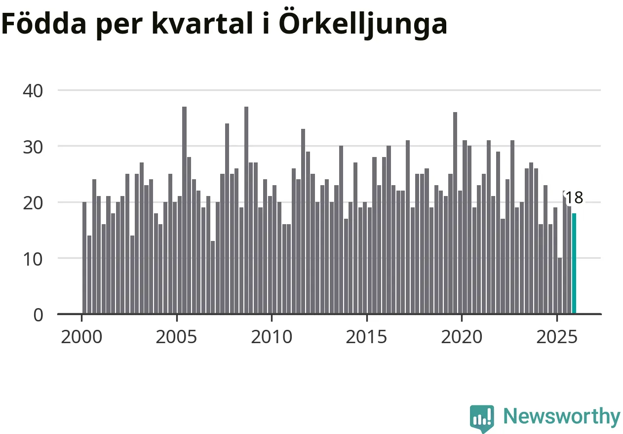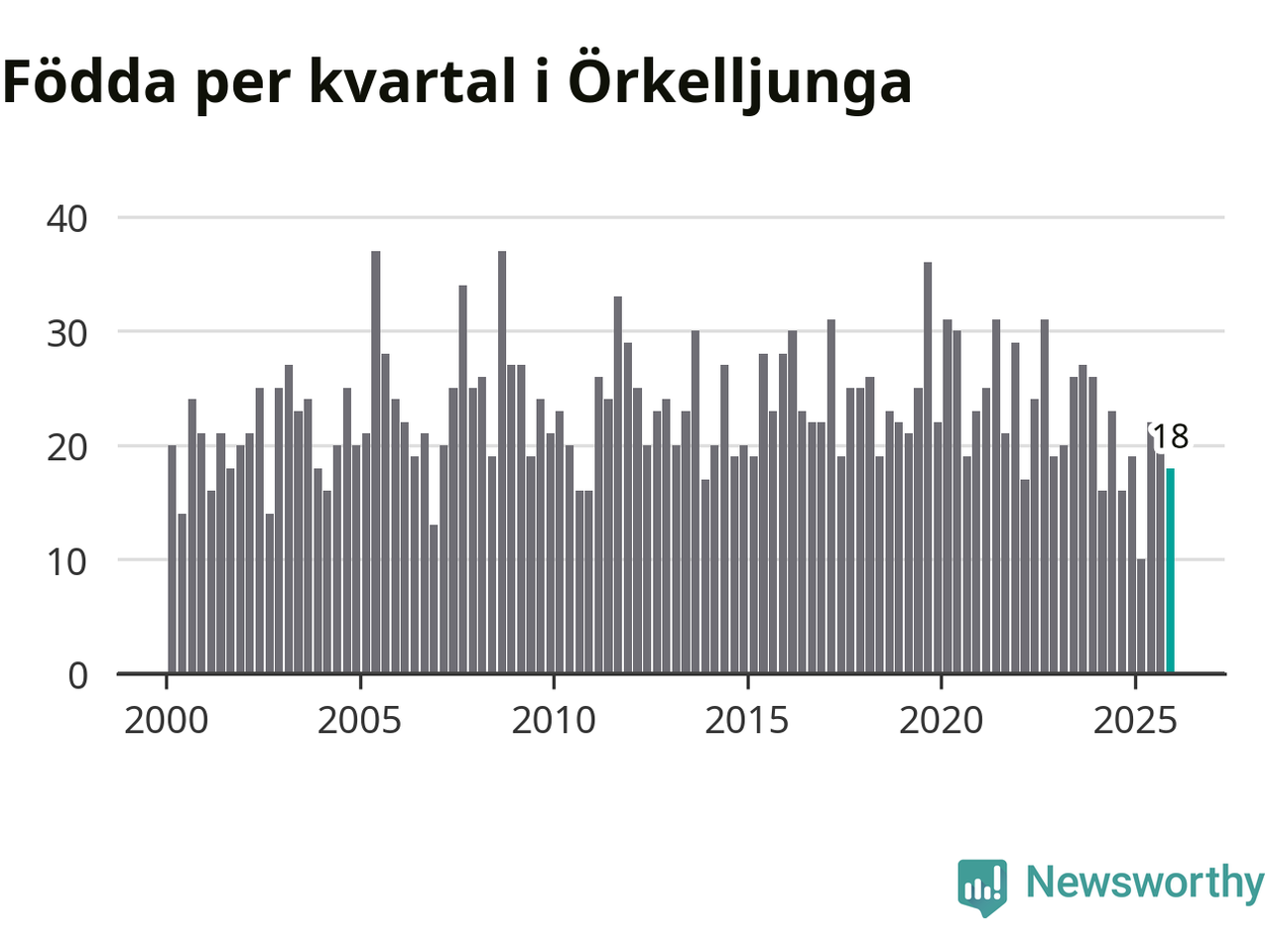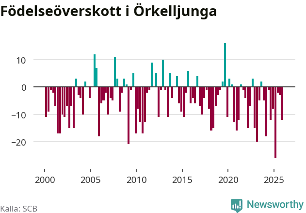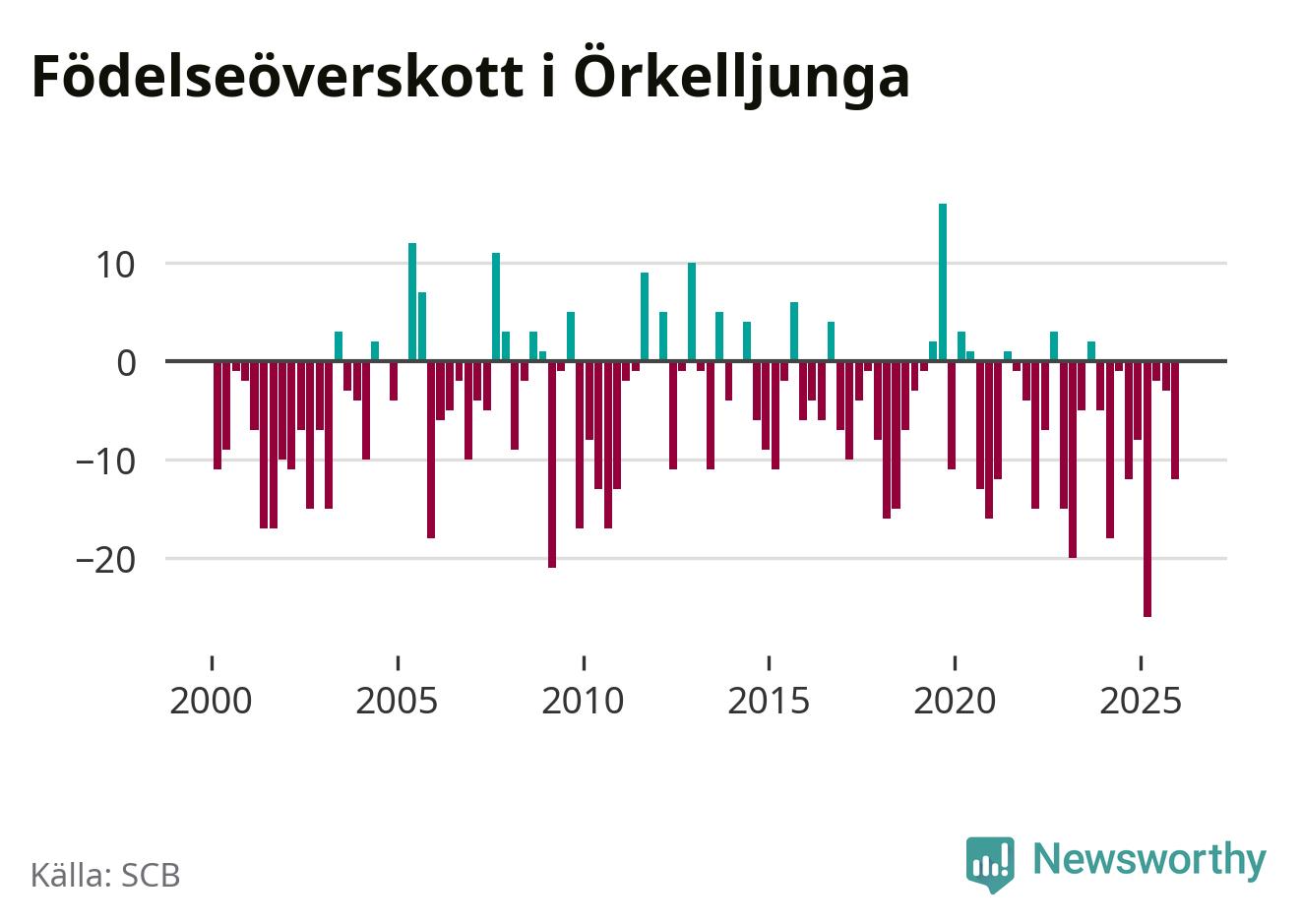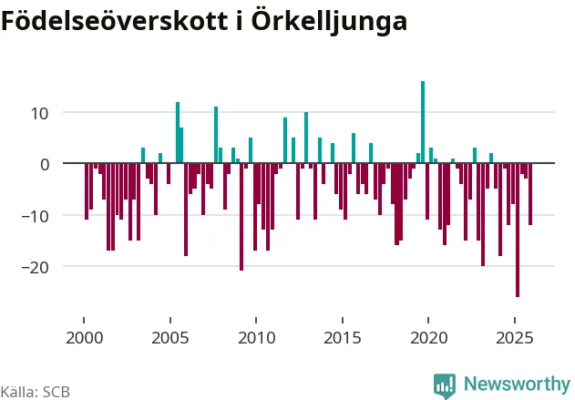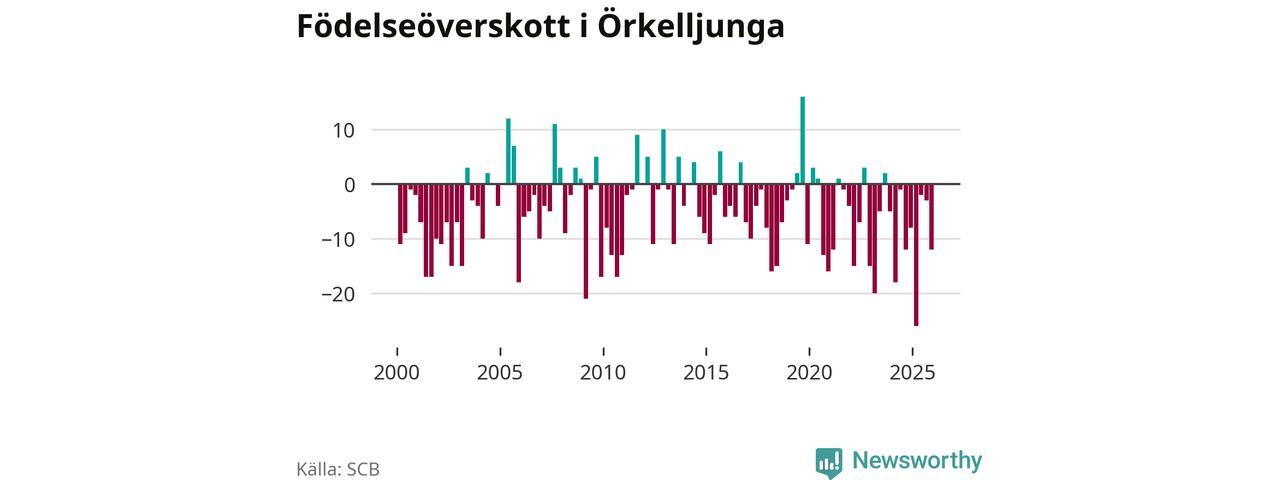 Enligt SCB:s siffror föddes 18 barn i Örkelljunga under det senaste kvartalet. Samtidigt avled 30 personer. Örkelljunga hade alltså ett negativt födelsenetto, vilket kommunen historiskt sett oftast har haft.