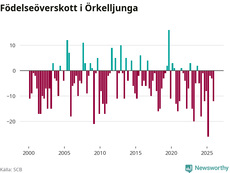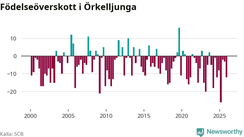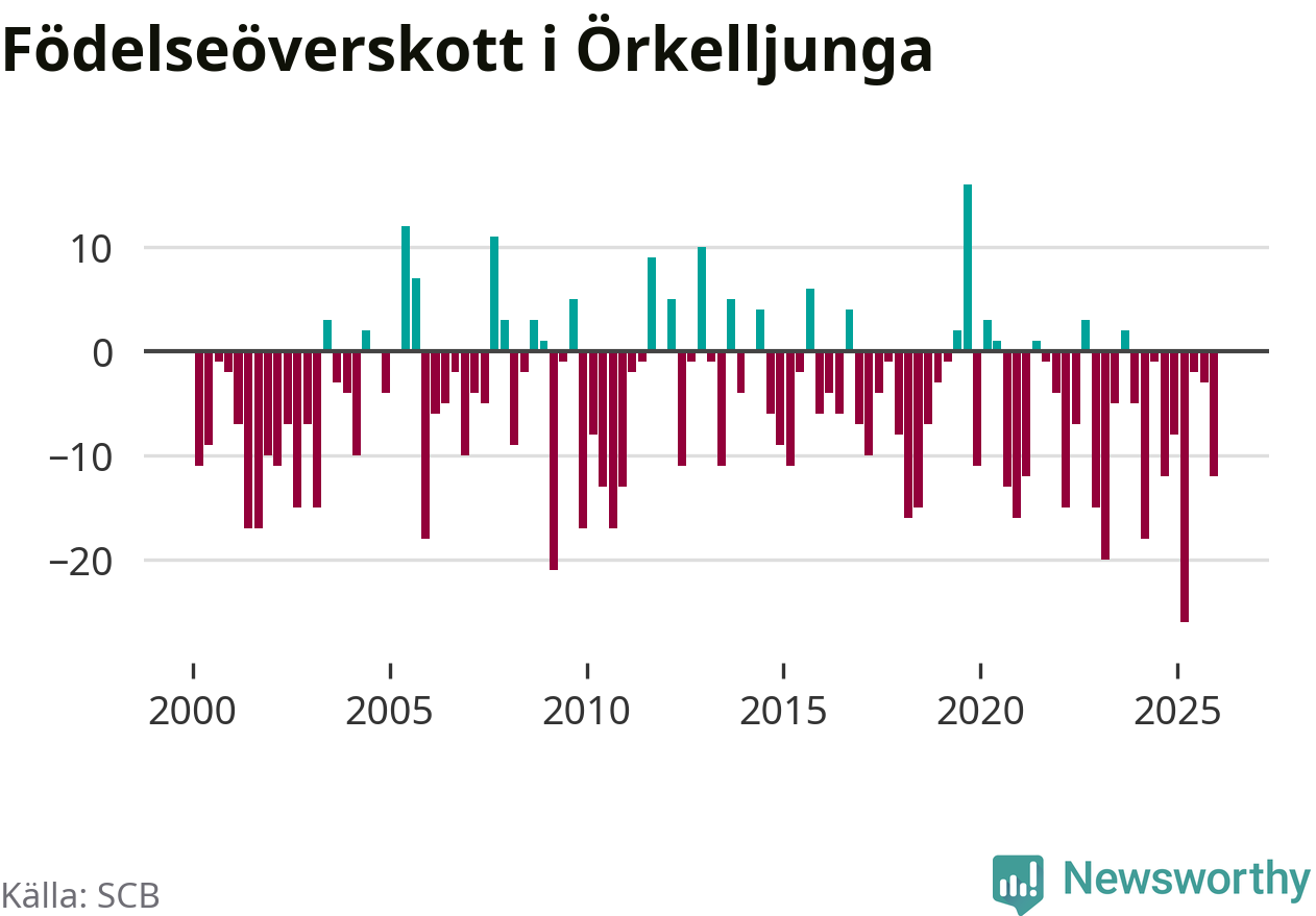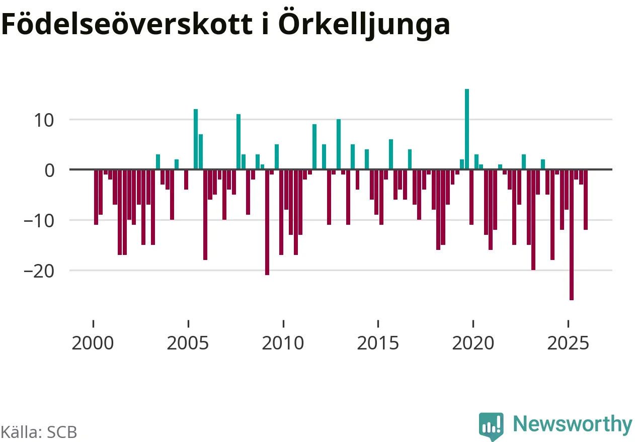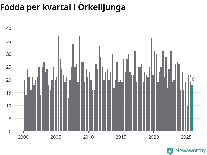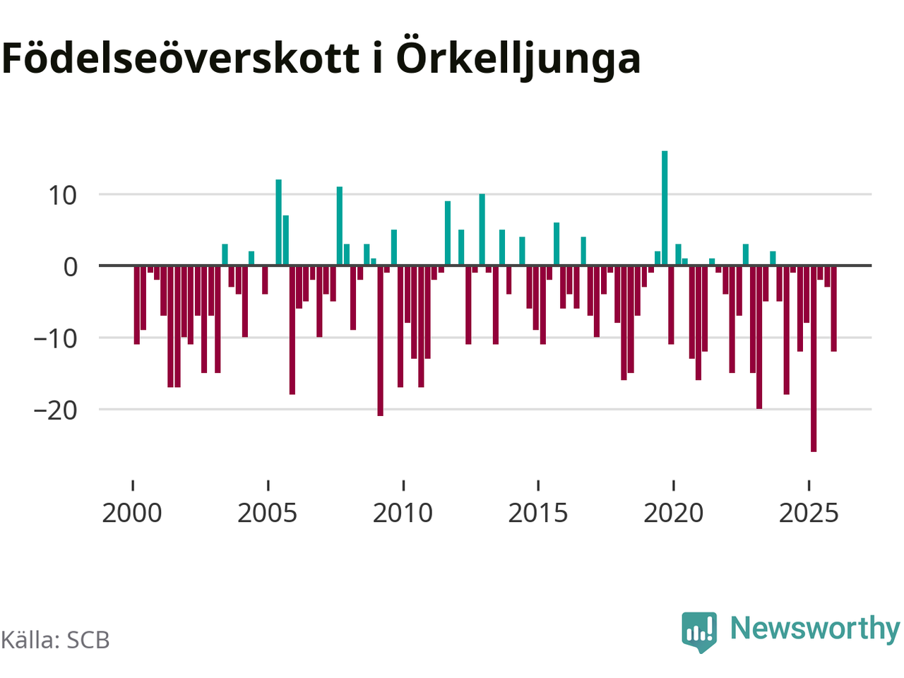 Enligt SCB:s siffror föddes 18 barn i Örkelljunga under det senaste kvartalet. Samtidigt avled 30 personer. Örkelljunga hade alltså ett negativt födelsenetto, vilket kommunen historiskt sett oftast har haft.