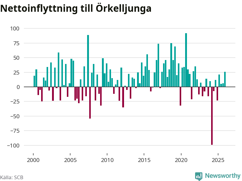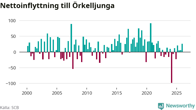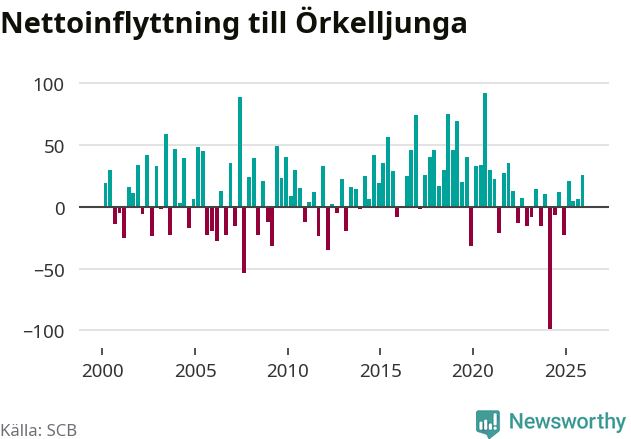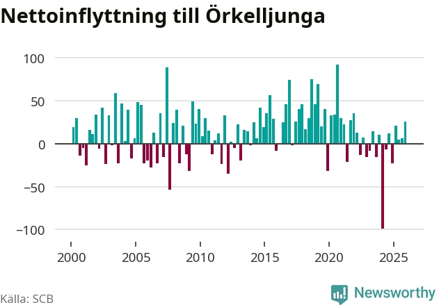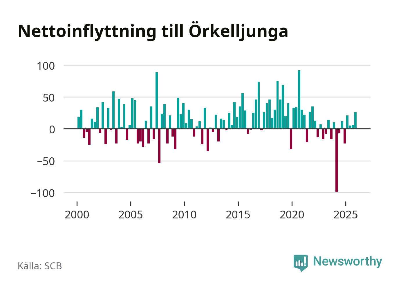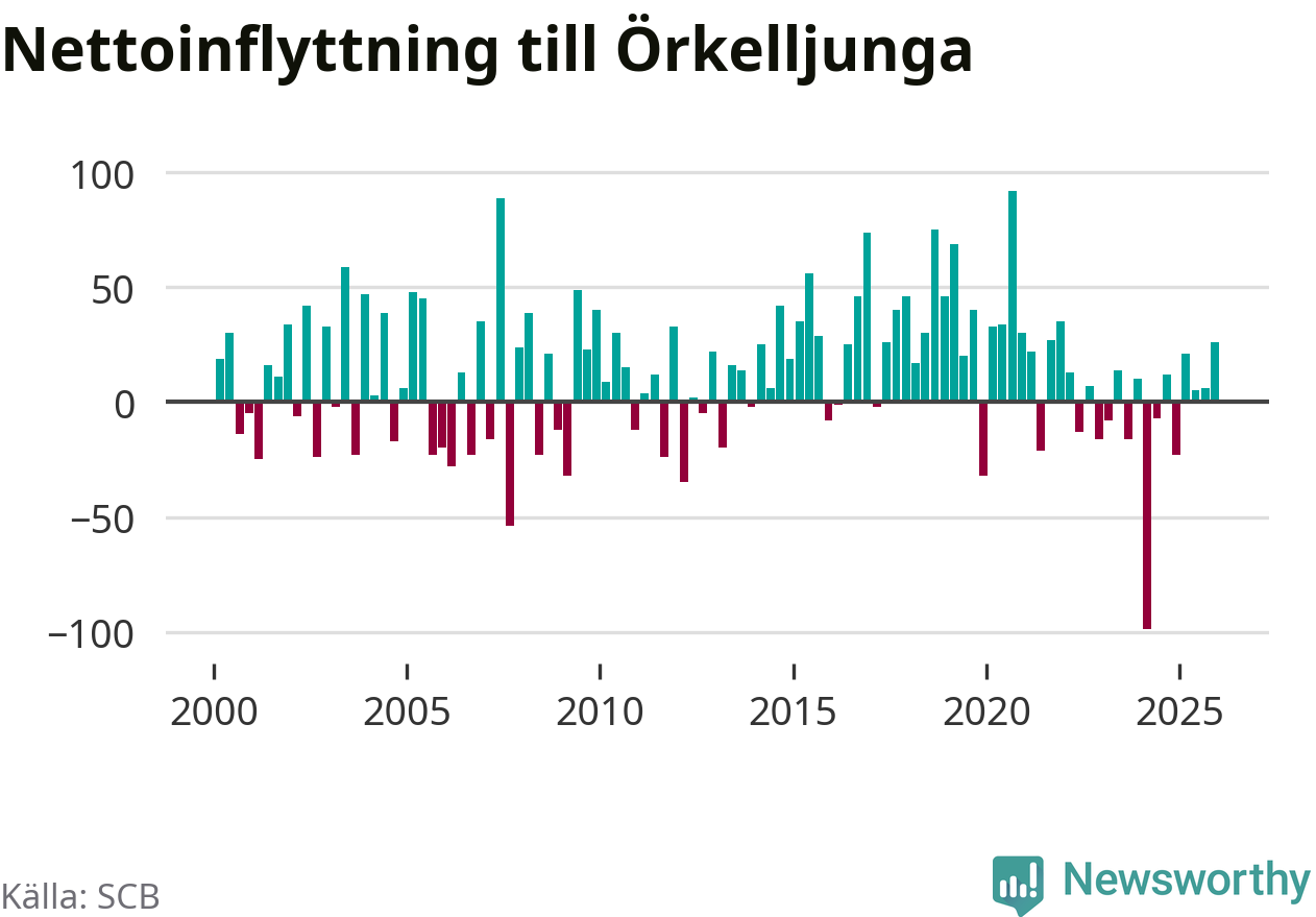 Under fjärde kvartalet 2025 flyttade 189 personer till kommunen medan 163 personer flyttade därifrån. Sedan seklets början har Örkelljunga oftast haft ett positivt flyttnetto, inklusive det senaste kvartalet.