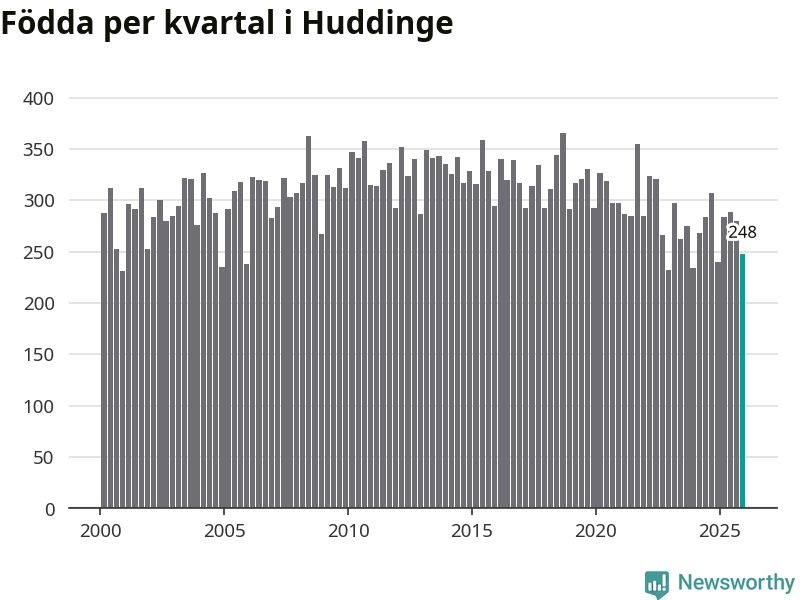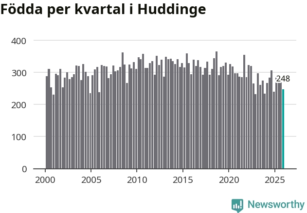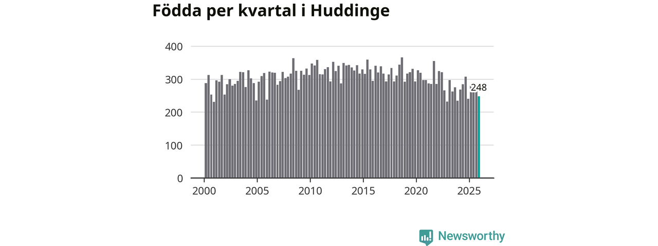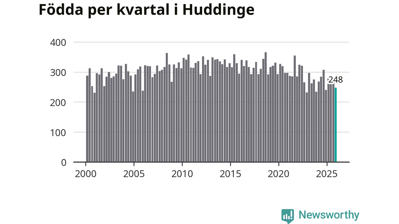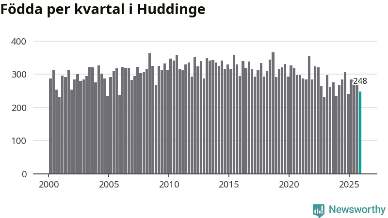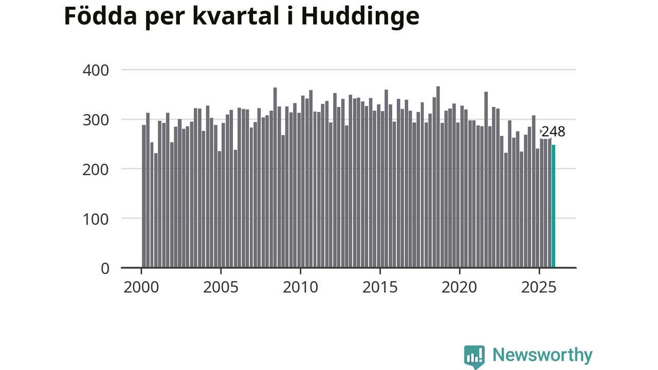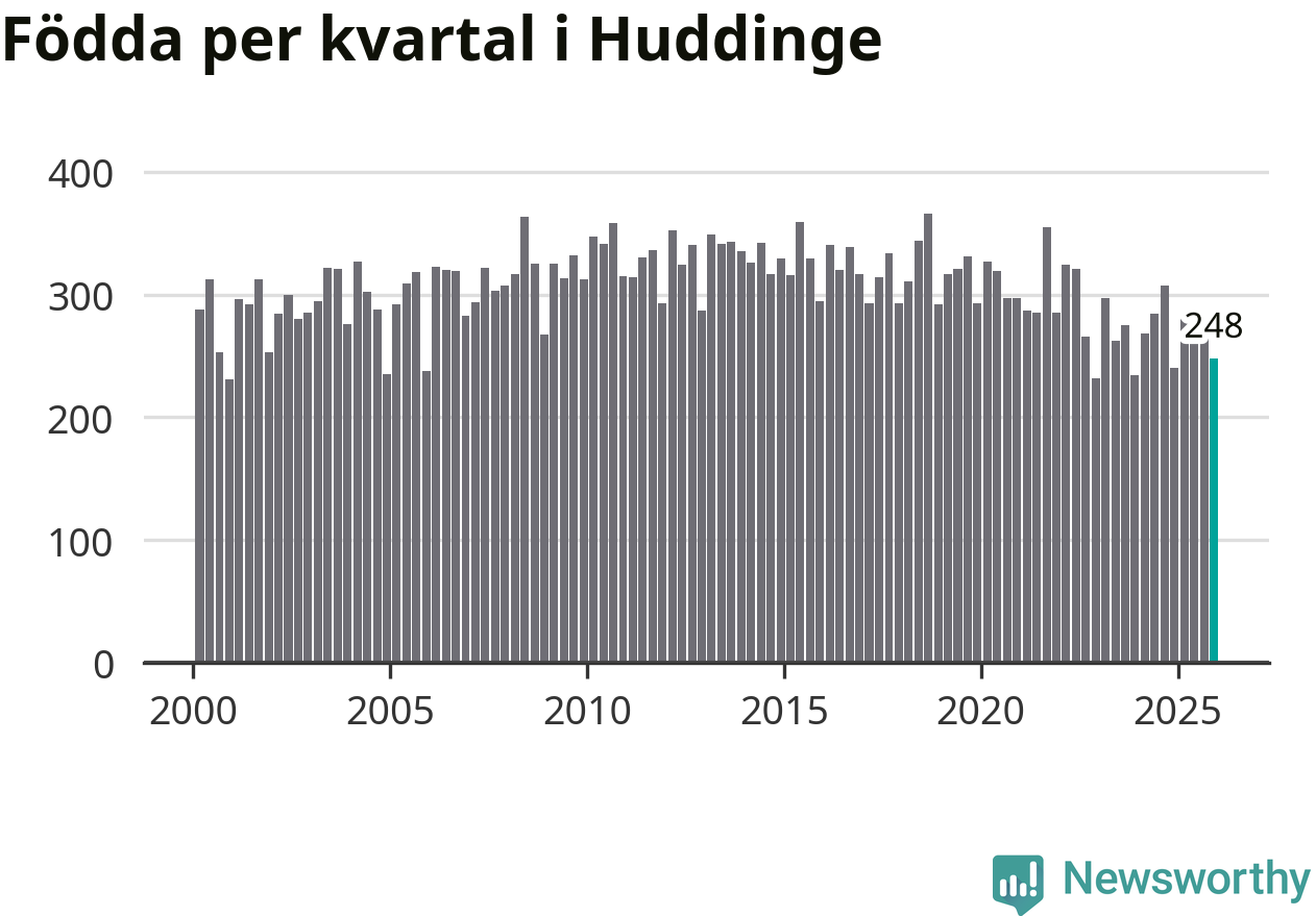 Enligt SCB:s siffror föddes 248 barn i Huddinge under det senaste kvartalet. Samtidigt avled 177 personer. Huddinge hade alltså ett positivt födelsenetto, vilket kommunen historiskt sett i princip alltid har haft.