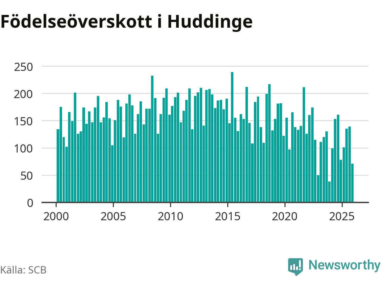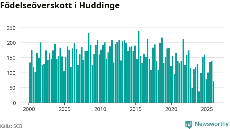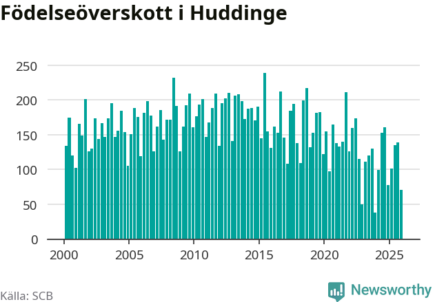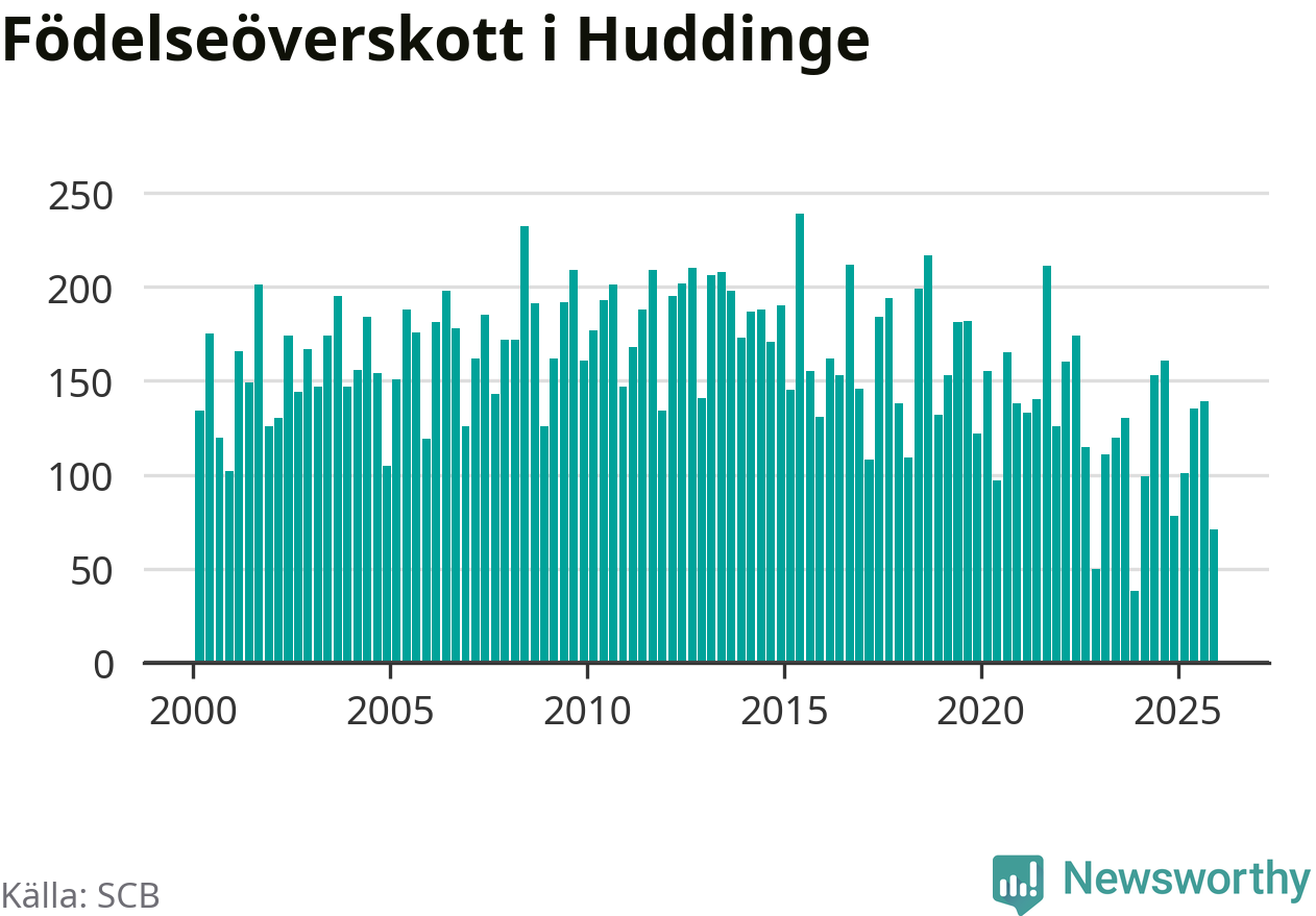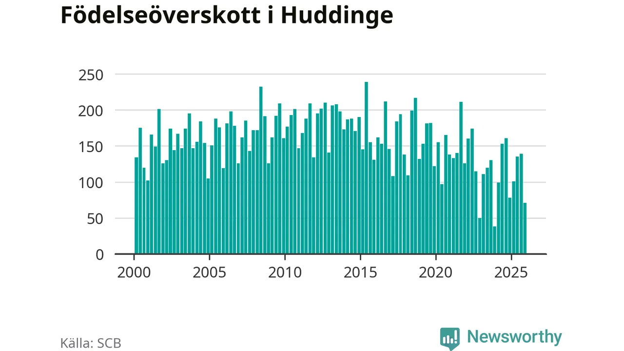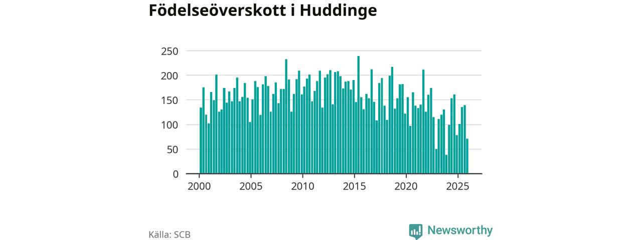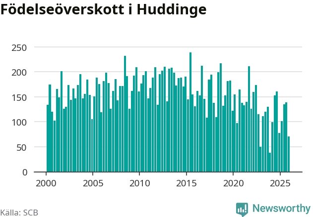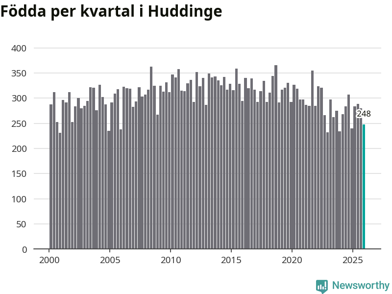 Enligt SCB:s siffror föddes 248 barn i Huddinge under det senaste kvartalet. Samtidigt avled 177 personer. Huddinge hade alltså ett positivt födelsenetto, vilket kommunen historiskt sett i princip alltid har haft.