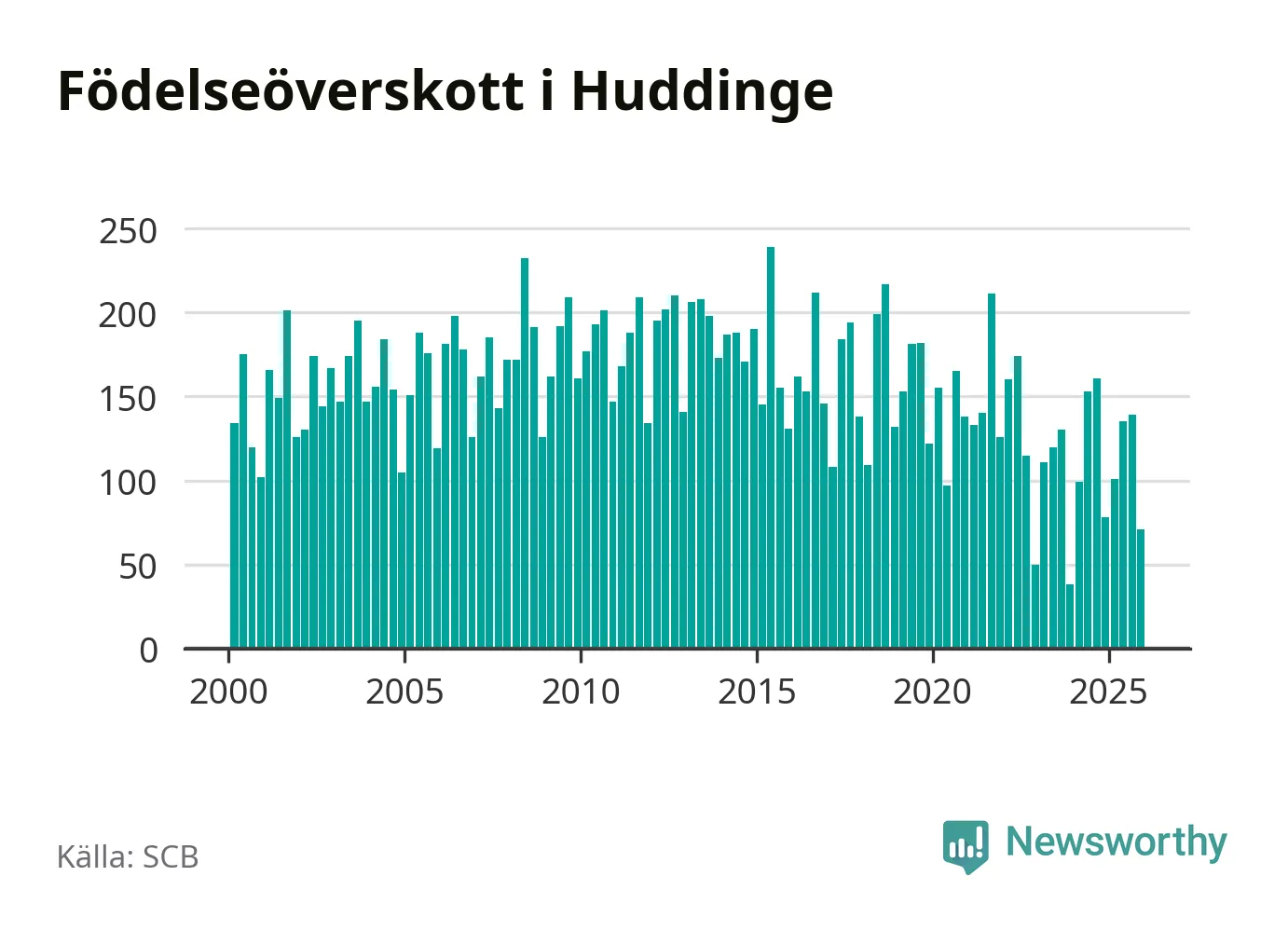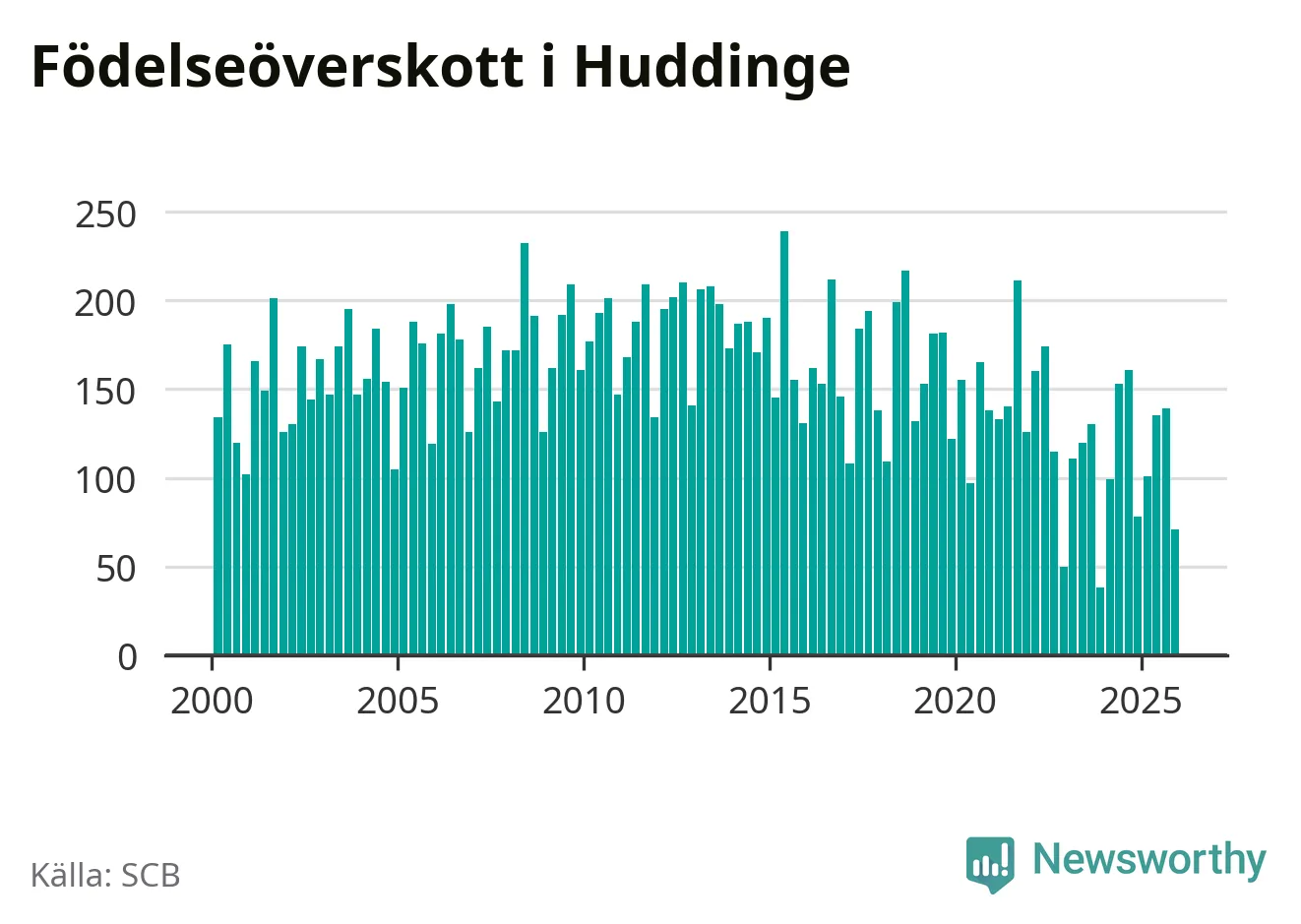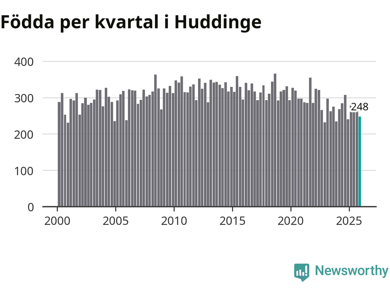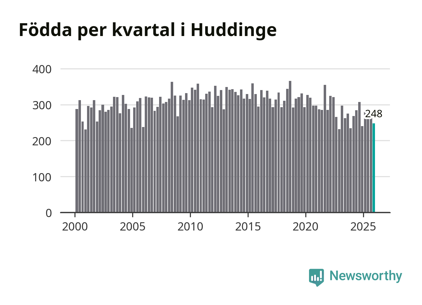 Enligt SCB:s siffror föddes 248 barn i Huddinge under det senaste kvartalet. Samtidigt avled 177 personer. Huddinge hade alltså ett positivt födelsenetto, vilket kommunen historiskt sett i princip alltid har haft.