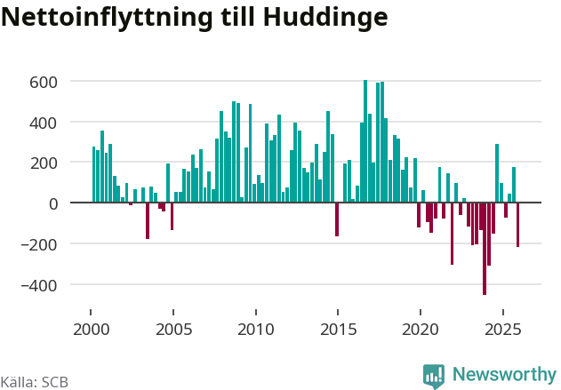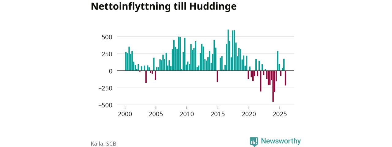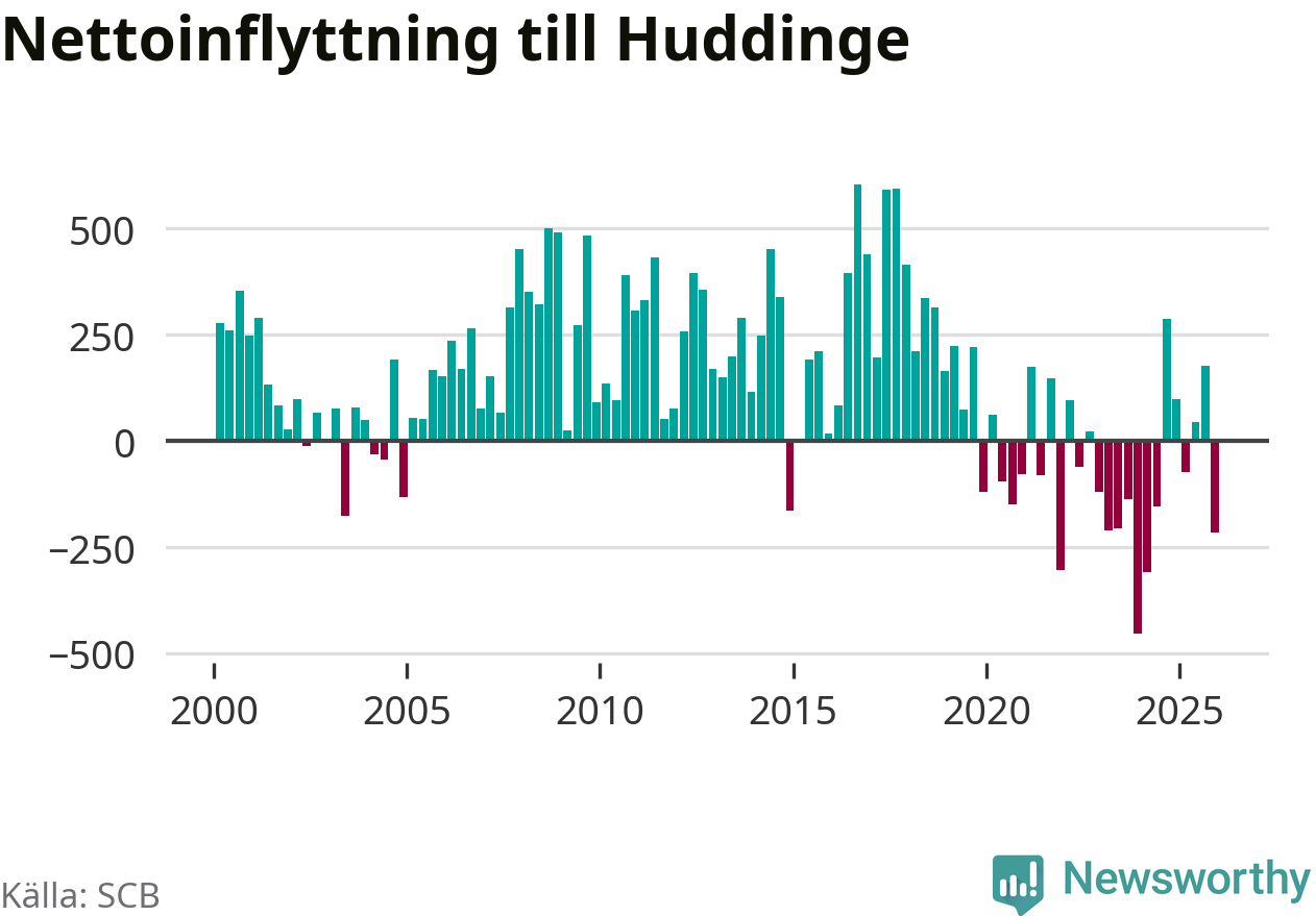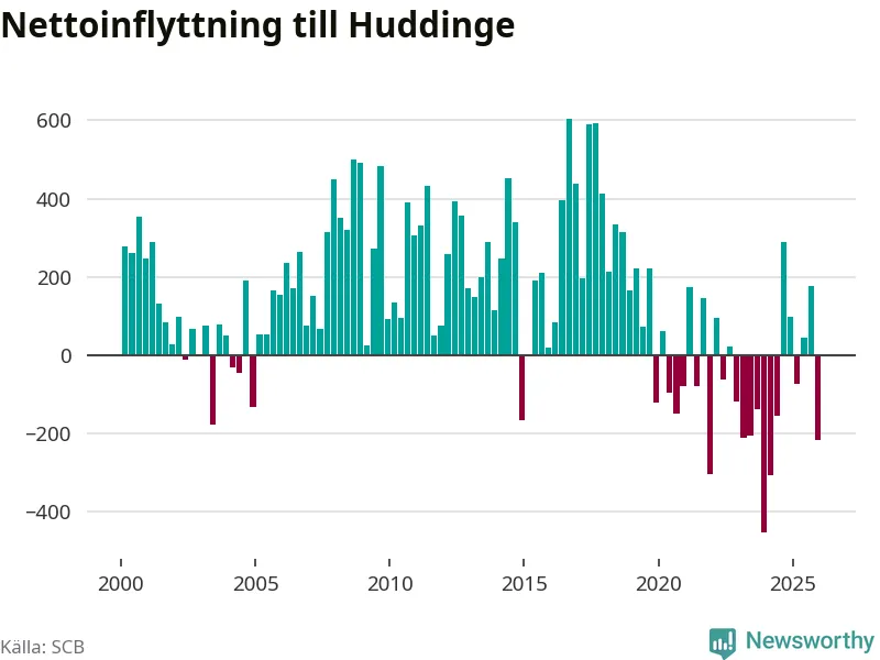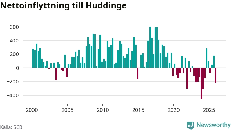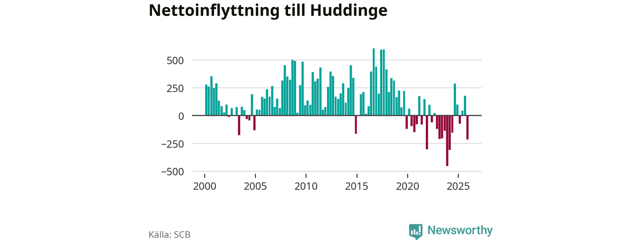 Under fjärde kvartalet 2025 flyttade 2 486 personer till kommunen medan 2 702 personer flyttade därifrån. Sedan seklets början har Huddinge oftast haft ett positivt flyttnetto.