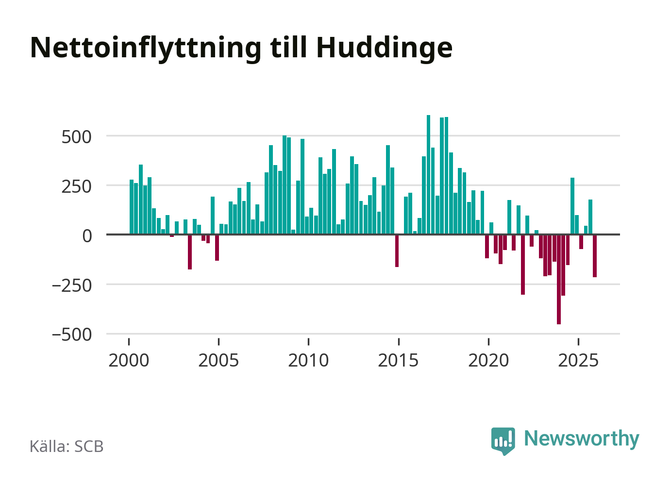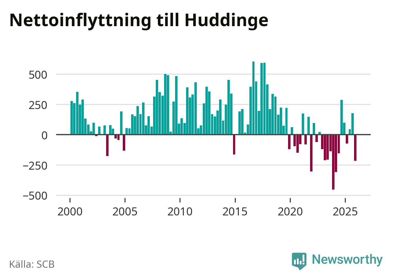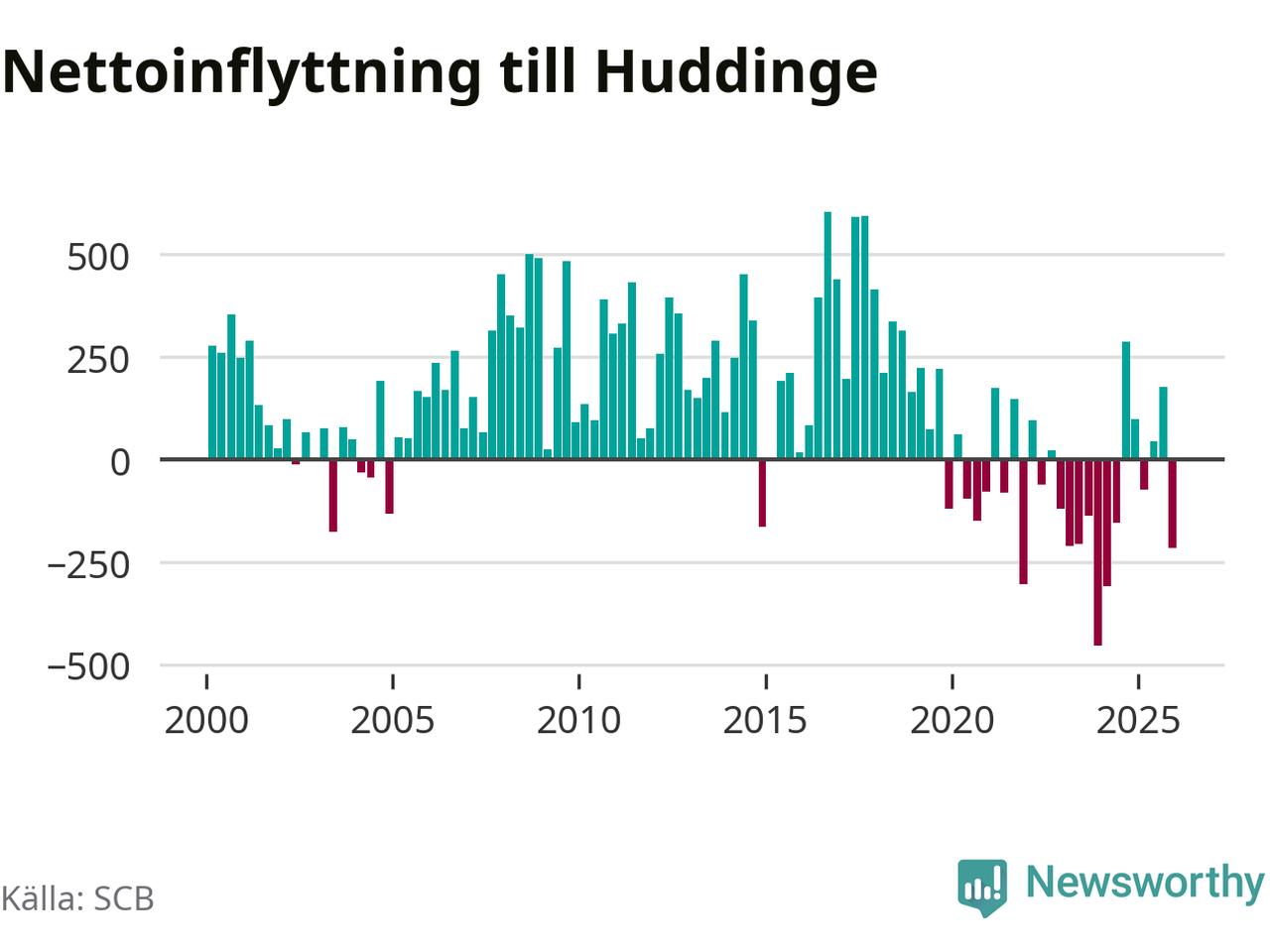 Under fjärde kvartalet 2025 flyttade 2 486 personer till kommunen medan 2 702 personer flyttade därifrån. Sedan seklets början har Huddinge oftast haft ett positivt flyttnetto.