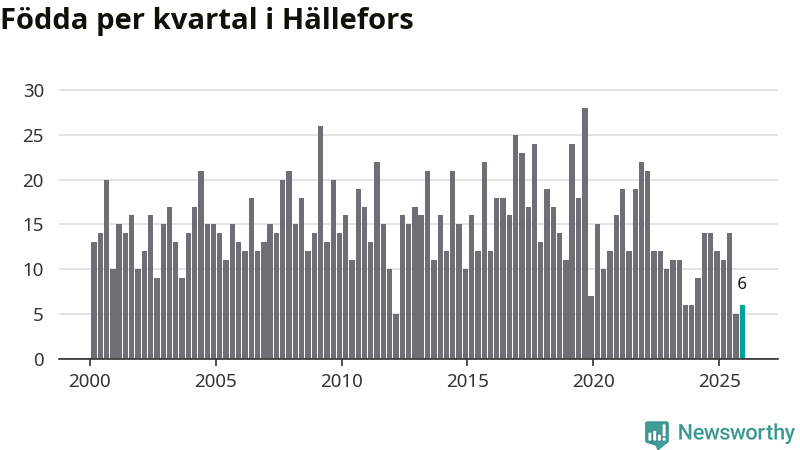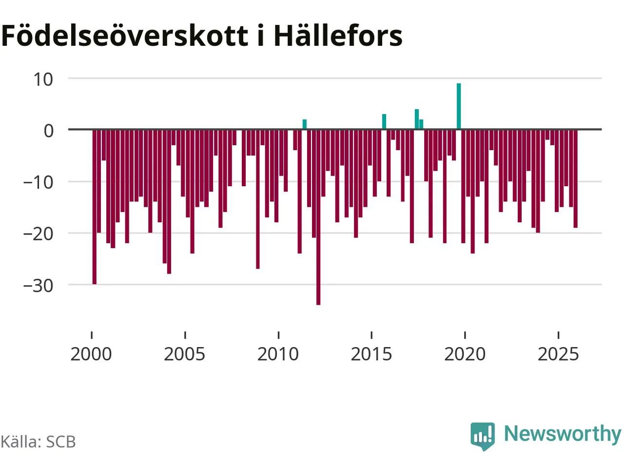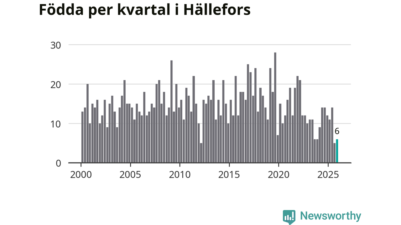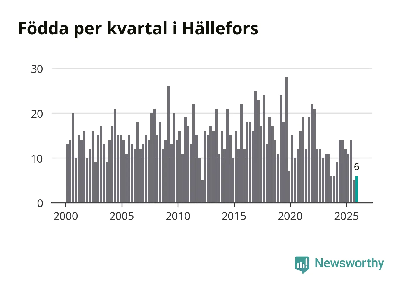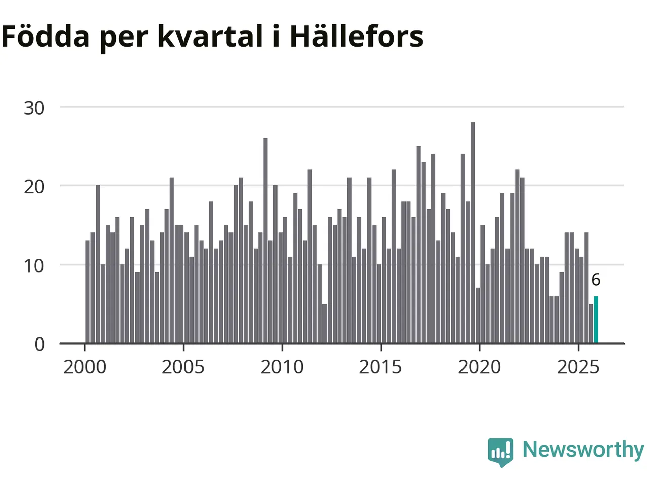 Enligt SCB:s siffror föddes sex barn i Hällefors under det senaste kvartalet. Samtidigt avled 25 personer. Hällefors hade alltså ett negativt födelsenetto, vilket kommunen historiskt sett nästan alltid har haft.