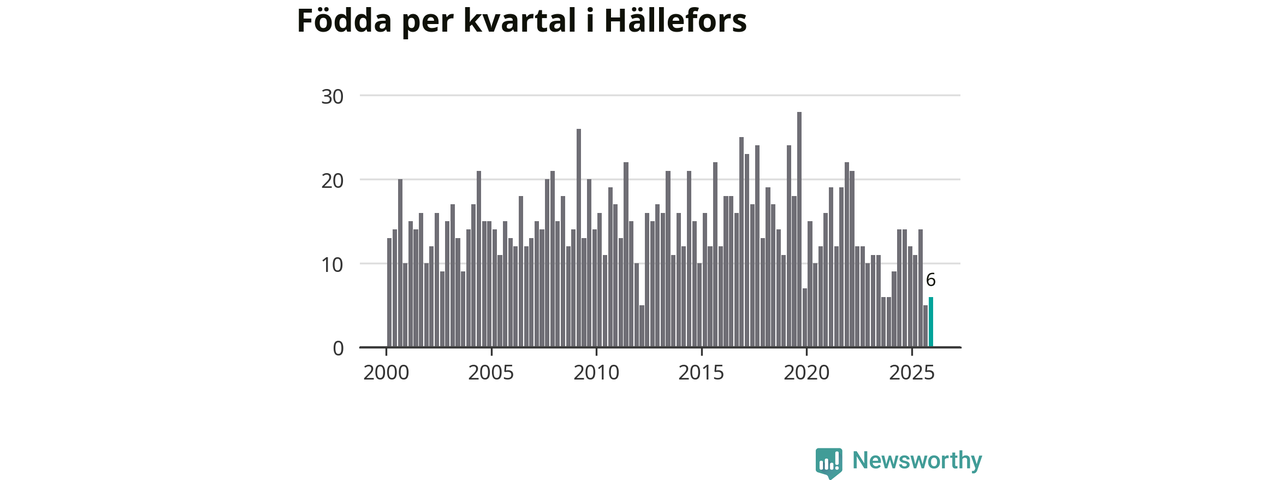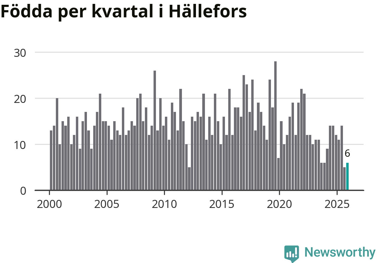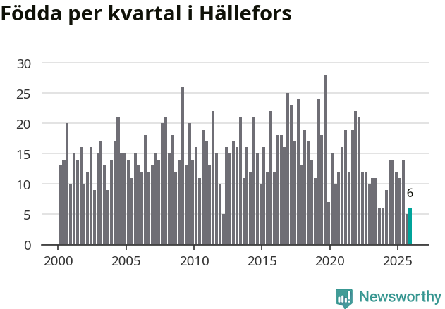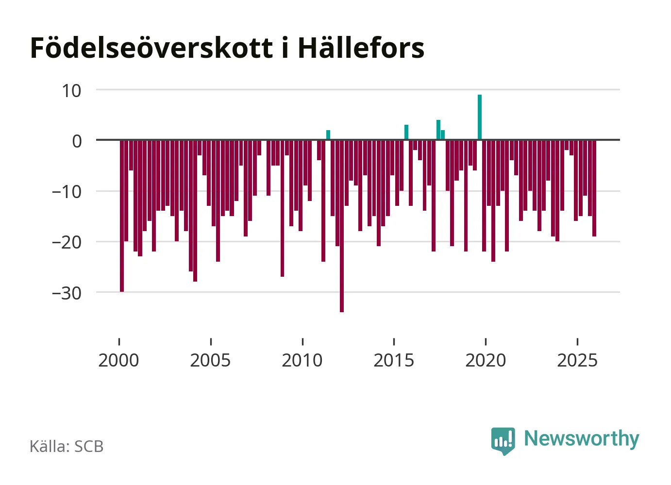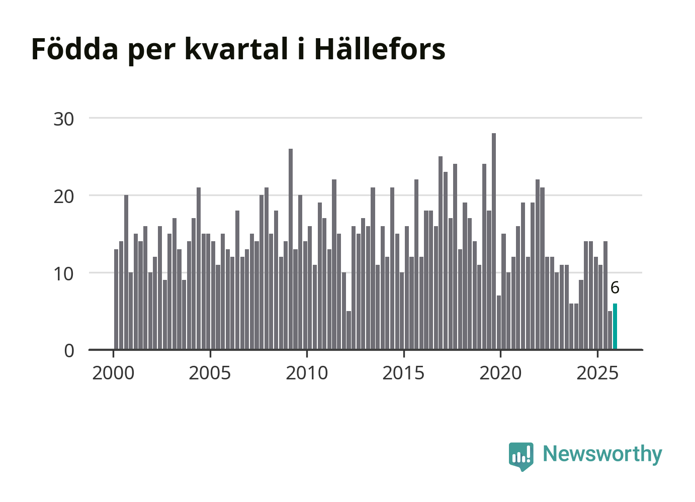 Enligt SCB:s siffror föddes sex barn i Hällefors under det senaste kvartalet. Samtidigt avled 25 personer. Hällefors hade alltså ett negativt födelsenetto, vilket kommunen historiskt sett nästan alltid har haft.